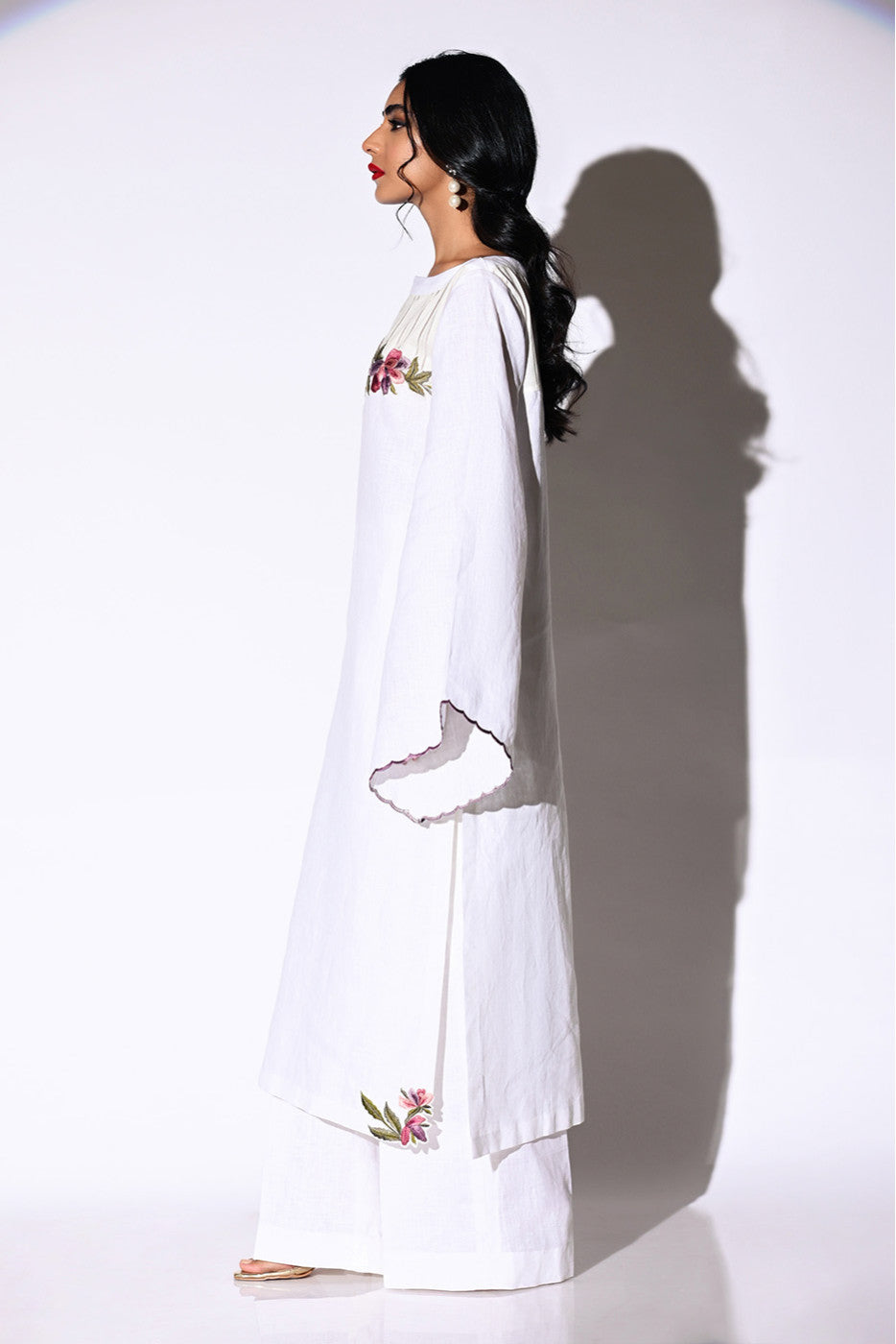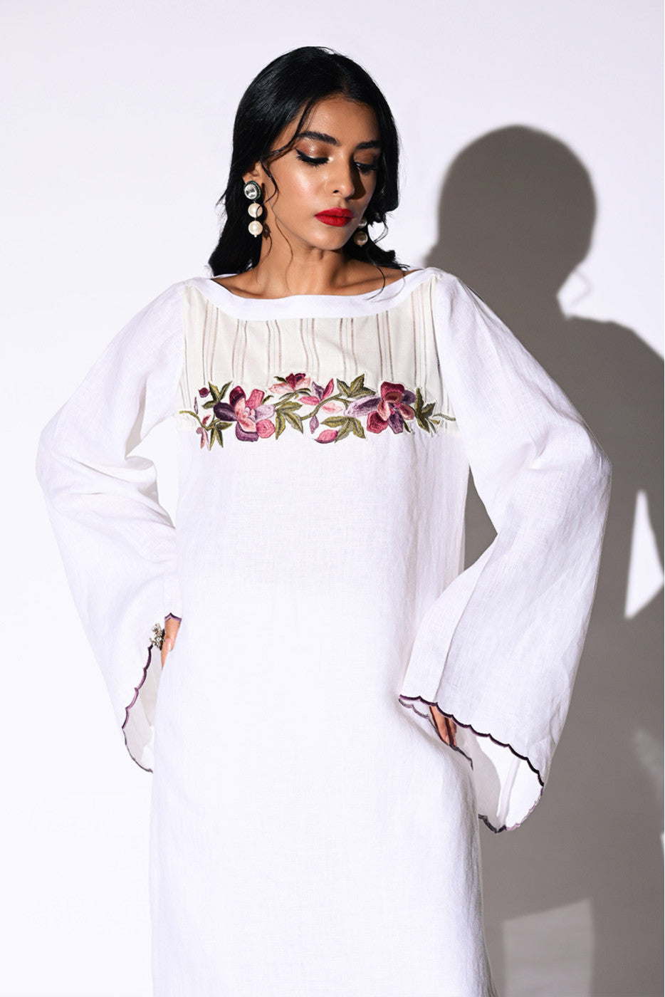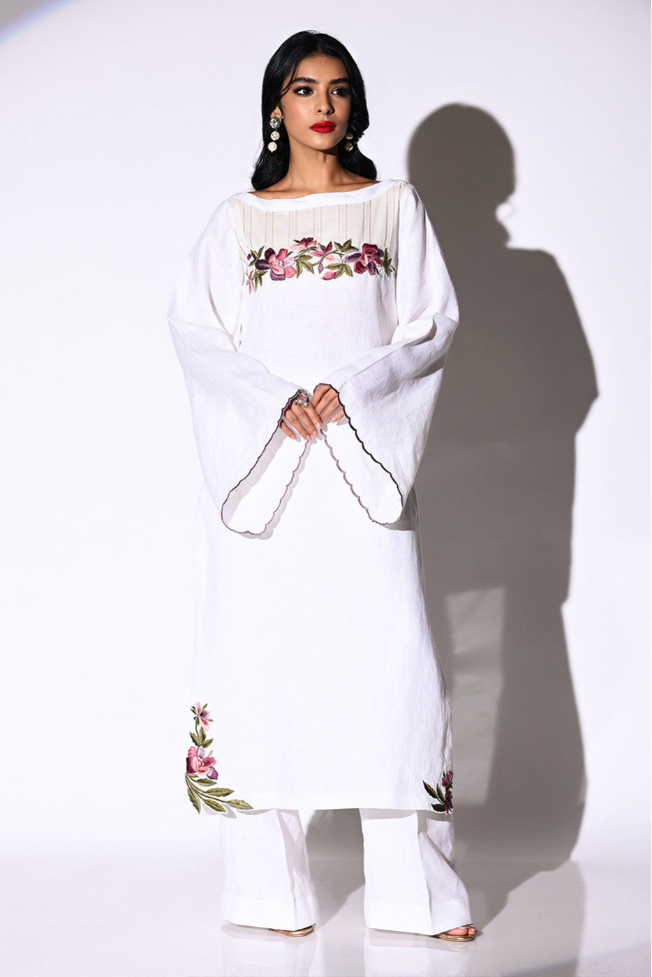 Enjoy the multi shade floral accent at the event. Straight long Irish linen shirt with oriental embroidery around the bodice and daman, paired with loose pants.