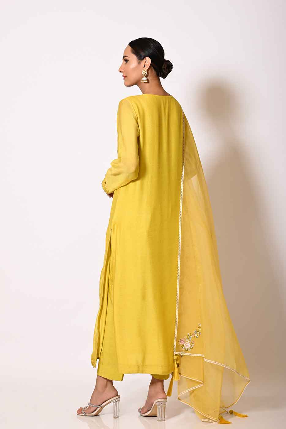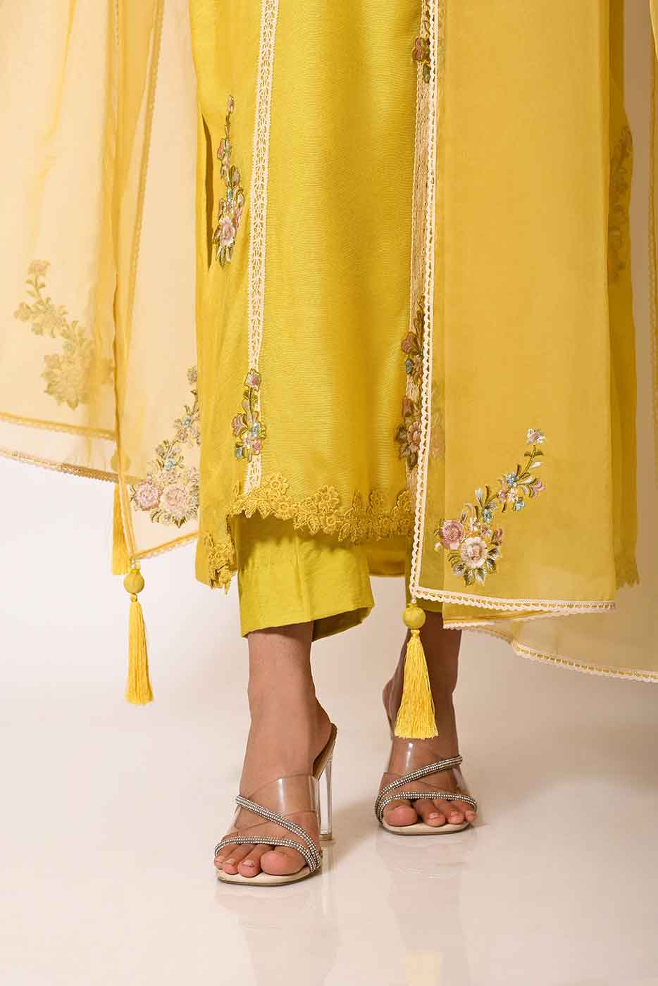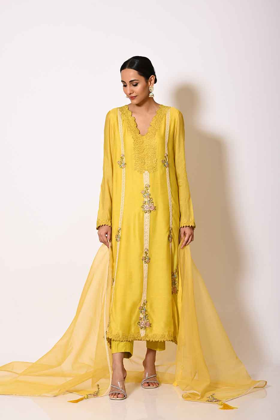 A beautiful cotton net shirt with lace detailing and embroidered motifs on front with lace appliquéd on neckline, daman and sleeves. You can pair it with straight pants to complete the look. It will be perfect for a daylight gathering.Model is wearing a small size.