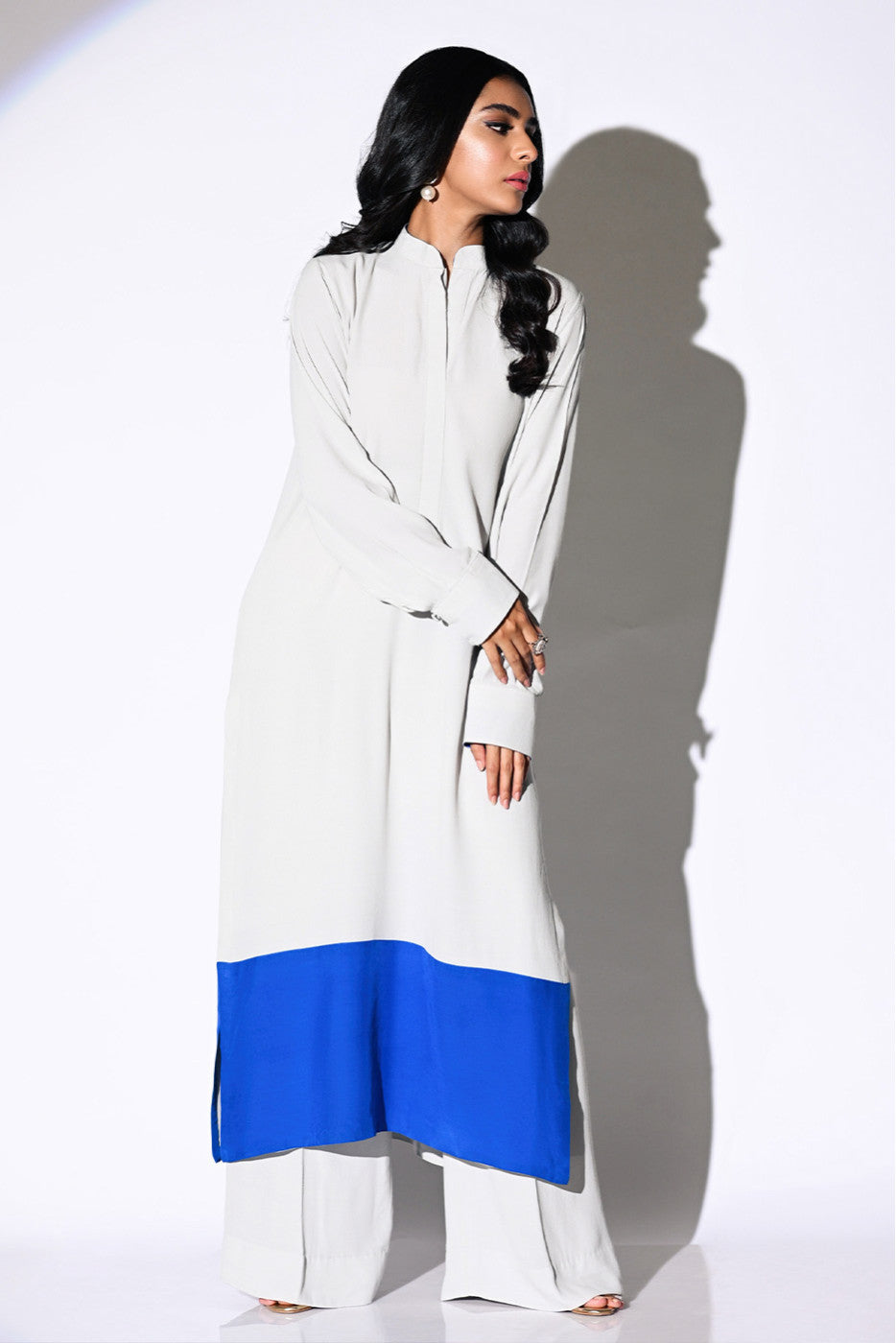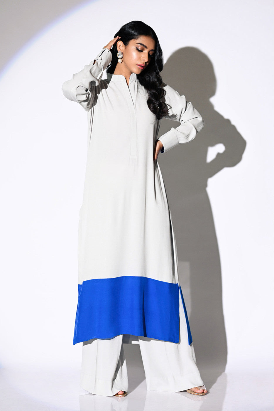 A perfect outfit for a daylight event or gathering. Crepe silk shirt with collar along with cuffed sleeves and loose pants. It is a 2 pc set.