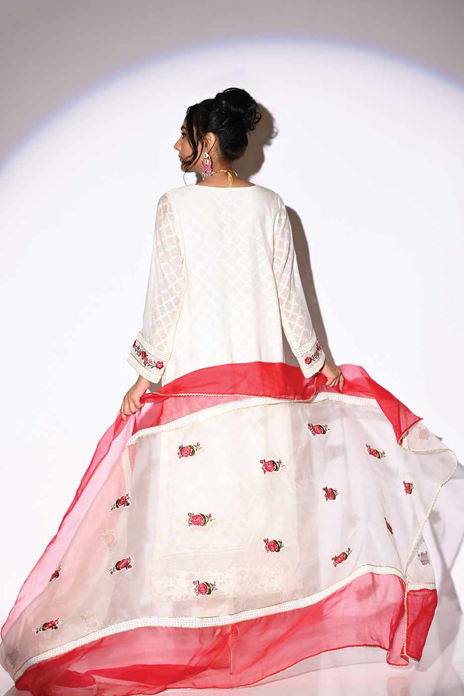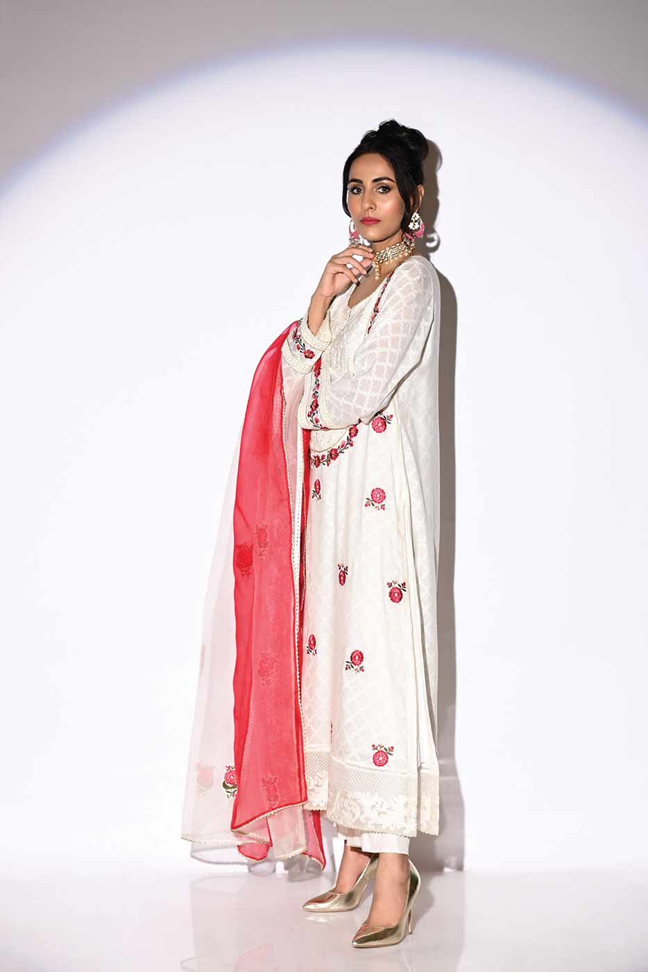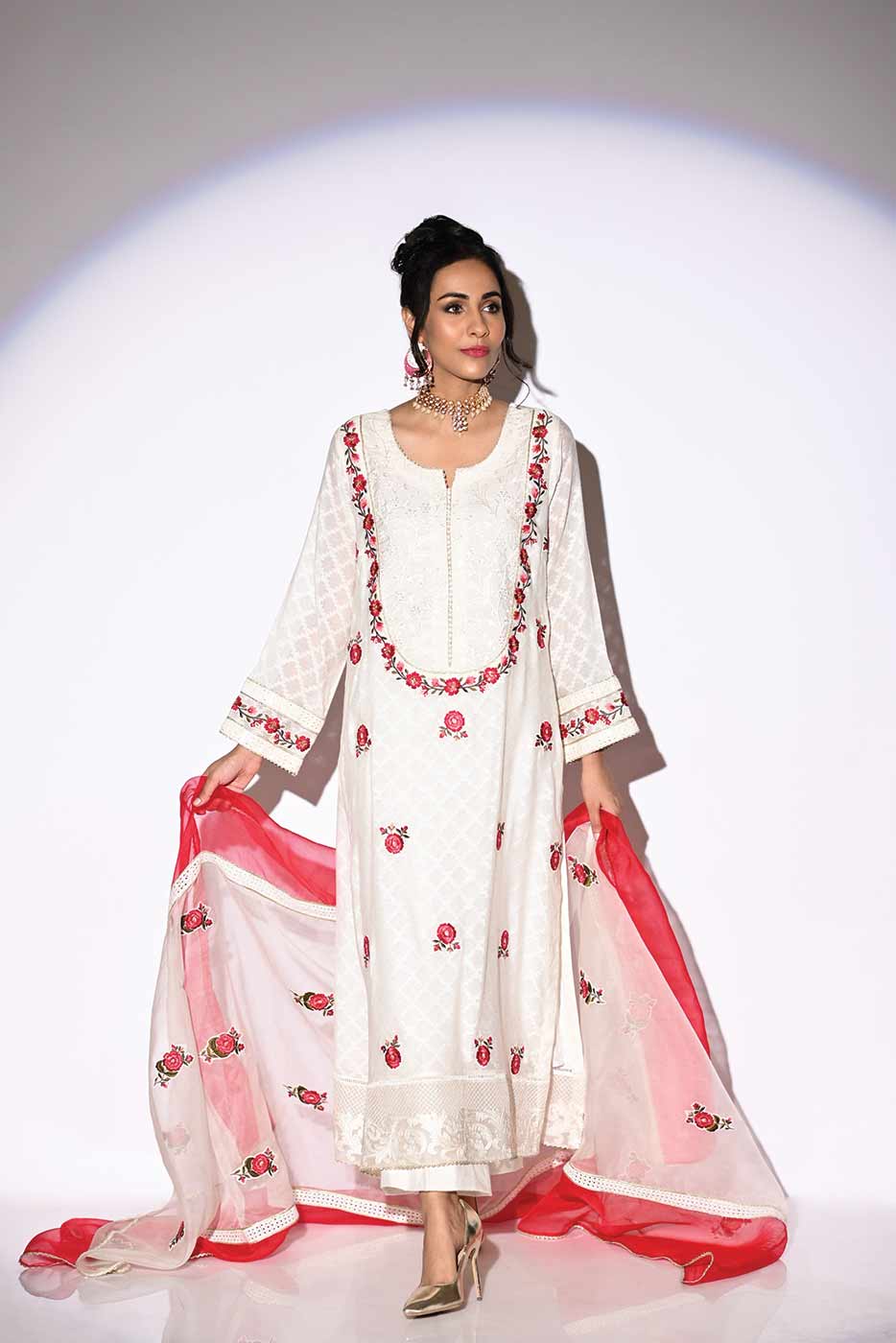 Cotton net shirt having chikan neckline with floral embroidery on front and sleeves, paired with wide trousers.