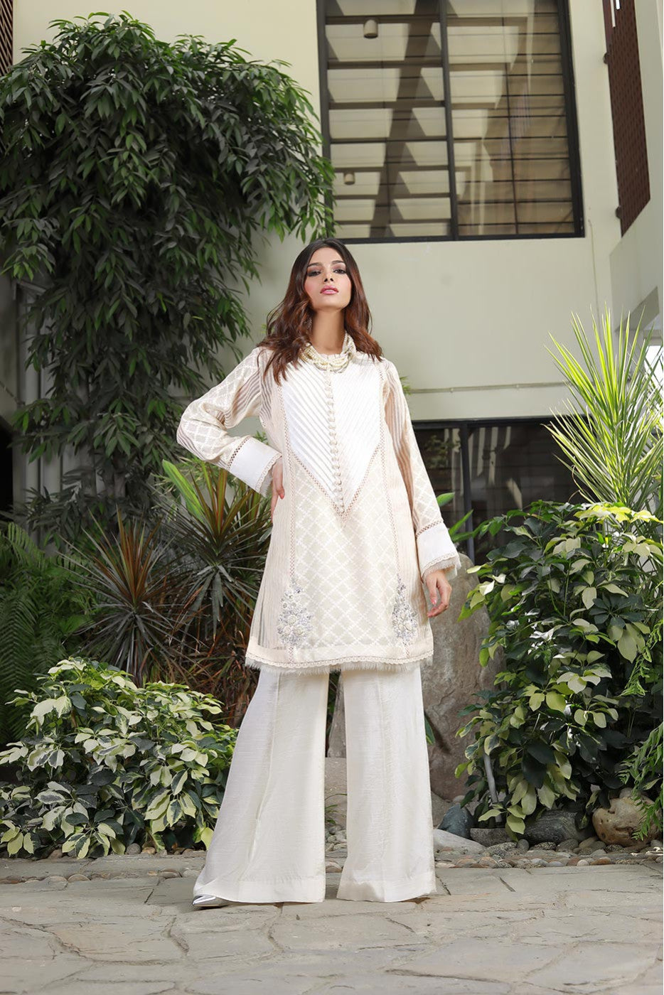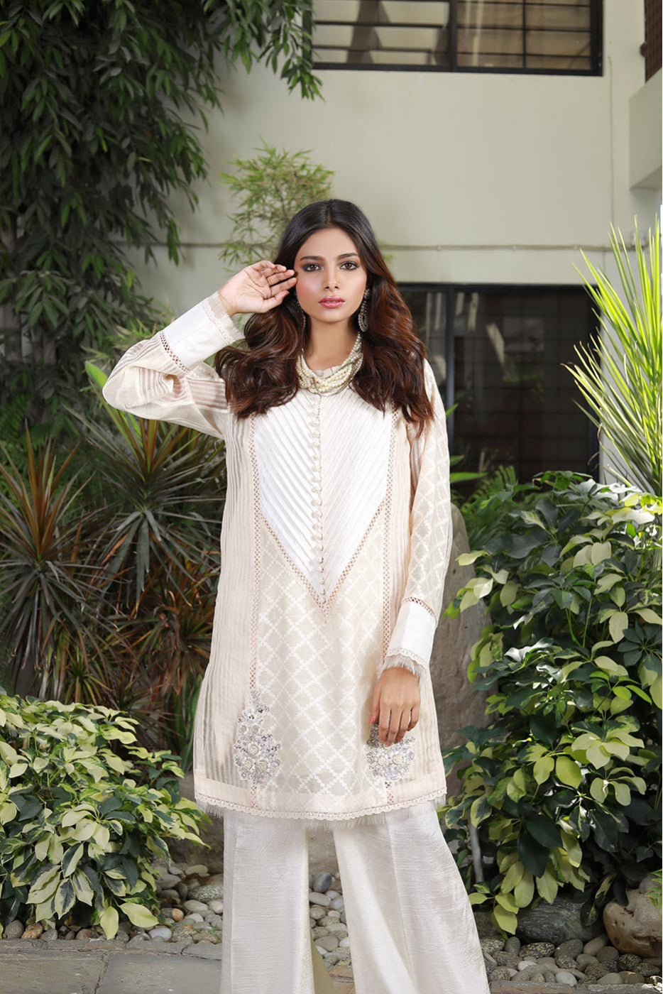 Ivory cotton net and organza detailed shirt with pleated neckline and hand embroidered motif on the daman and detailed sleeves. You can pair it with pants & dupatta.Care Instructions