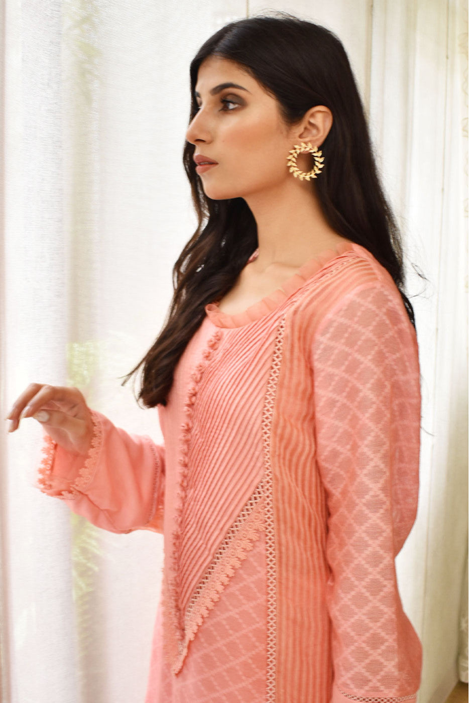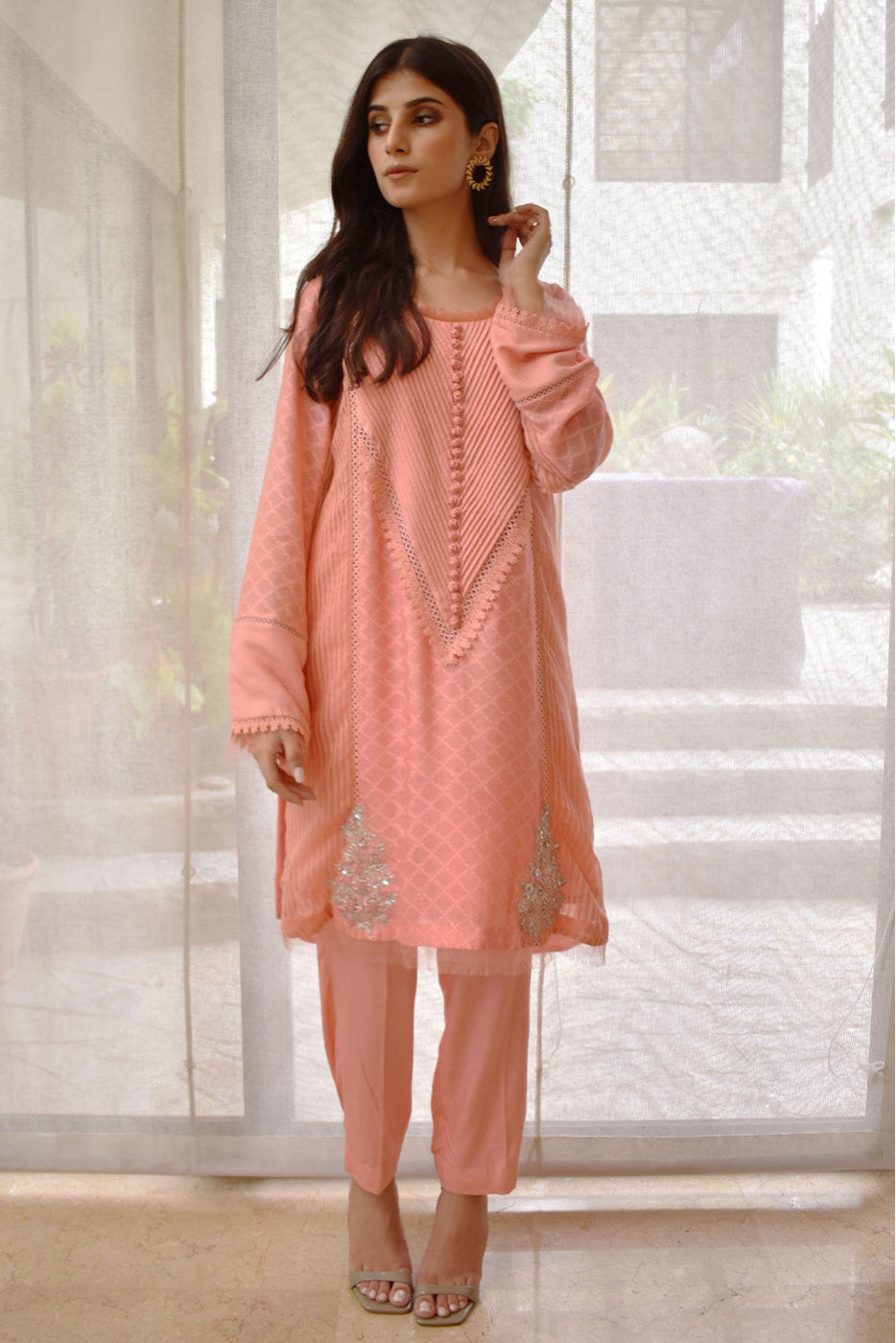 Cotton net and organza detailed shirt with pleated neckline and hand embroidered motif on the daman. Sleeves have a cuff detailed with lace and organza ruffles. You can pair it with the matching trousers.Care Instructions