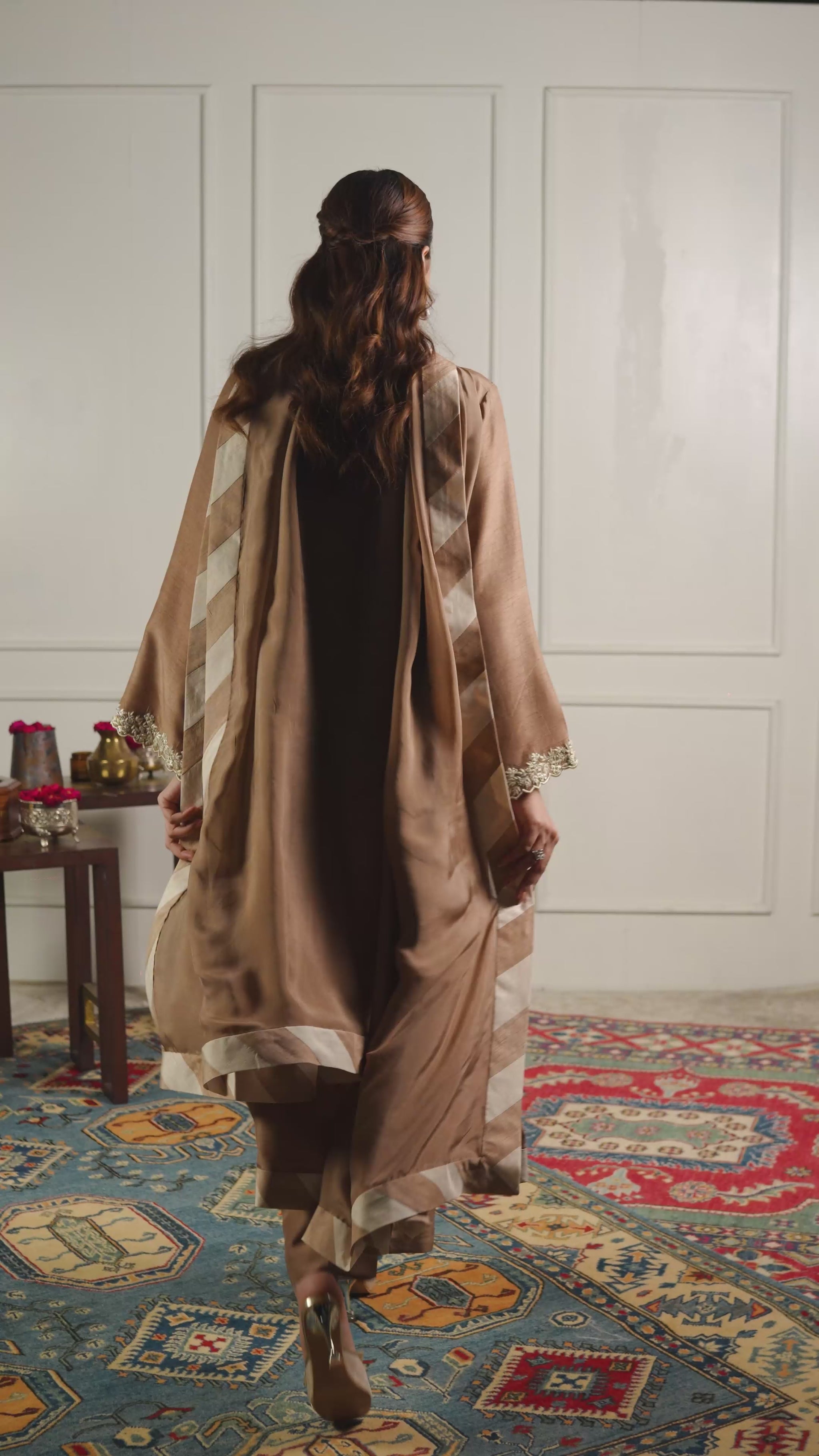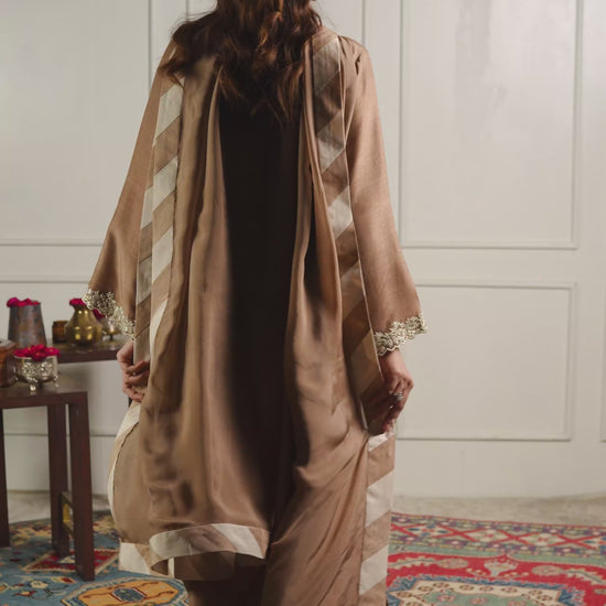 A warm brown silk kalidaar featuring delicate weave detailing on the neck yoke. The neckline shines with intricate floral hand embroidery and embellishments, complemented by lace panels and a Chatapati daman border. Sleeves are hand embellished for a subtle, festive charm. Paired with tailored pants and a four-sided Chattapati border dupatta.