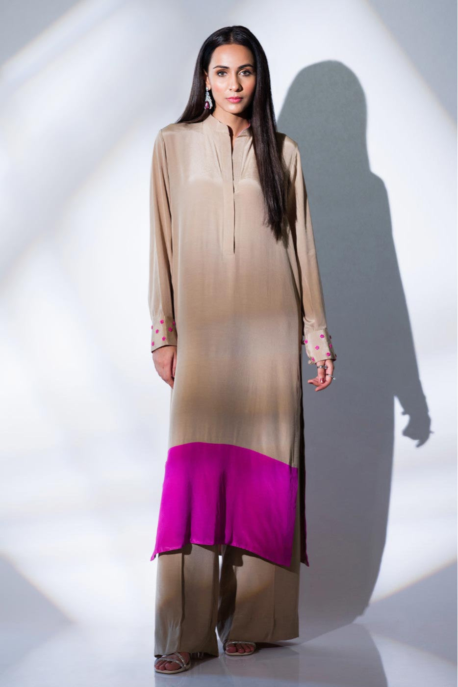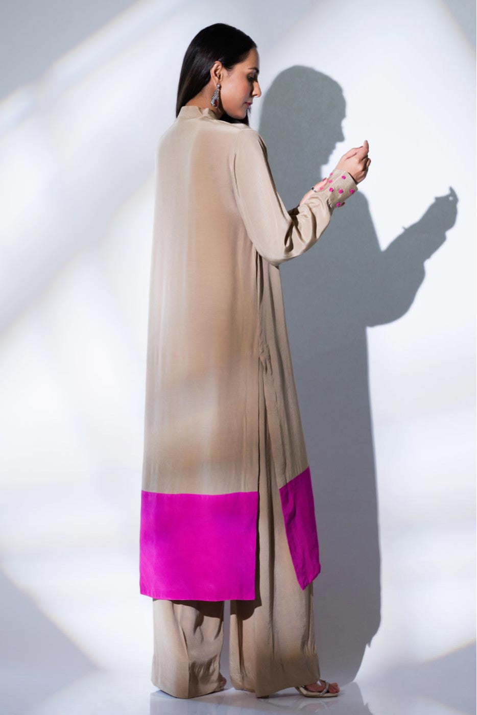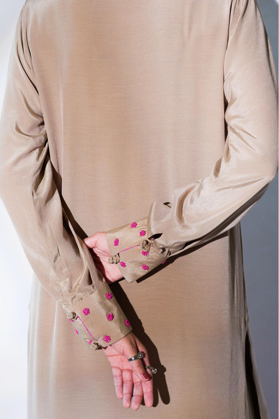 Crepe Silk shirt with collar and hand knotted resham flowers on the cuff and loose pants.