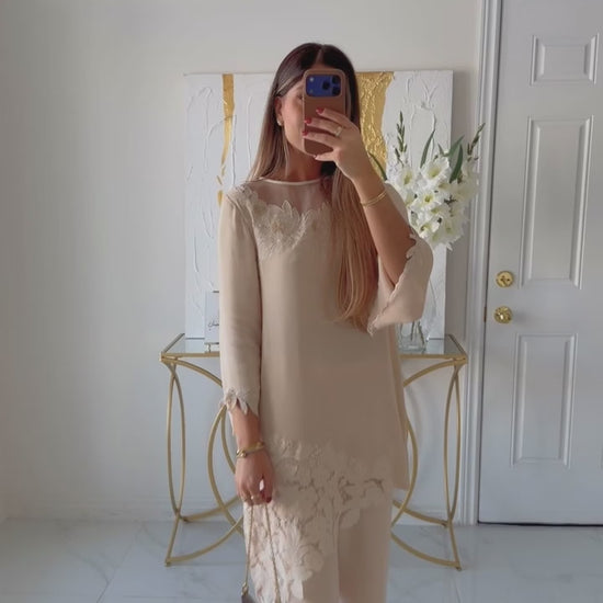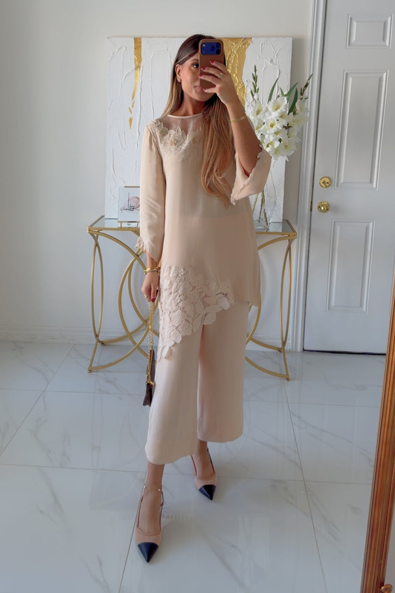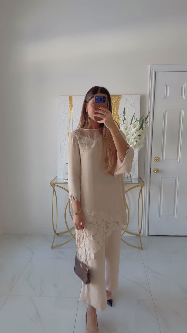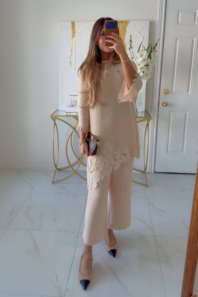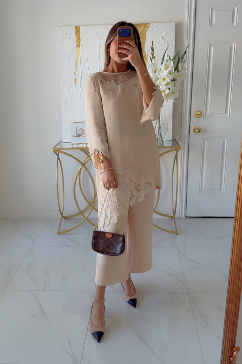 Glow softly in this powder peach semi formal set with a sheer organza neckline, delicately hand embellished on both front and back. The symmetrical hem features graceful schiffli detailing for a timeless, elegant touch. Scalloped sleeves are adorned with intricate hand embellishments, adding subtle charm. Paired with chic culottes, this look perfectly blends modern sophistication with dreamy femininity. A refined, eye catching ensemble that’s effortlessly beautiful for any special occasion.