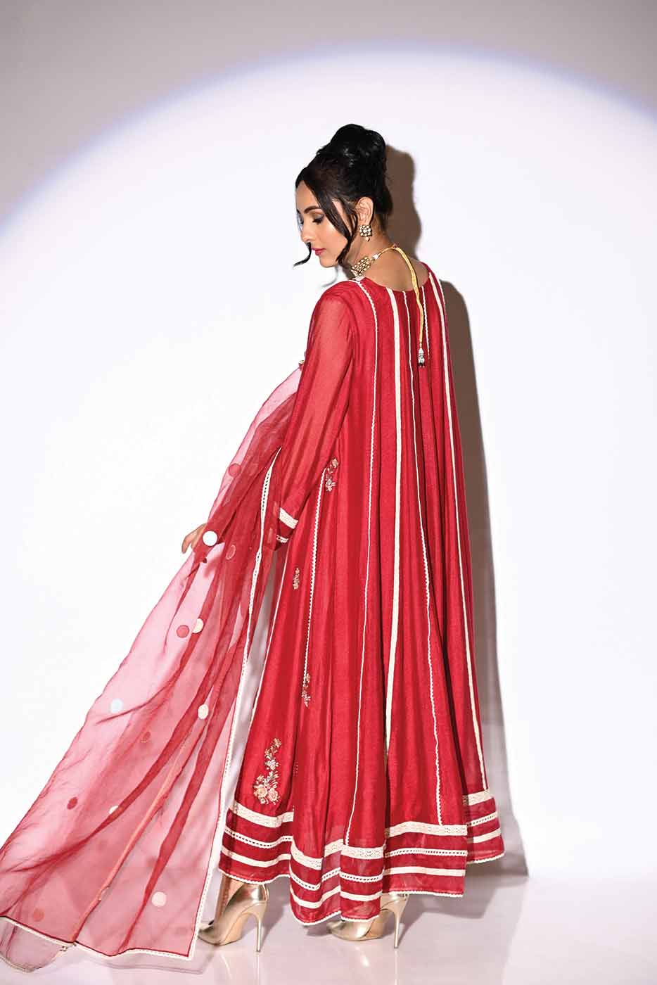 Kalidar pishwas on cotton net canvas having embroidery around the neck with crochet lace finished panels featuring intricate embroidered motifs. The border is intricately crafted using crochet laces. It is paired with straight pants.