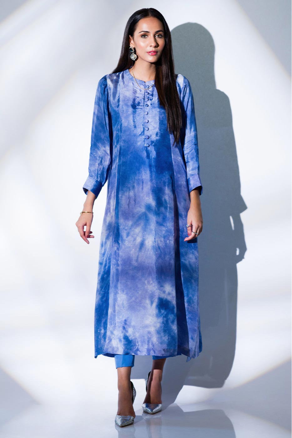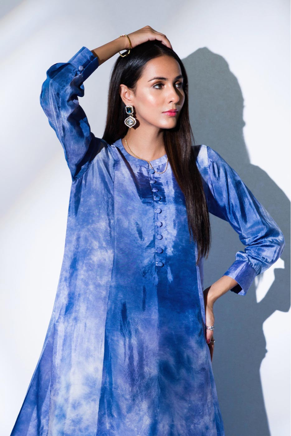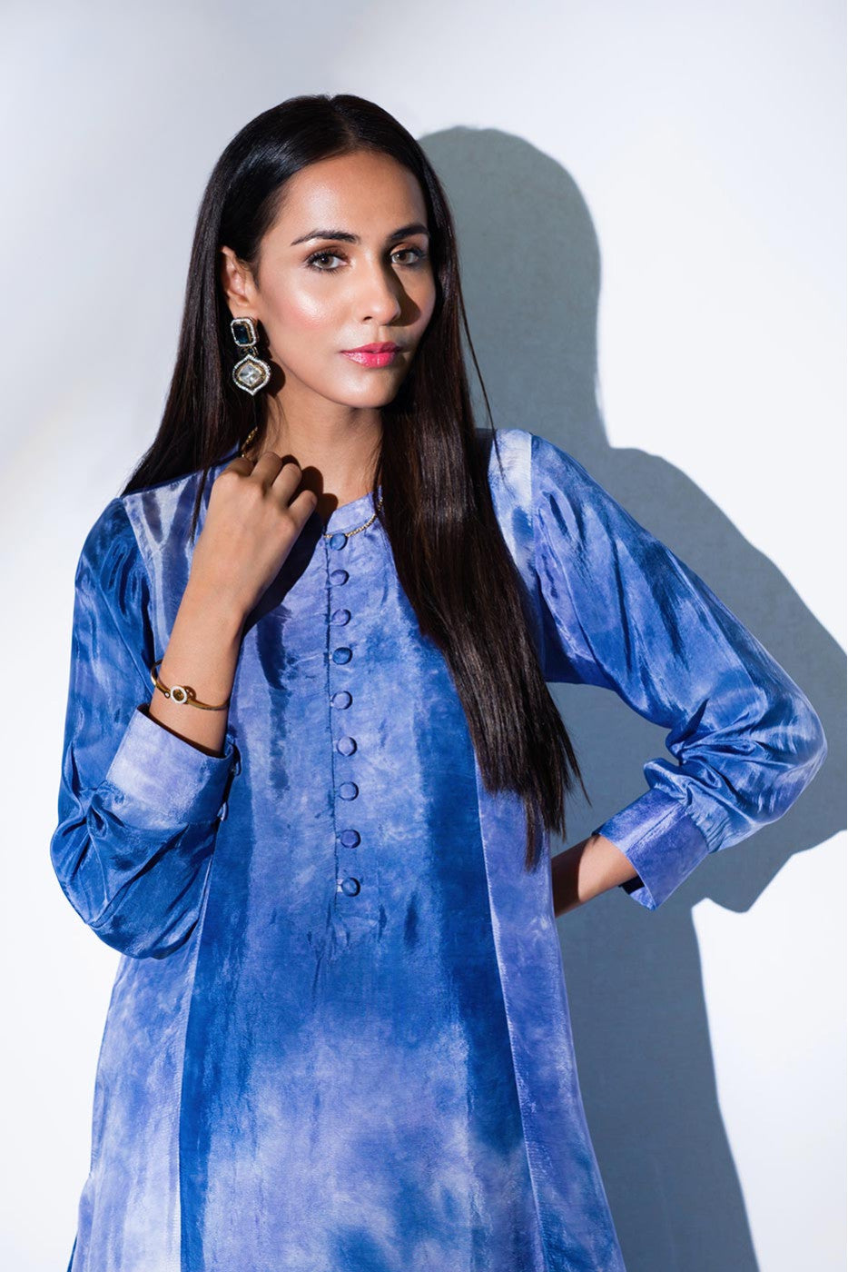 A-line panel silk kurta with loop buttons and cuff sleeves. Comes with a straight fitted pants. Model is wearing size small.
