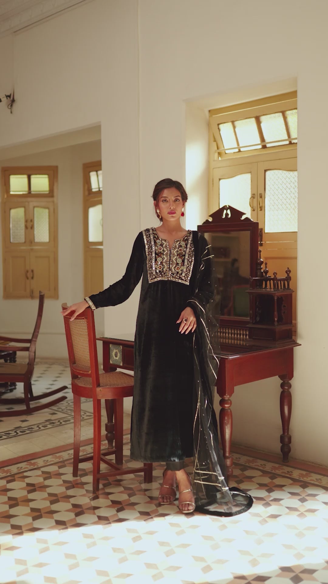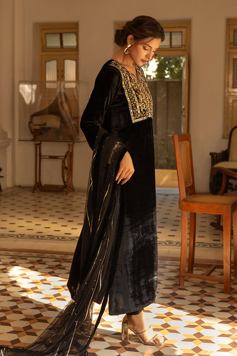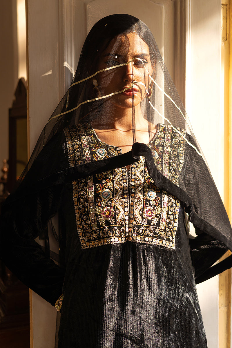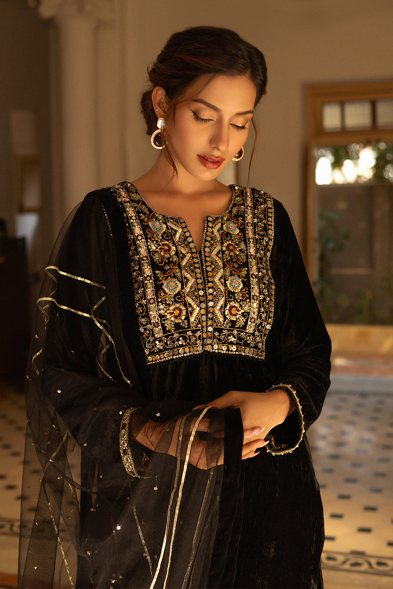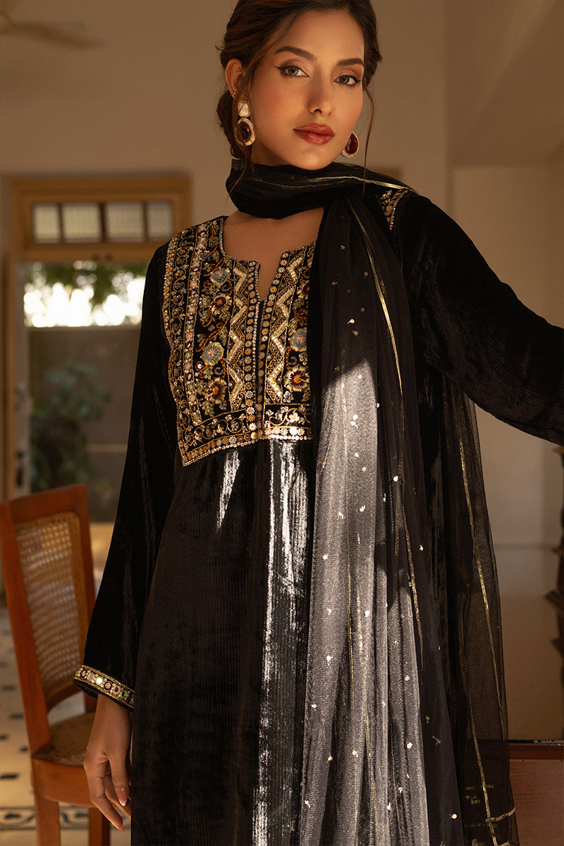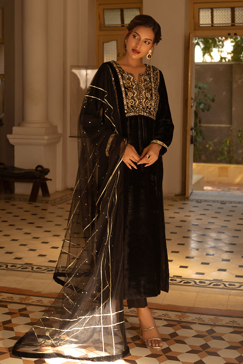 A stunning velvet black kurta featuring an intricately embroidered gala pati. Paired seamlessly with korean silk pants, this outfit is a celebration of elegance and sophistication. The timeless charm of the "Anaara" ensemble is perfect for making a statement at any special occasion. Includes shirt trousers and net duppatta.Care Instructions