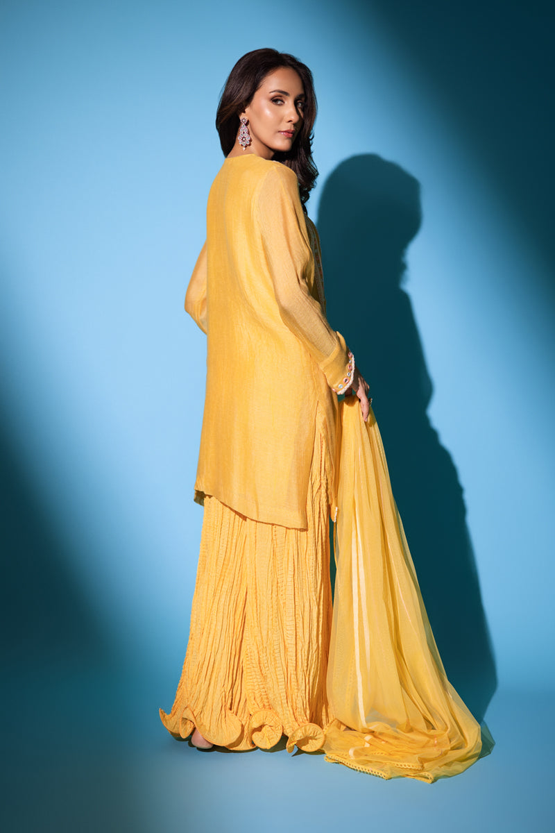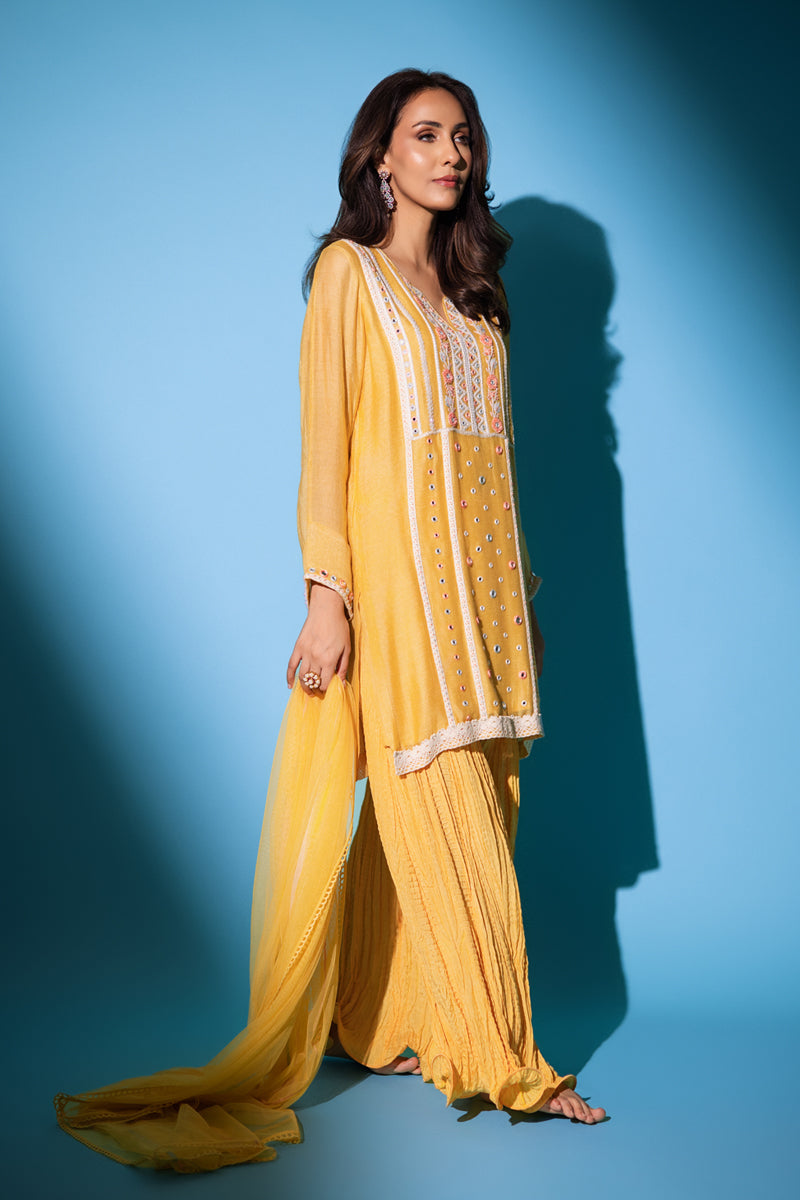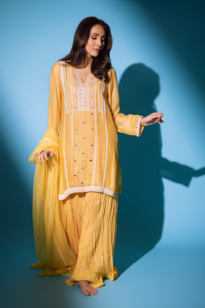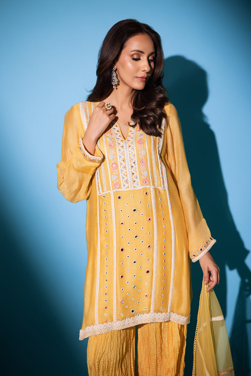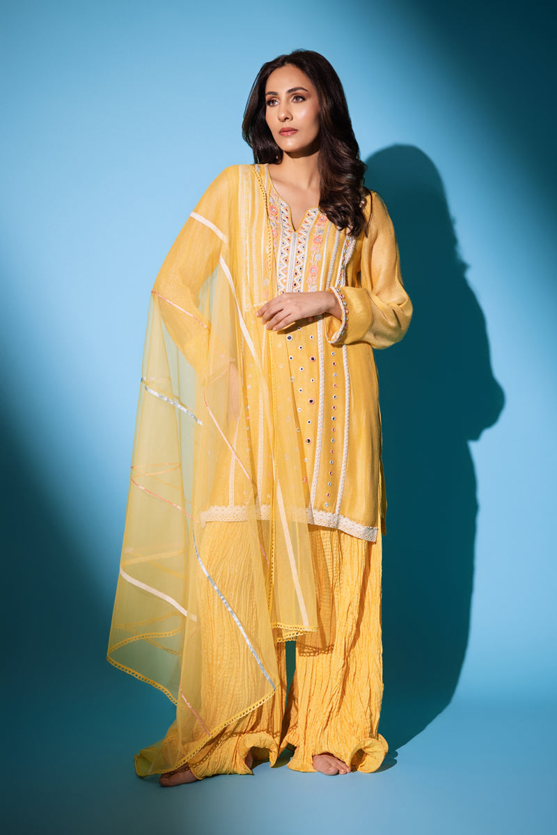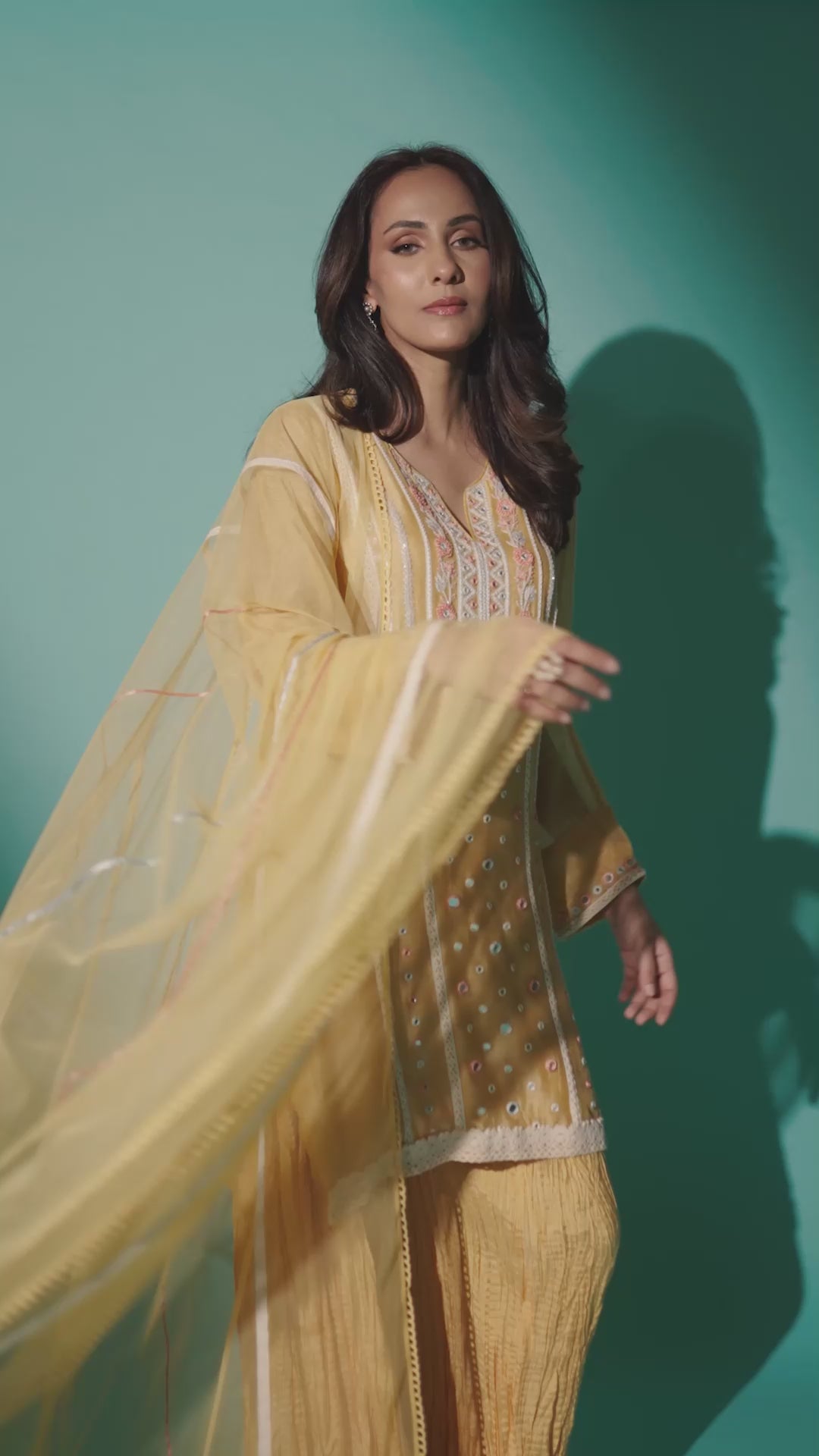 A cotton net kurta intricately hand-embroidered with vibrant resham and shimmering mirror work. Style it with your choice of crushed or straight pants for a versatile and elegant look.