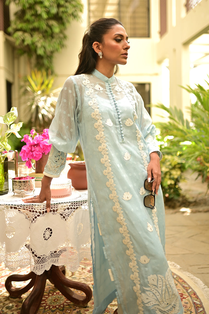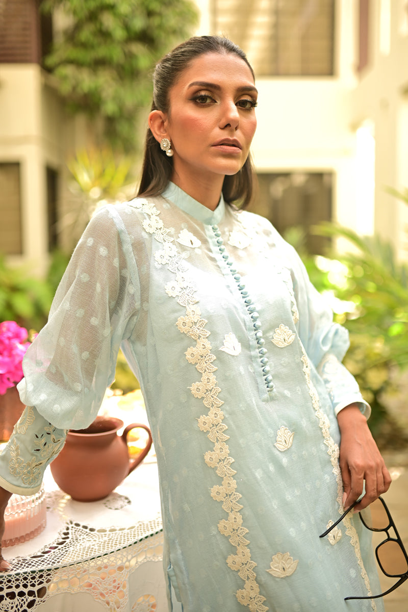 An effortless summer statement in pastel blue. Crafted from airy cotton net, this ensemble features intricate lace detailing and finely embroidered cuffs. The look is completed with cutwork-embroidered trousers, blending timeless elegance with seasonal ease.