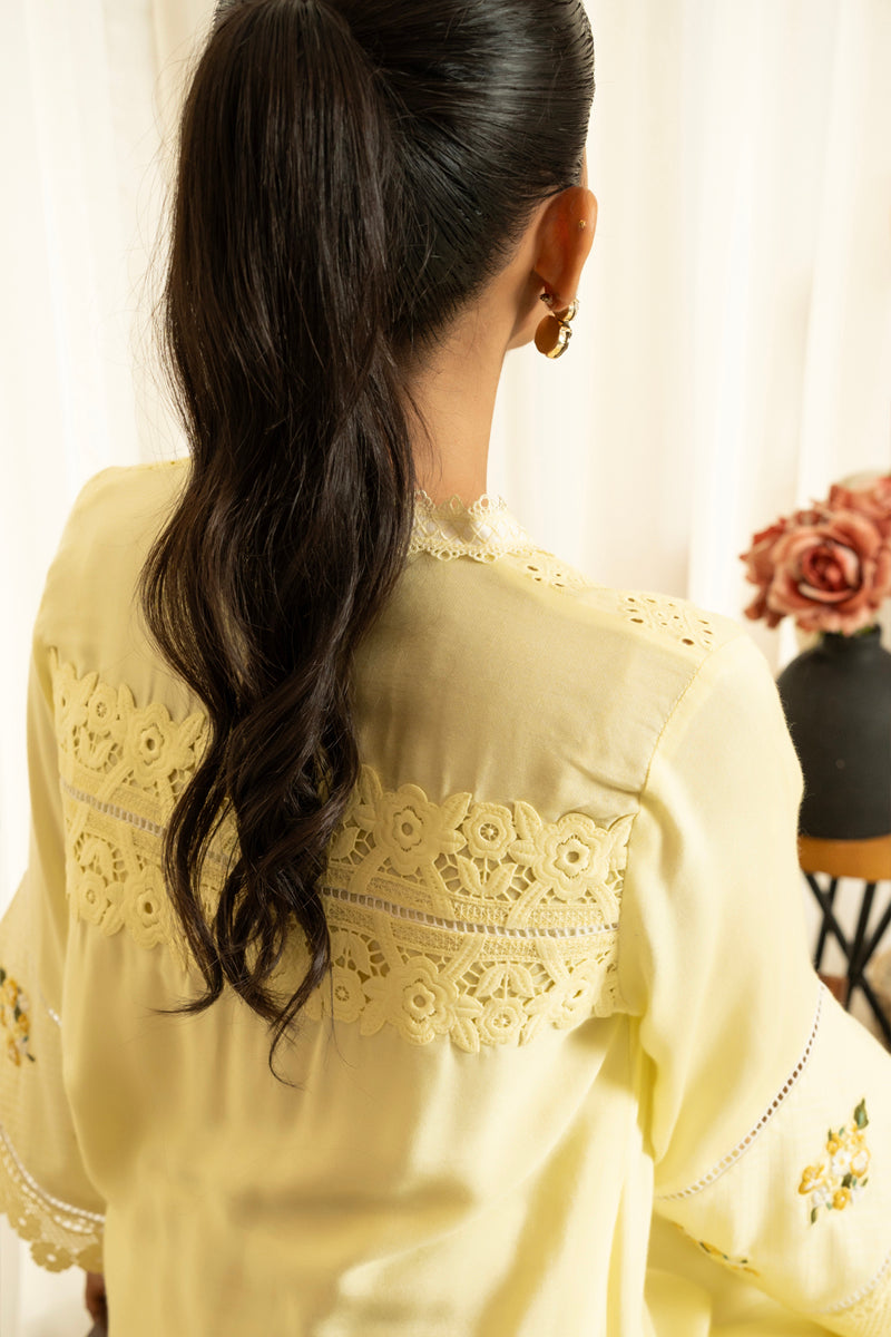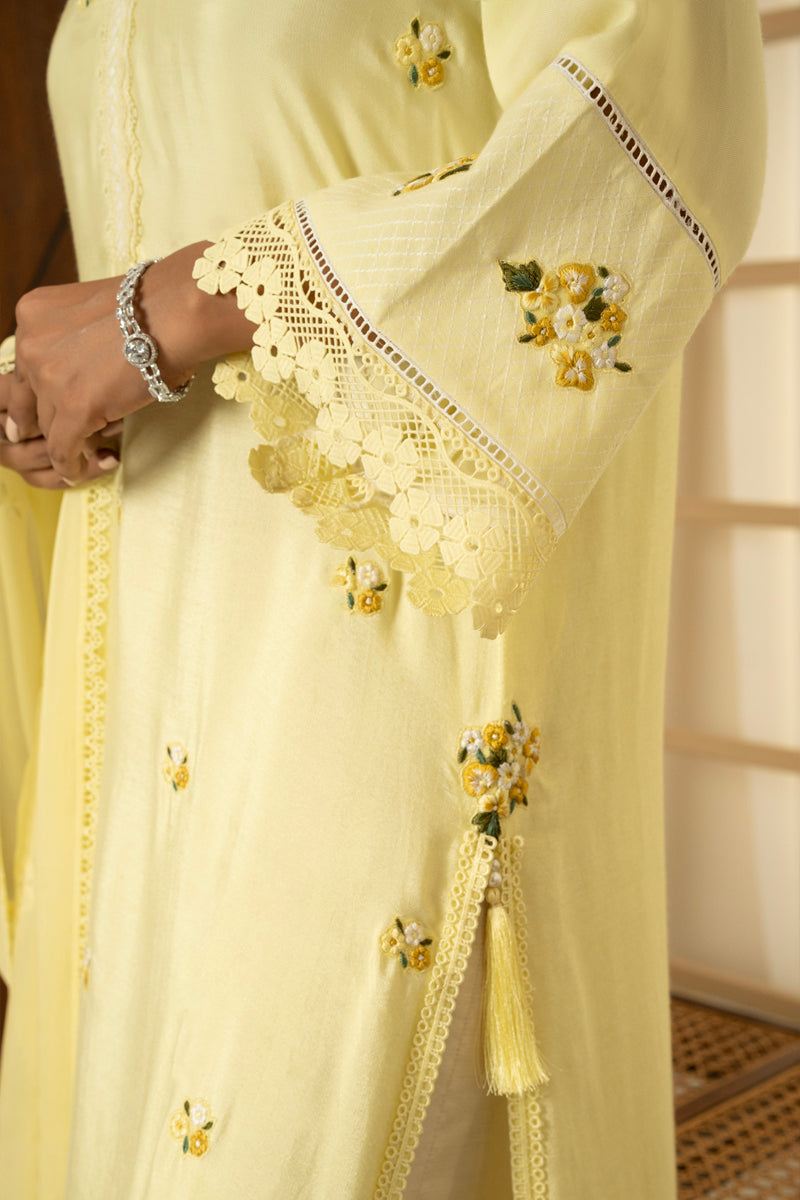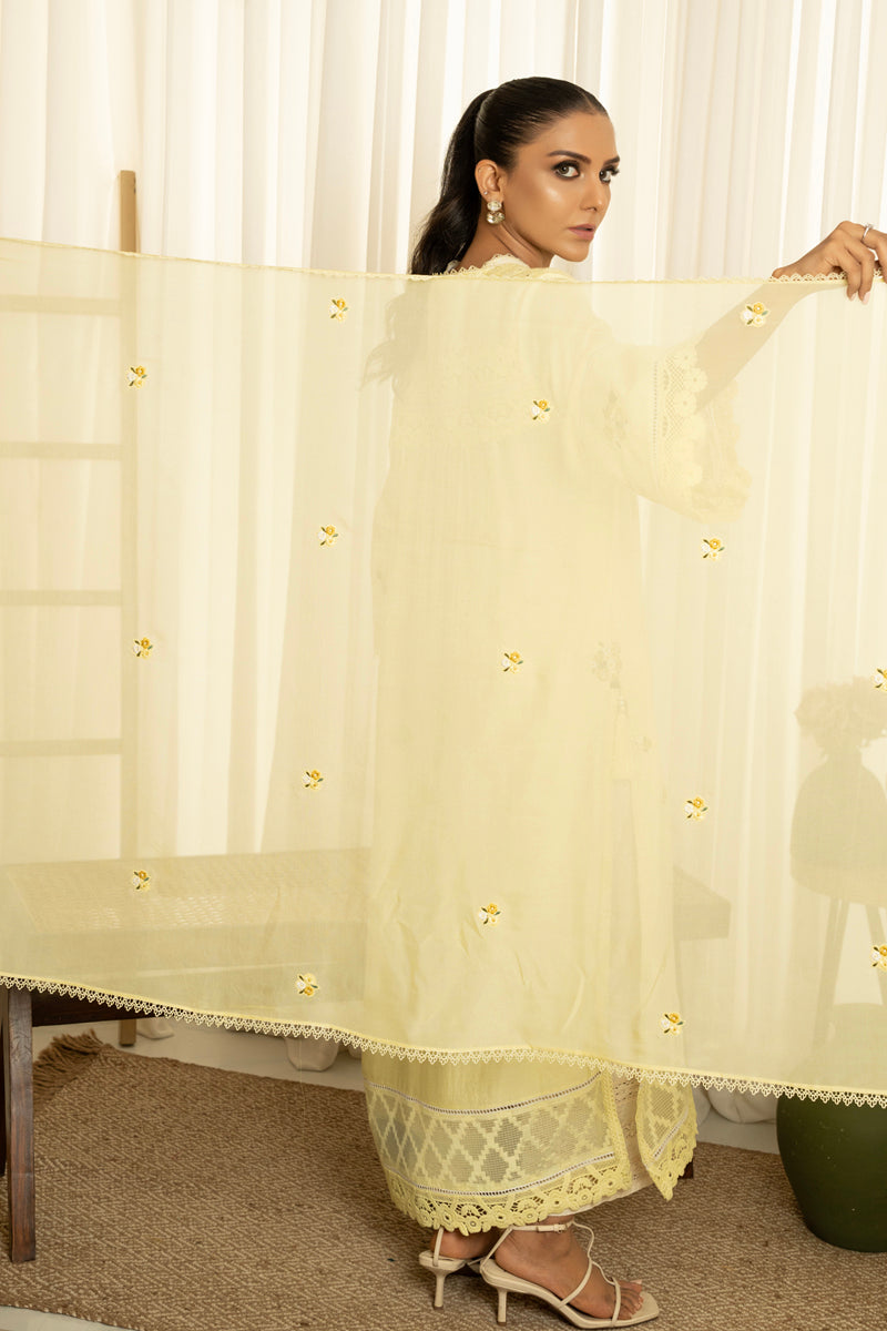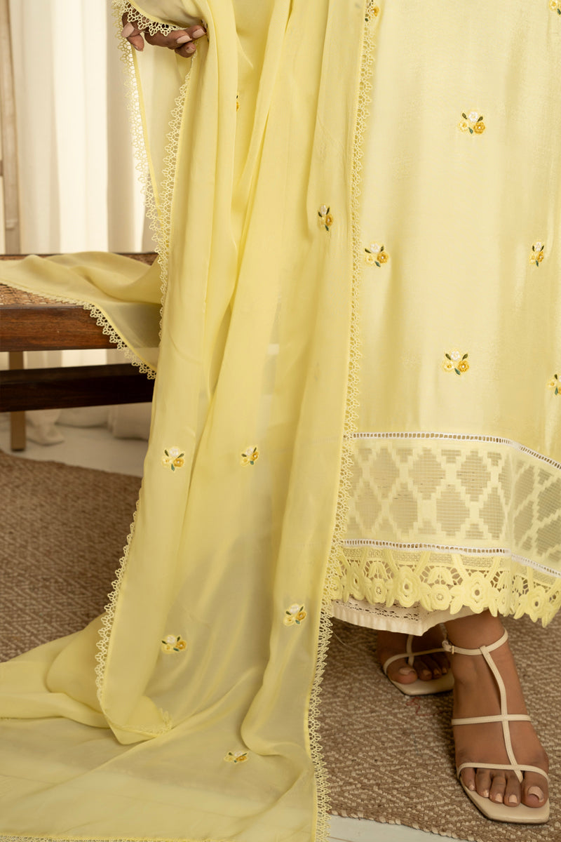 Discover elegance with this charming yellow cotton net kurta, adorned with delicate floral bunches and intricate lace detailing throughout. Perfect for adding a touch of grace to any occasion.