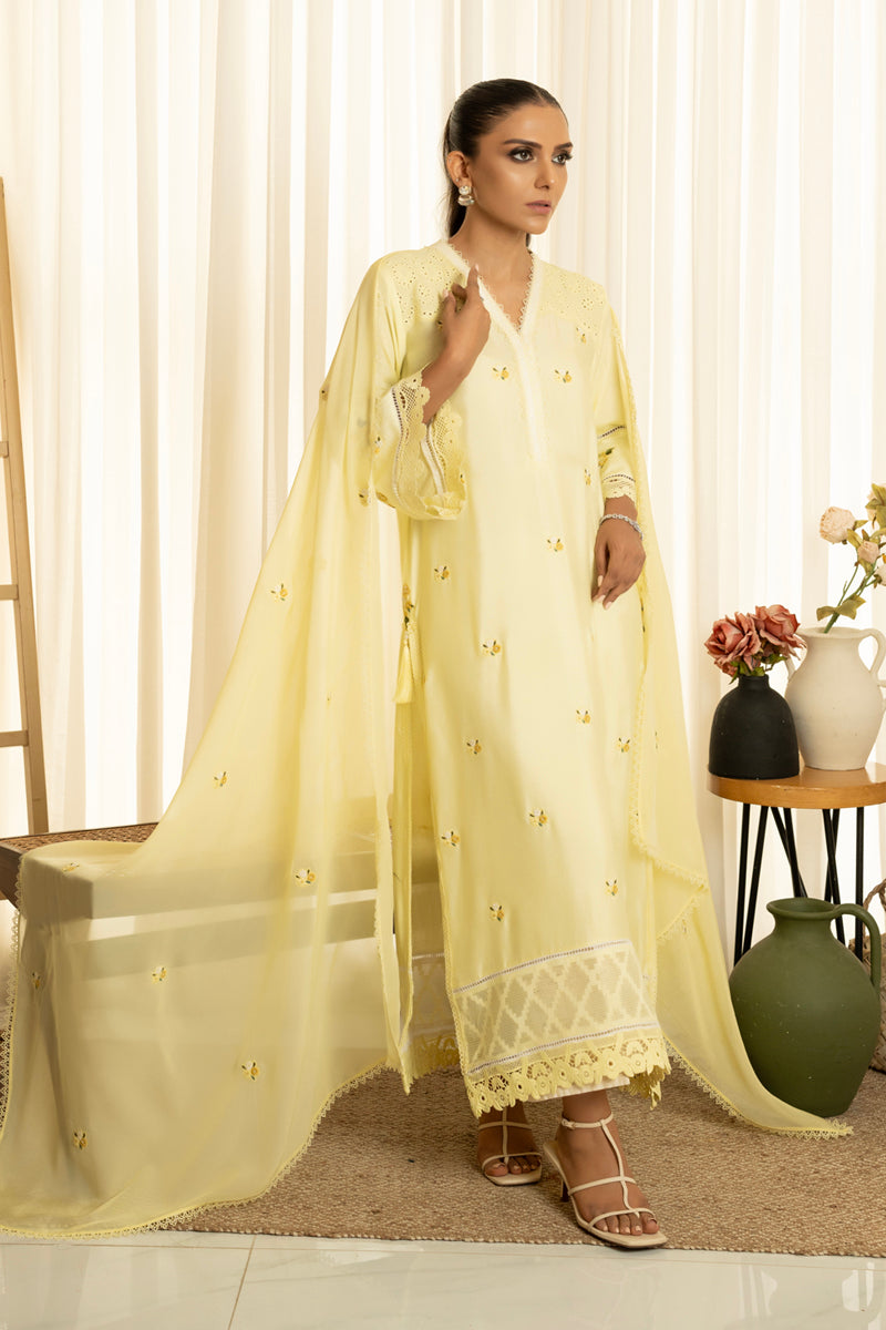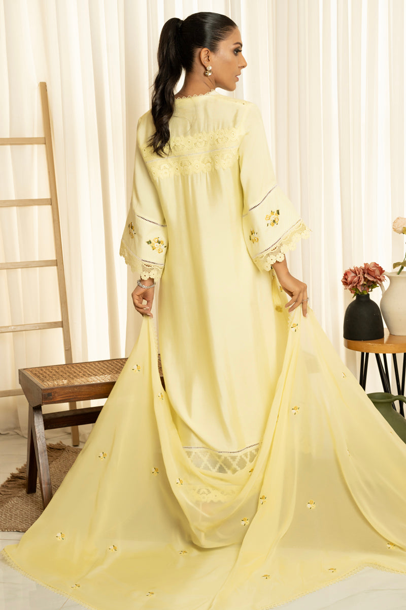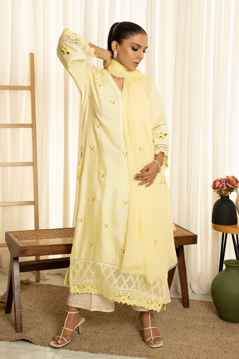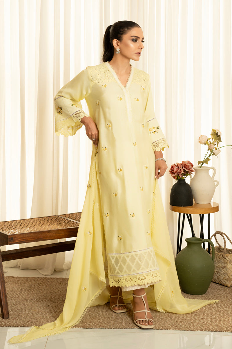 Discover elegance with this charming yellow cotton net kurta, adorned with delicate floral bunches and intricate lace detailing throughout. Perfect for adding a touch of grace to any occasion.