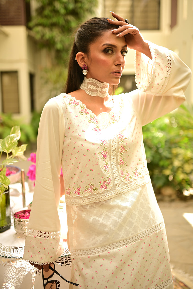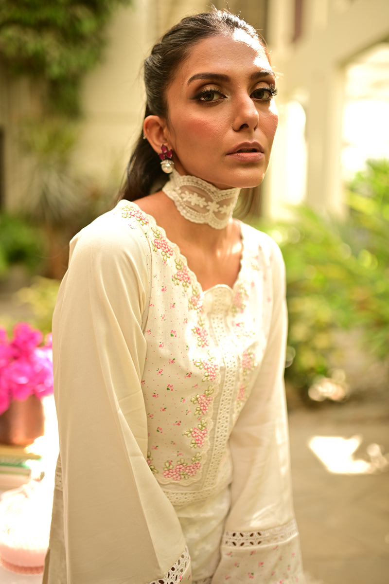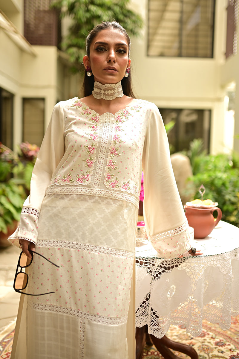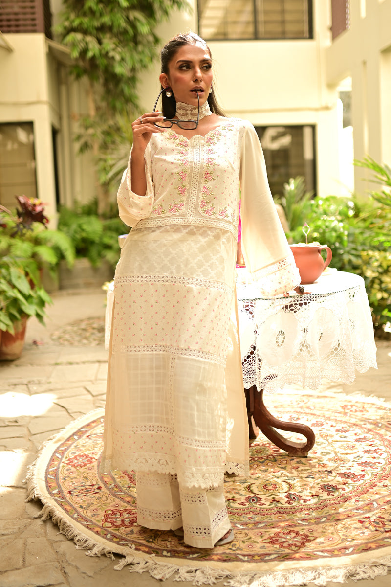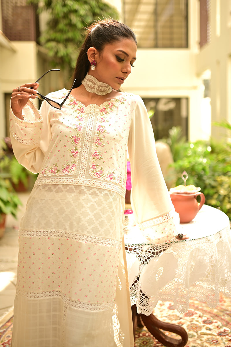 Soft, romantic, and effortlessly elegant. Cherry Bloosom features delicate floral embroidery on premium blush lawn, finished with intricate lace details. Paired with matching trousers and a dupatta, this 3-piece set is perfect for summer brunches or intimate gatherings.