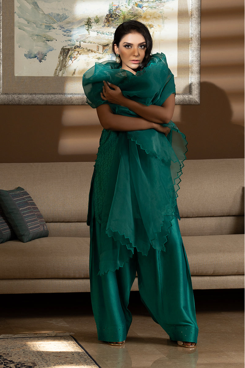 Farishta set in emerald green is a masterpiece of elegance, woven from luxurious sheesha silk. Its shirt and shalwar are delicately embroidered with self-color threads, creating a subtle yet stunning texture that catches the light. Perfect for those who seek to make a statement.