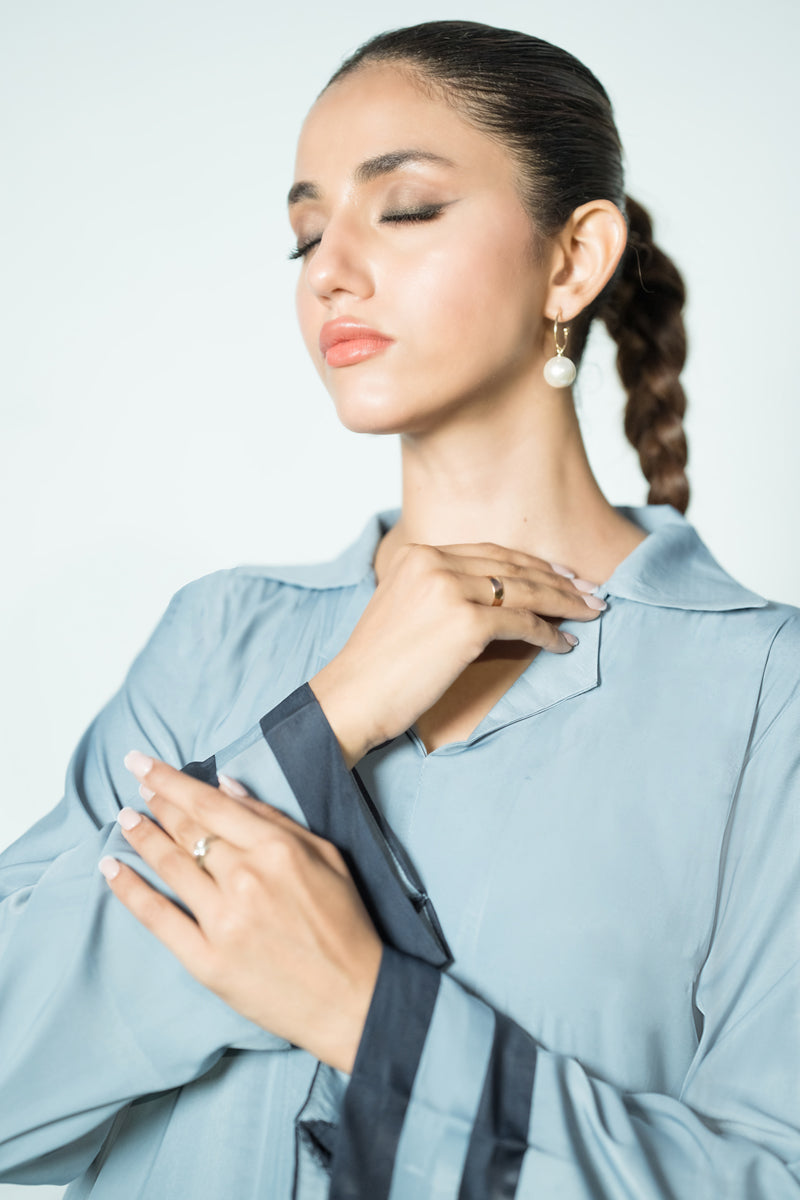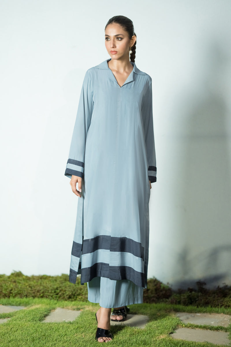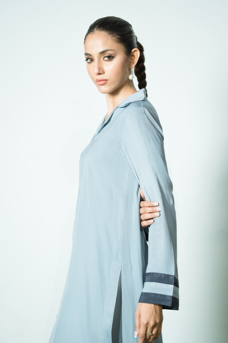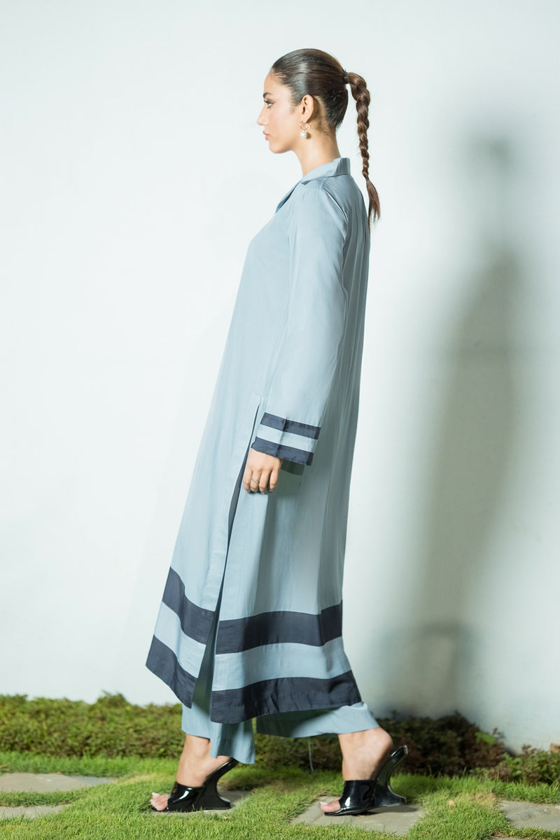 This sophisticated blue pret with long shirt featuring a notch collar, striped sleeves, hem details, and a front slit, paired with culottes in crepe fabric.