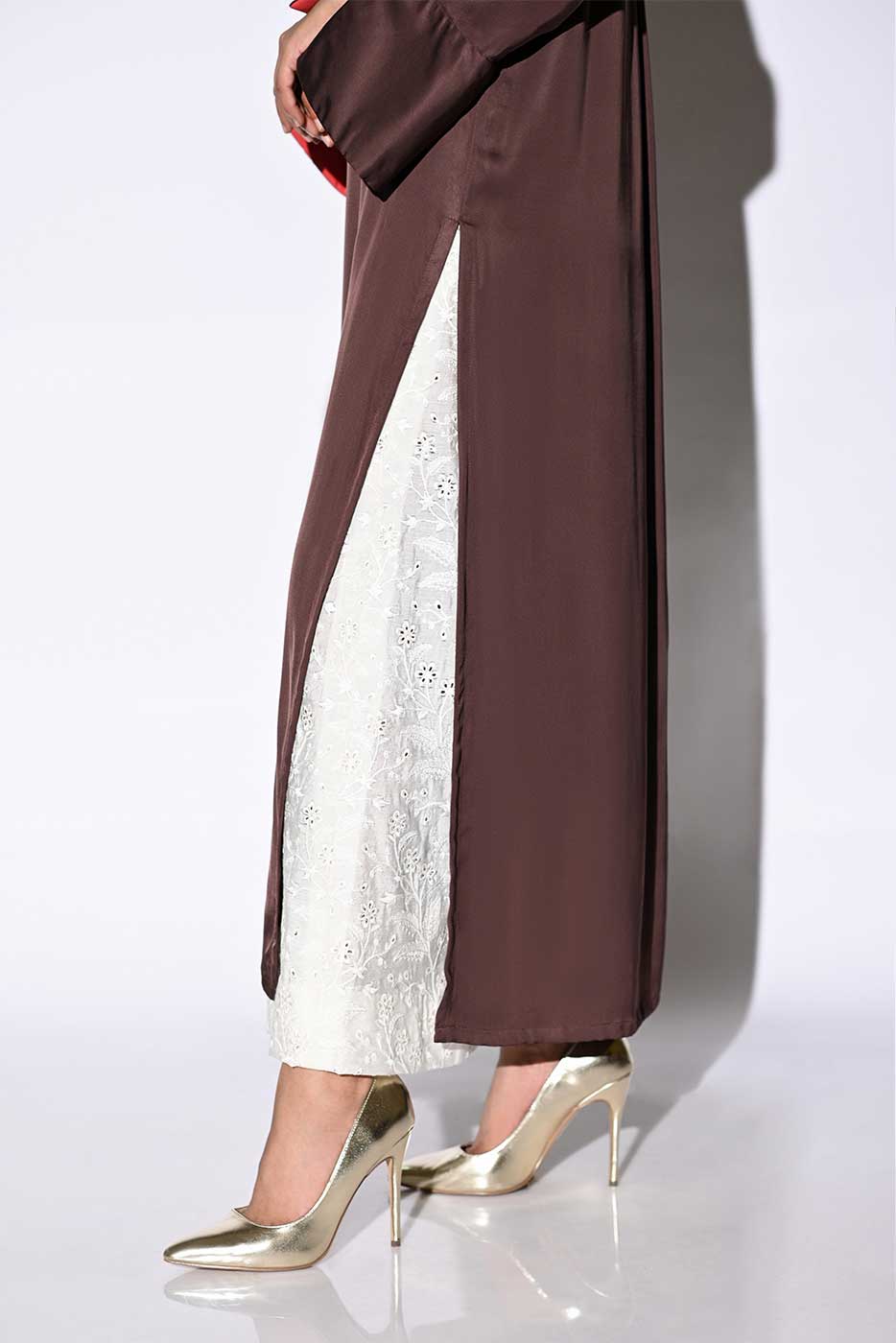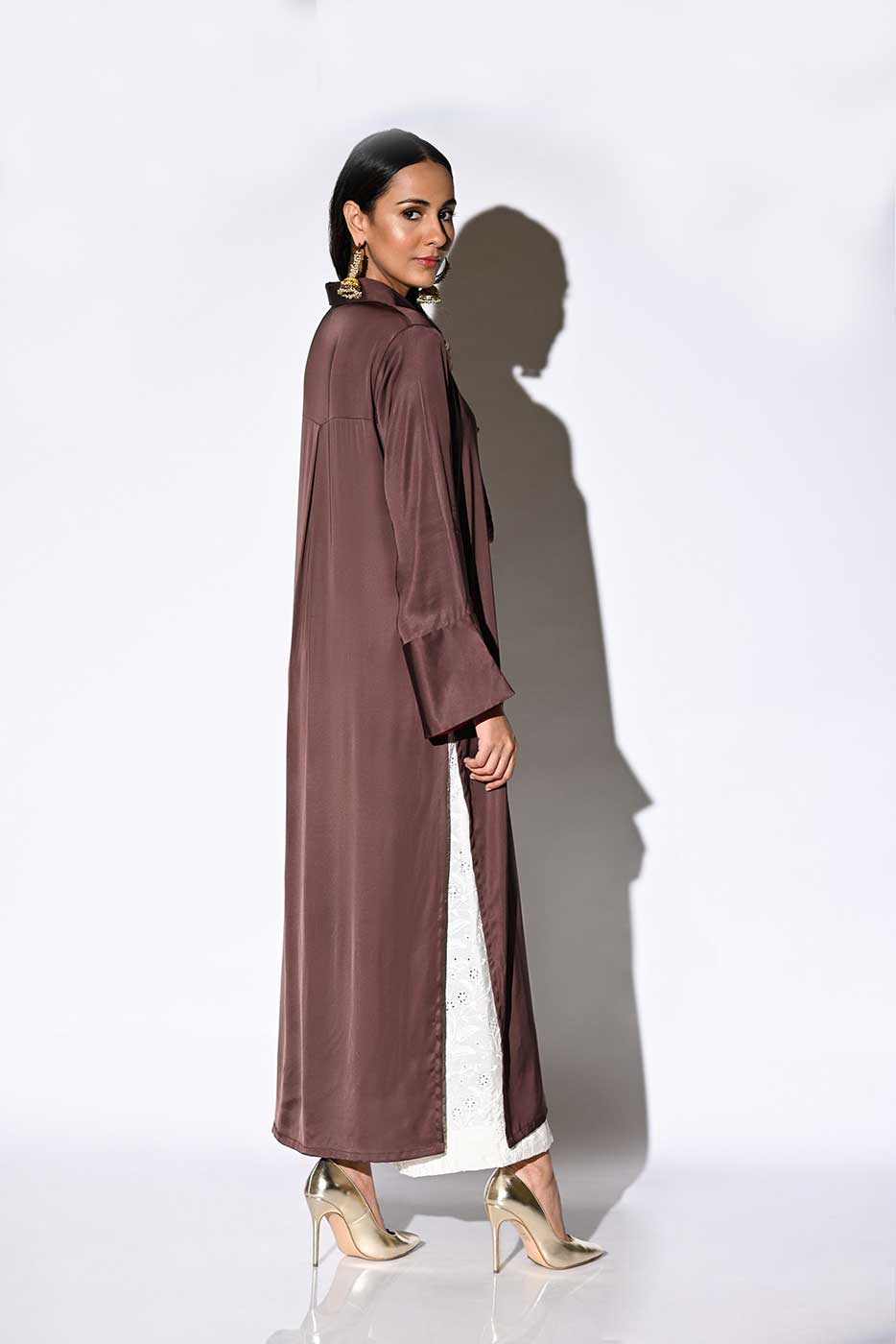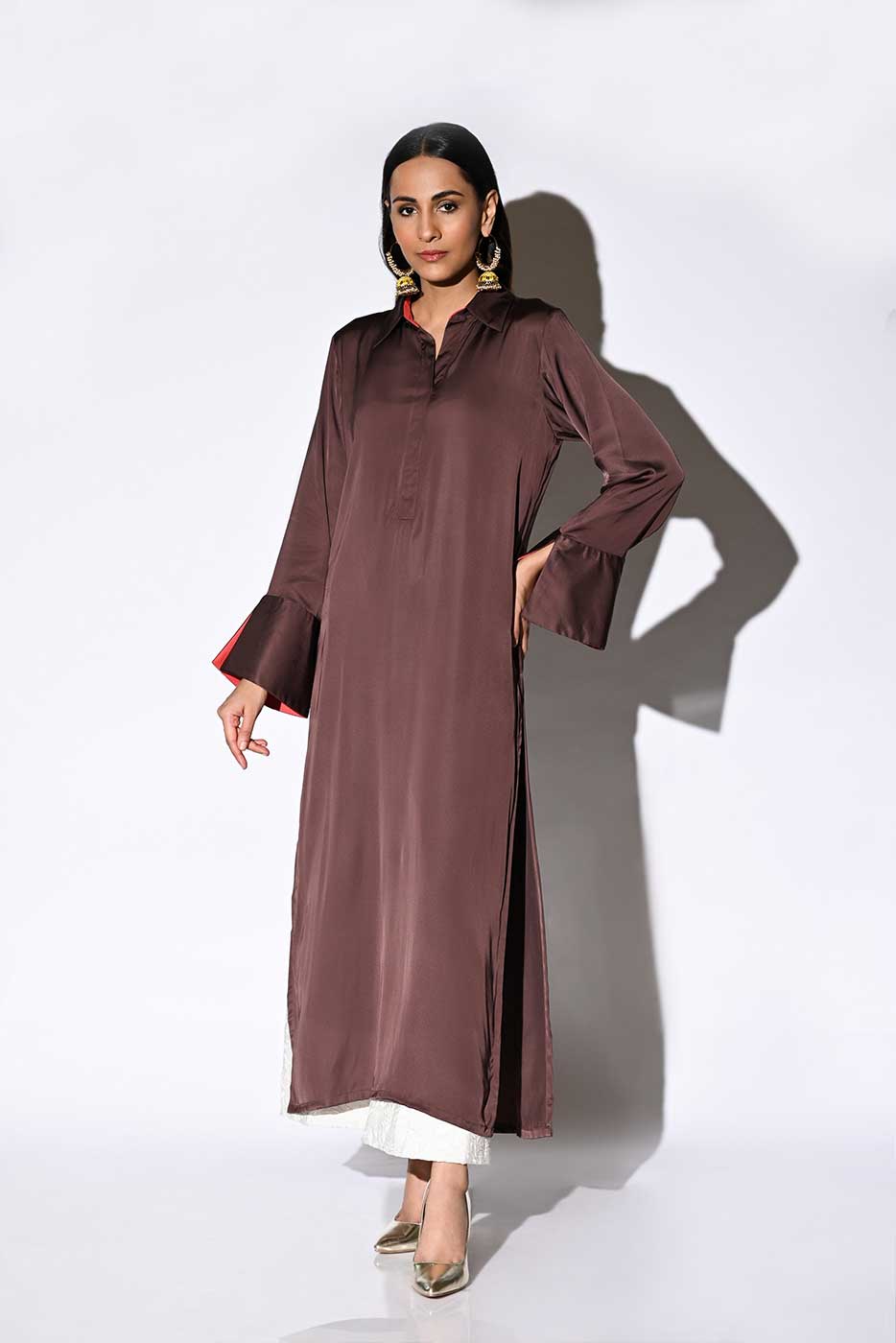 A straight silk shirt with mardana collar along with peach finishing with cuffs in sleeves. Model is wearing size small. Shirt length is 48 inches.Care Instructions