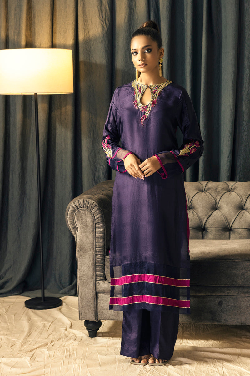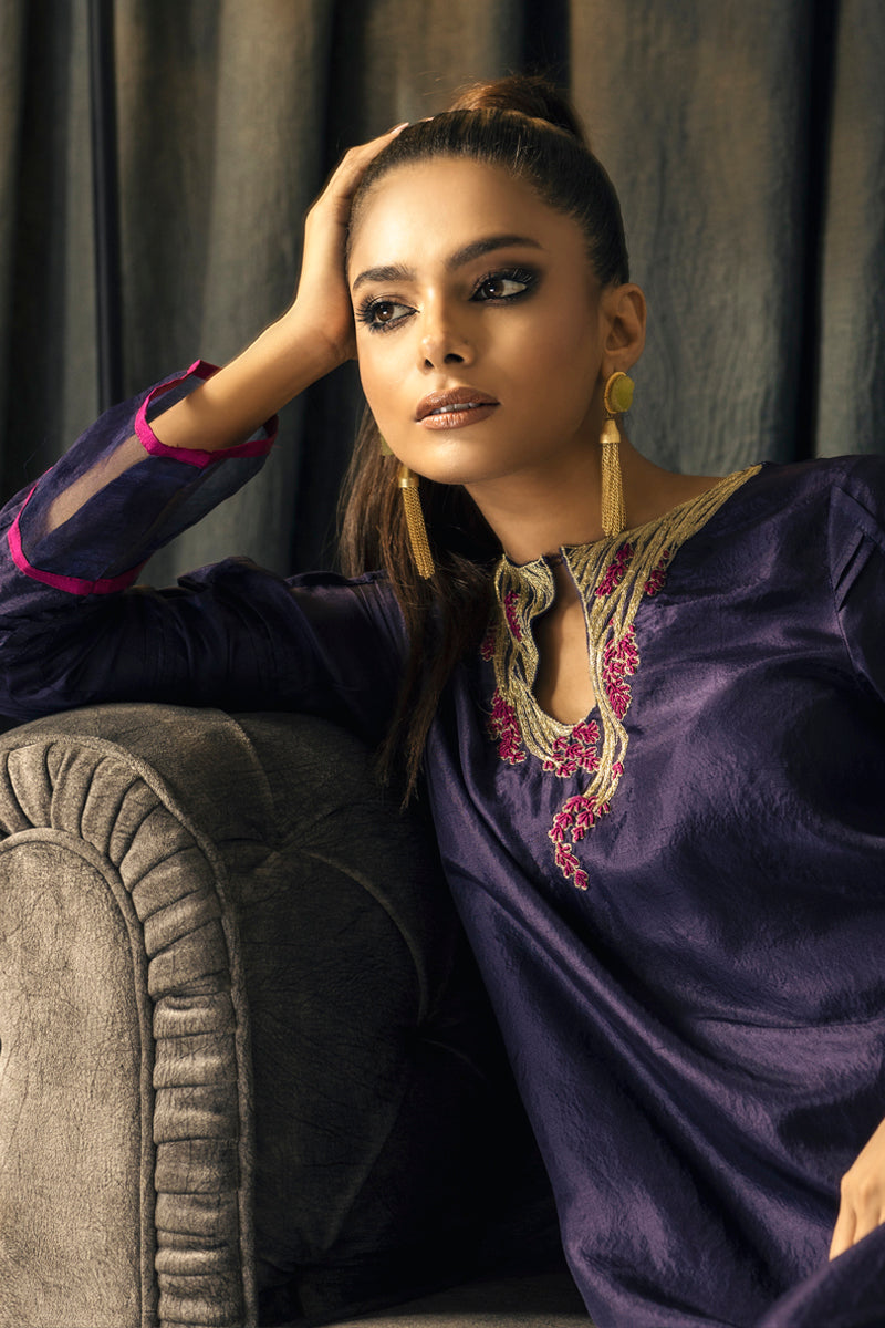 This stunning long silk shirt, crafted from pure raw silk in a deep, regal shade, is an embodiment of elegance and refinement. The intricate hand embroidery along the neckline and sleeves features delicate threadwork in contrasting hues, adding a touch of artistic charm. Sheer panel details at the hem, accented with bold pops of color, bring a contemporary twist to the classic silhouette.