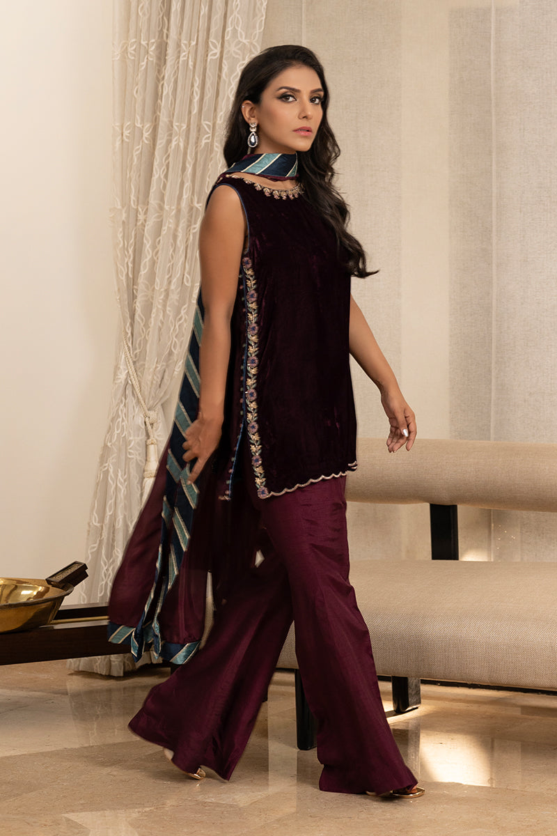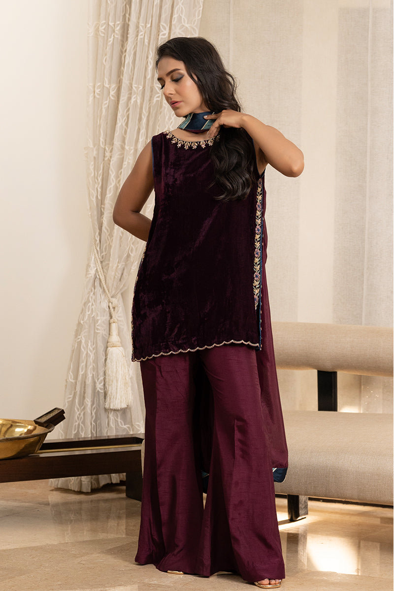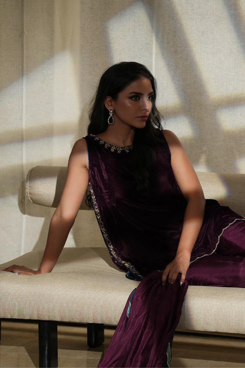 The Isabel set, in a rich plum hue, is a 2-piece ensemble with a stylish top that is paired with bootcut pants. The rich texture of the velvet adds a luxurious feel, while the bootcut silhouette offers a modern, flattering fit.