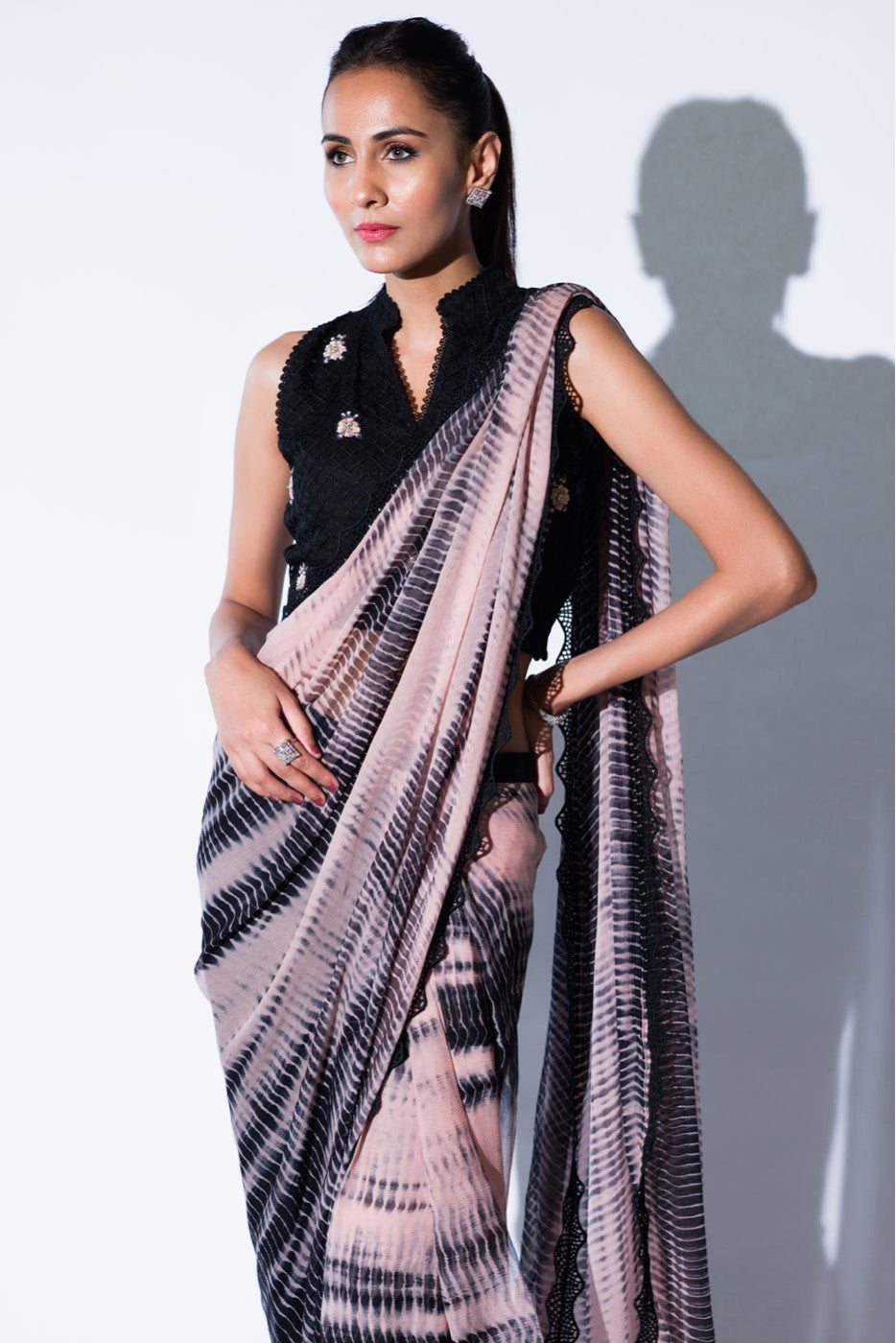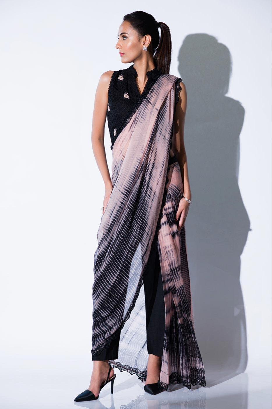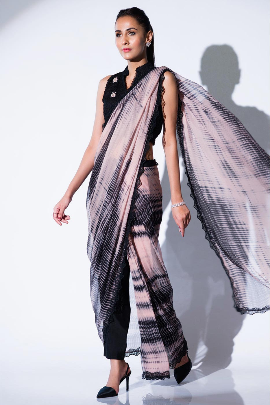 Tie and dye pure chiffon saree with attached black straight pants. Comes with an embroidered blouse.Care Instructions