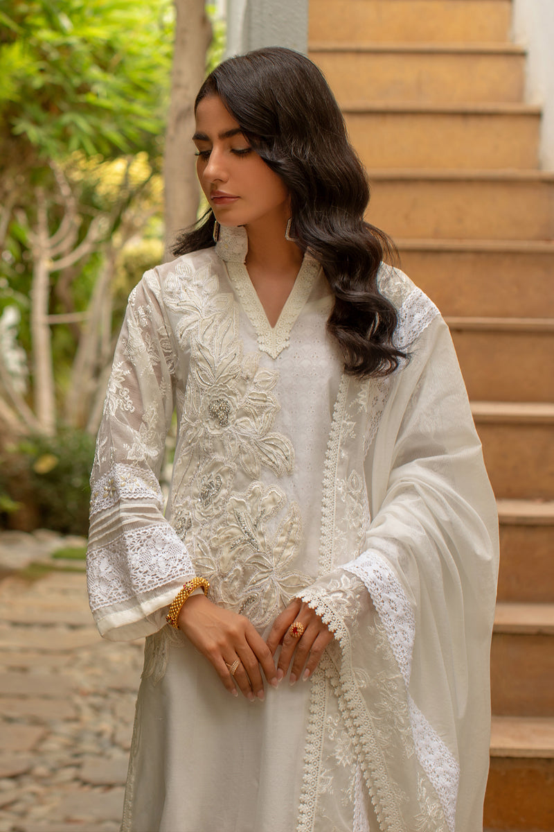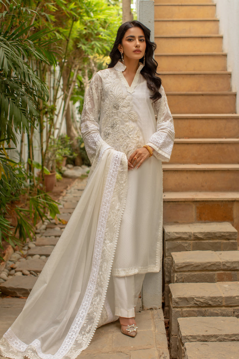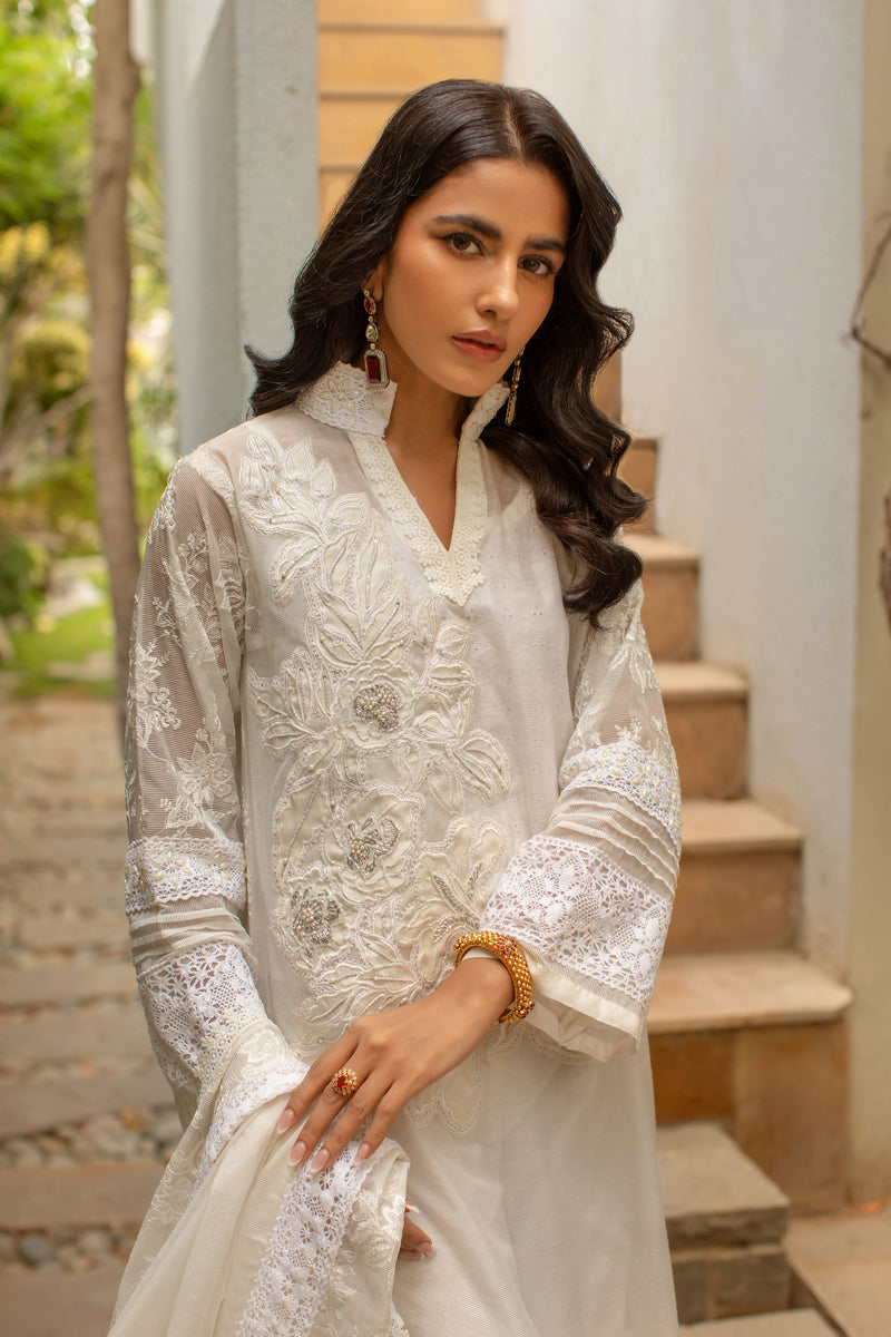 Karandi shirt including inner with plain front and embroidered floral motives. Floral karandi sleeves with hand embroidery and lace detailing on front, paired with straight khaddar silk pants. You can also pair it with beautiful floral karandi dupatta with finished lace.