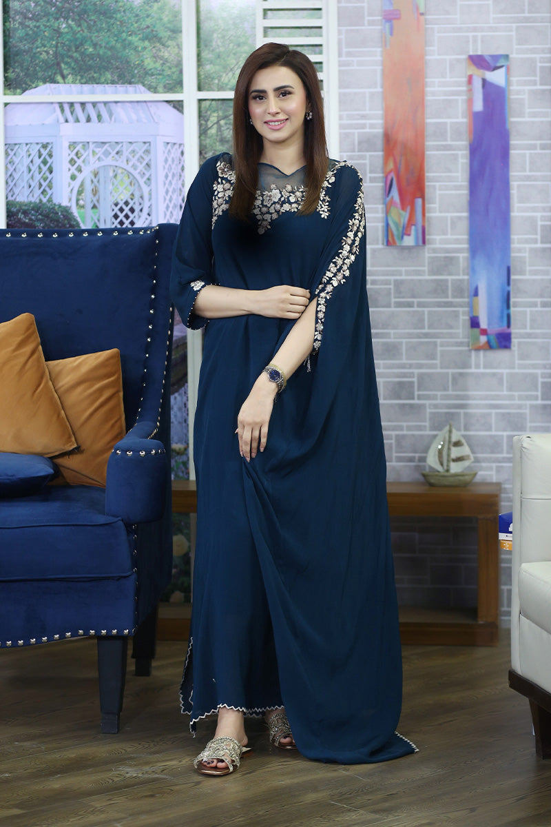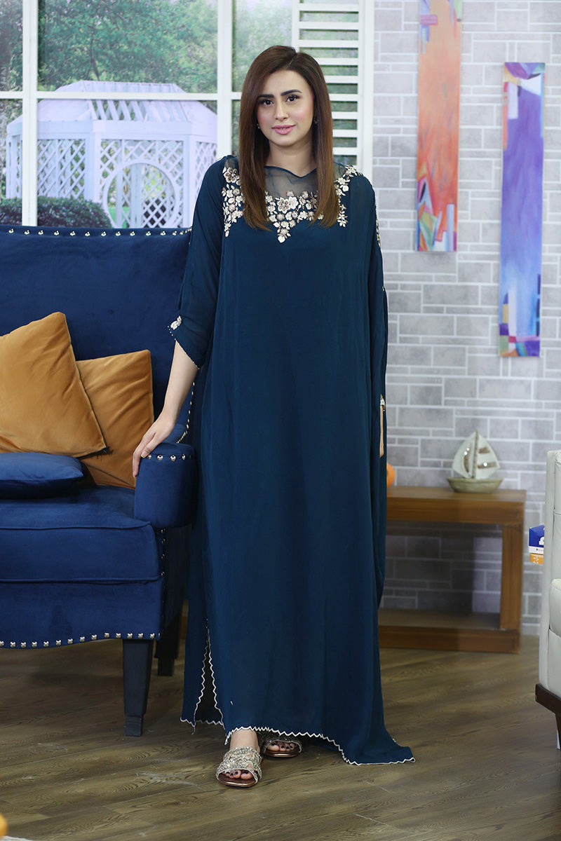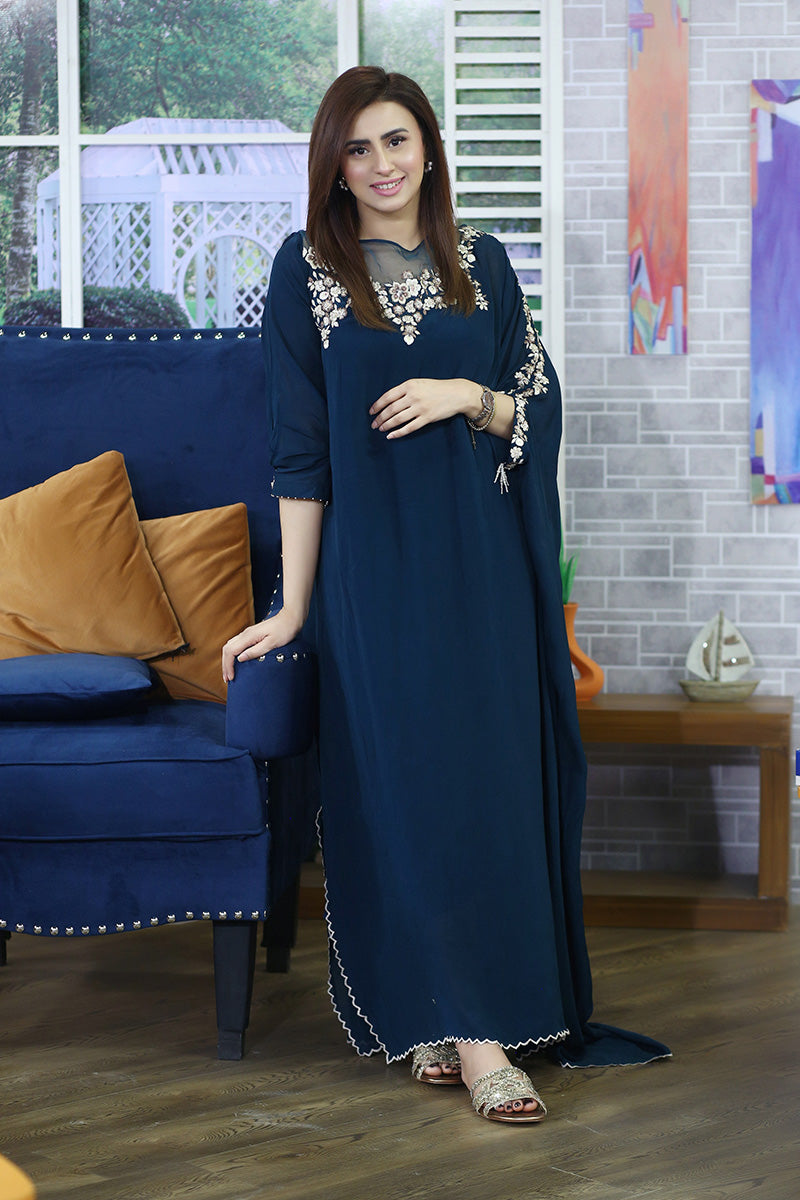 Make a statement in this dreamy kaftaan with one sided sleeve and fluttering butterfly sleeve on the other. Delicate organza necklines front and back glow with intricate hand embellishments and resham artistry. Asymmetric design features a sleek side seam paired with a dramatic flare hem for stunning movement. Finished with tassels, pearls, and scalloped edges for that perfect luxe touch. An effortlessly stylish and captivating look made to turn heads at every semi formal event. It comes with inner.