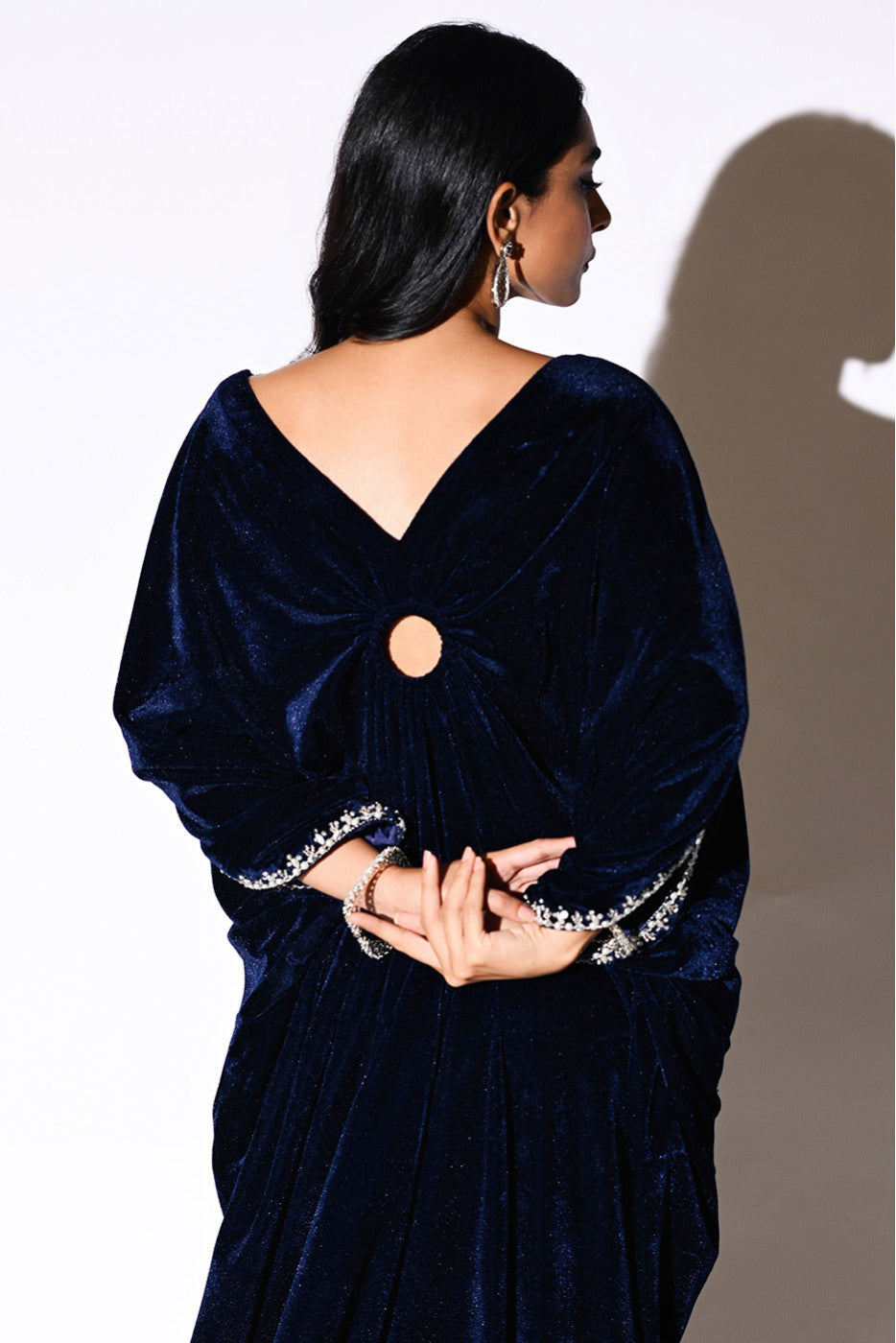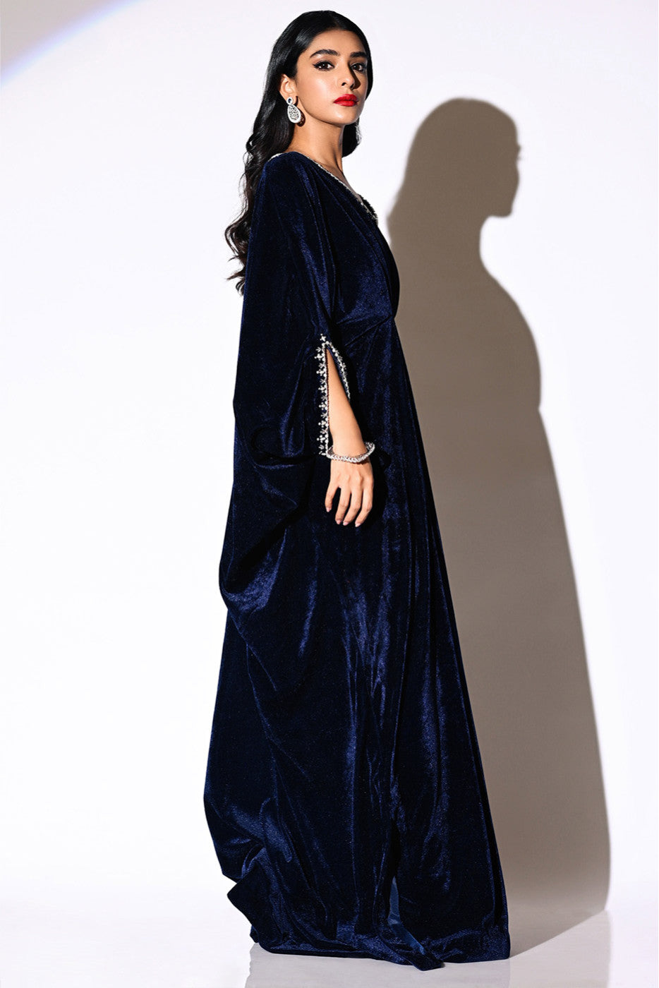 A definite must have for your festive wardrobe. Velvet kaftan with embellished neckline along with ring design on back and pearl tassel on the sleeves.