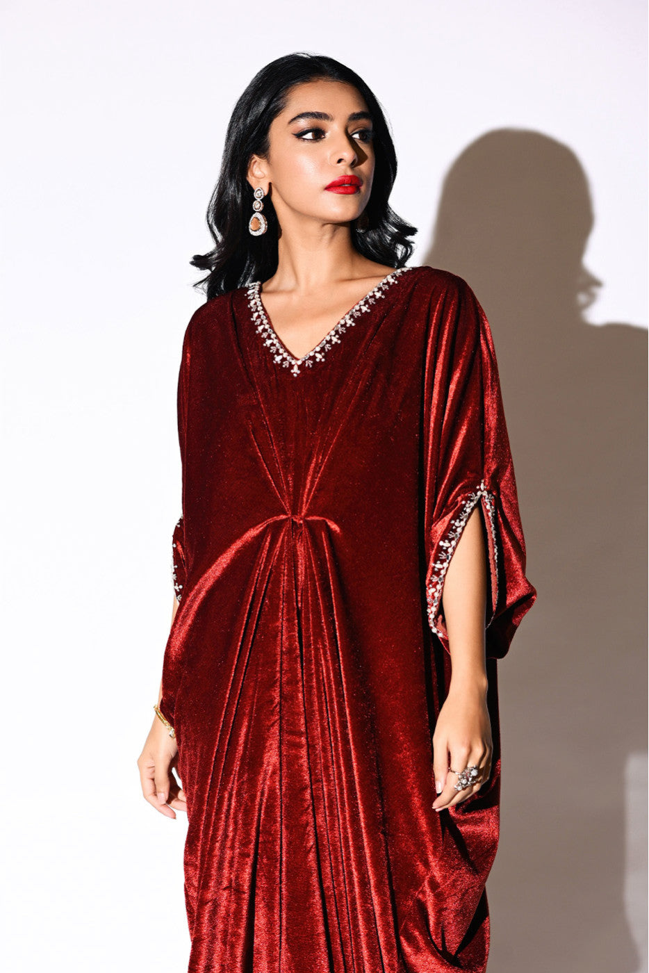 A definite must have for your festive wardrobe. Velvet kaftan with embellished neckline along with ring design on back and pearl tassel on the sleeves.