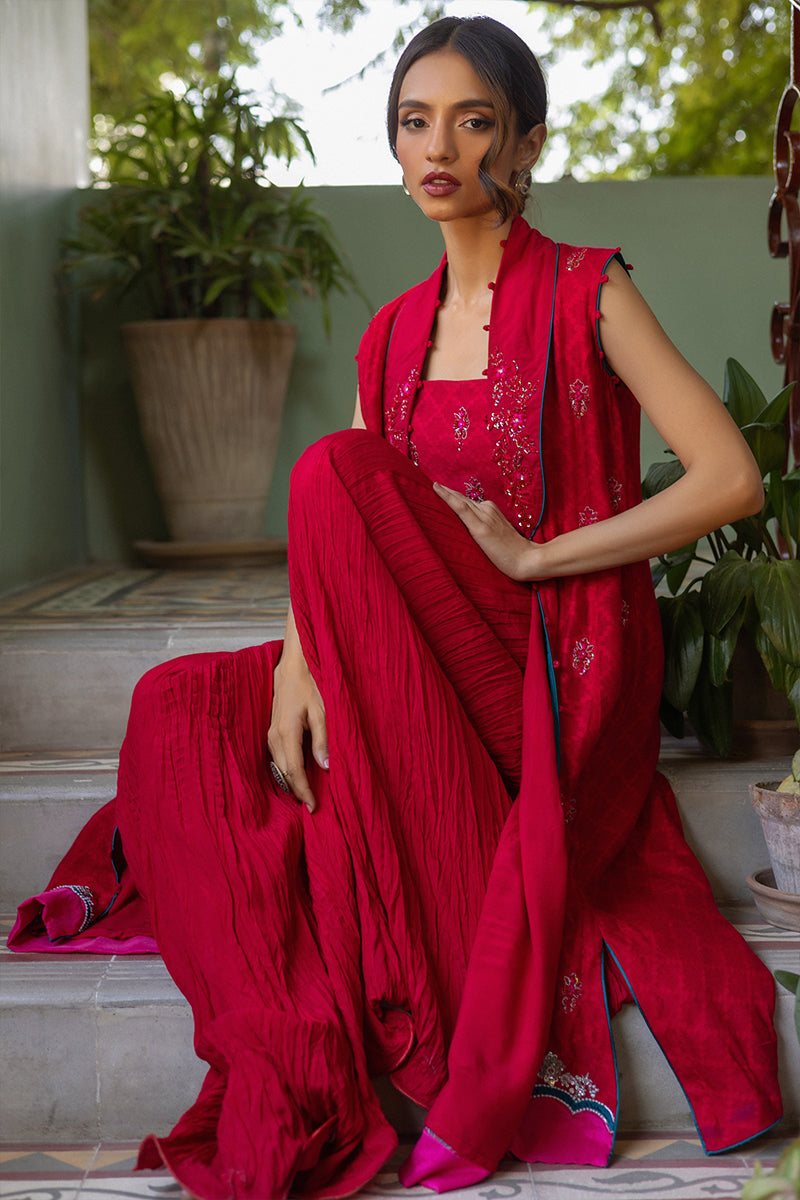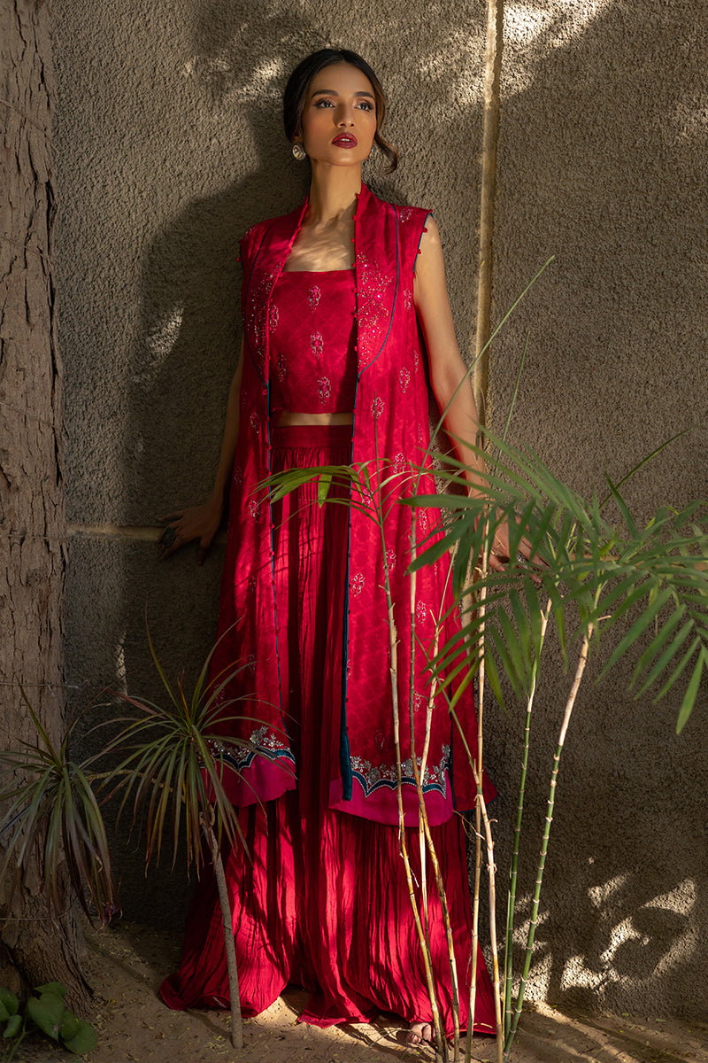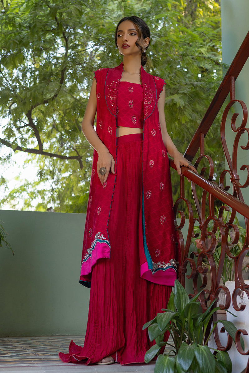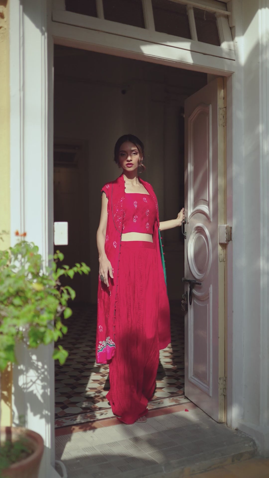 A luxurious cotton net hand-embroidered jacket that effortlessly elevates your style. Paired with a complementary camisole, the jacket adds a touch of sophistication to any occasion. The ensemble is completed with crushed cotton silk pyjamas, offering comfort without compromising on style. The pyjamas complement the jacket seamlessly, creating a well-balanced and effortlessly chic look. This includes jacket, blouse and crushed skirt.