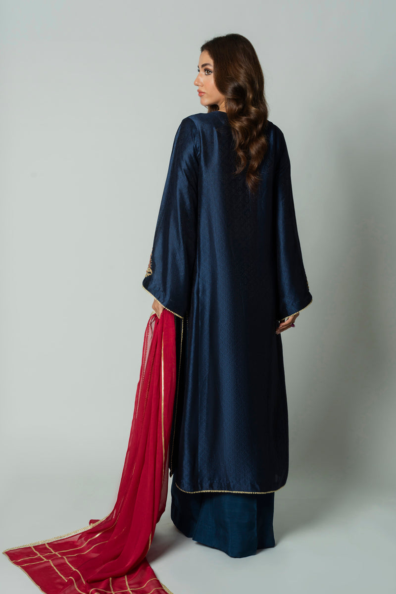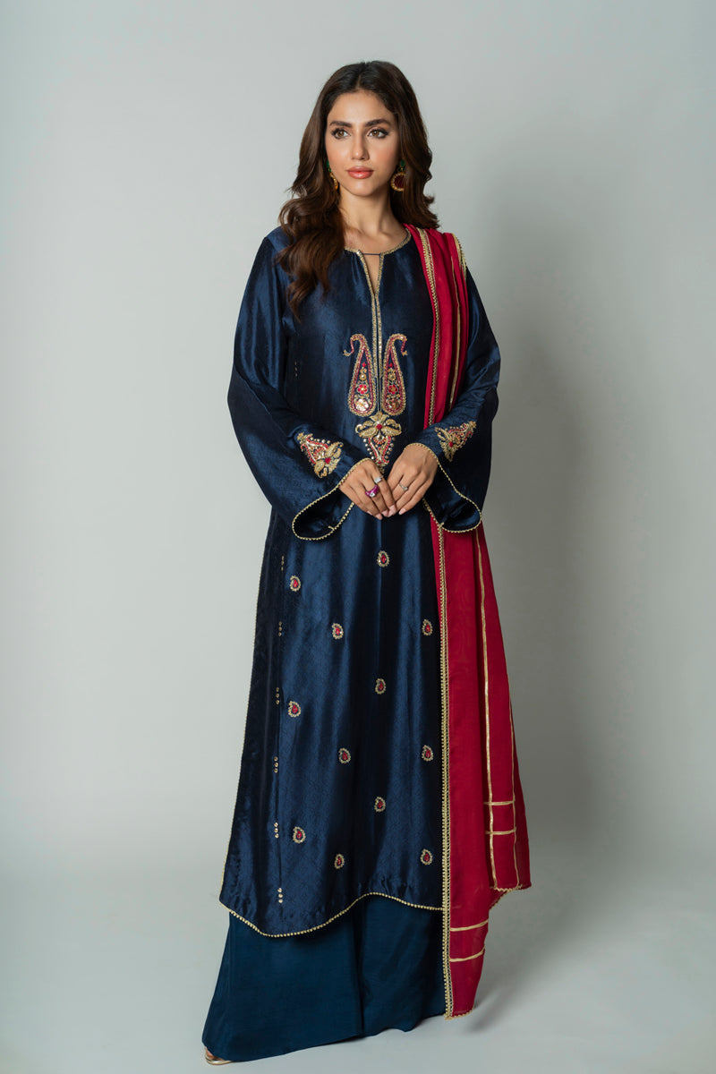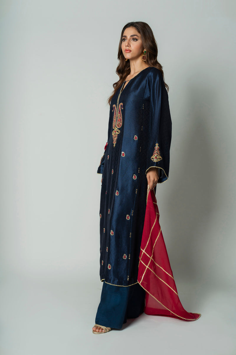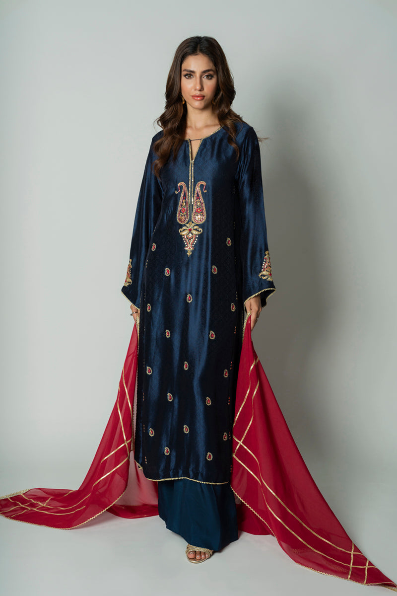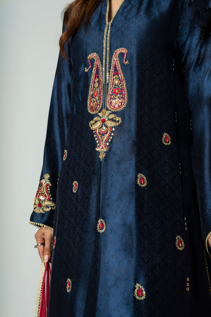 Chic navy embossed silk outfit featuring a box kurta cutline shirt with embroidery, dubka, stone work, and Mukesh details. You can pair it with matching pants and a net organza dupatta with gutta lace details. This is a 2 pcs set. Duppatta is sold seperately.