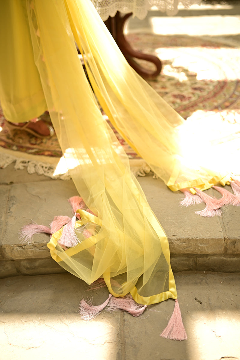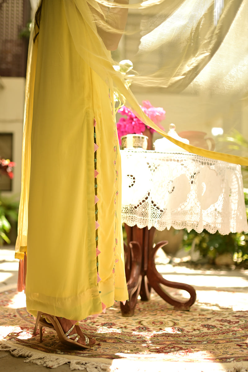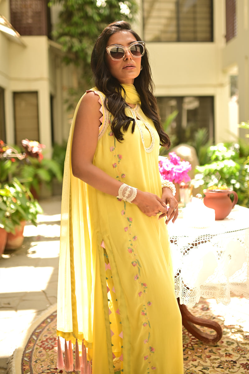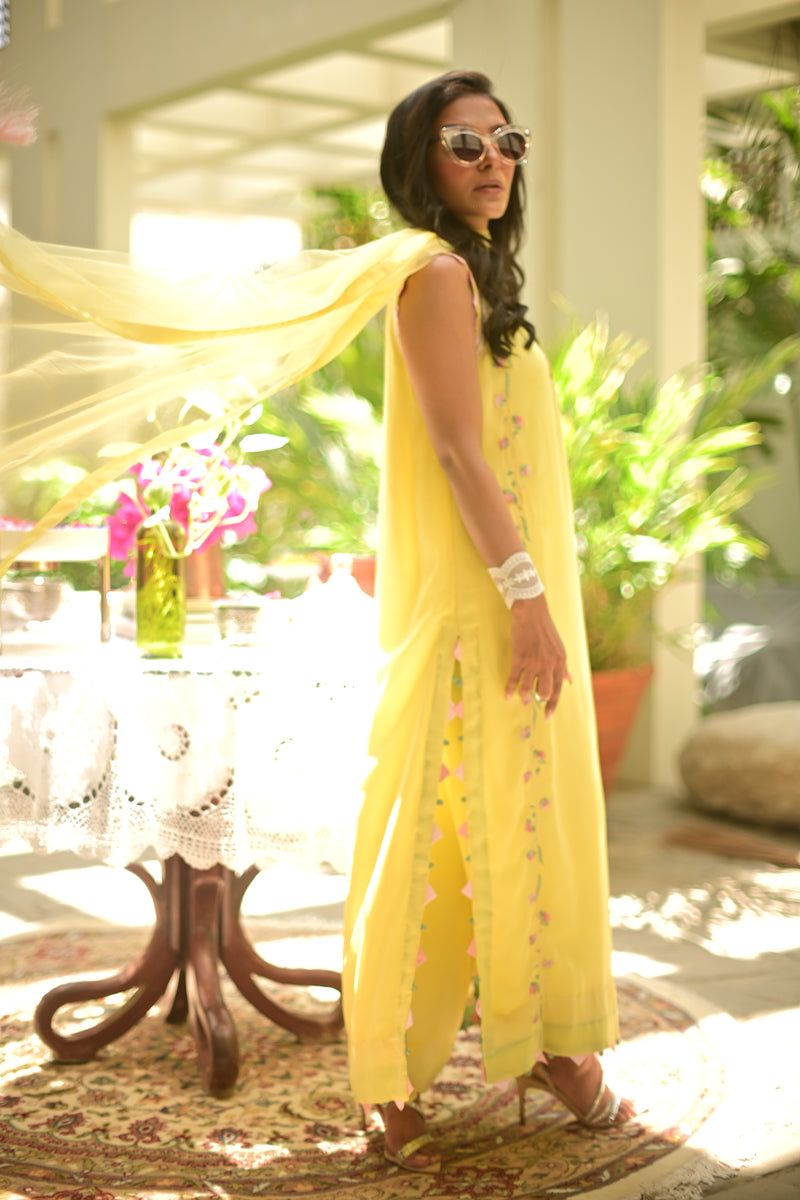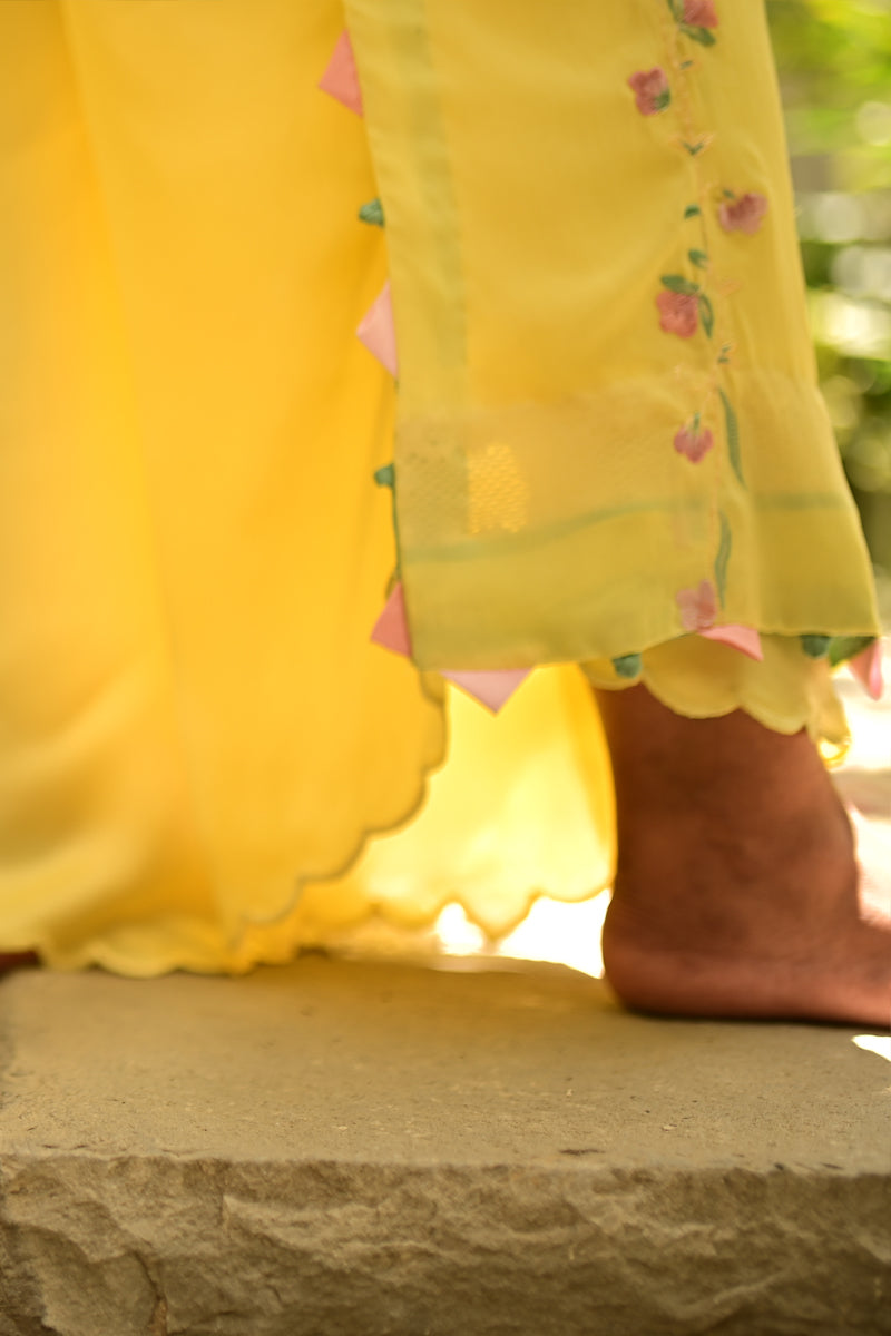 A pastel yellow chiffon long shirt with delicate floral embroidery and perfect finishing details, paired with silk culottes featuring scallop work and an embroidered butterfly. Elegant and fresh for summer.