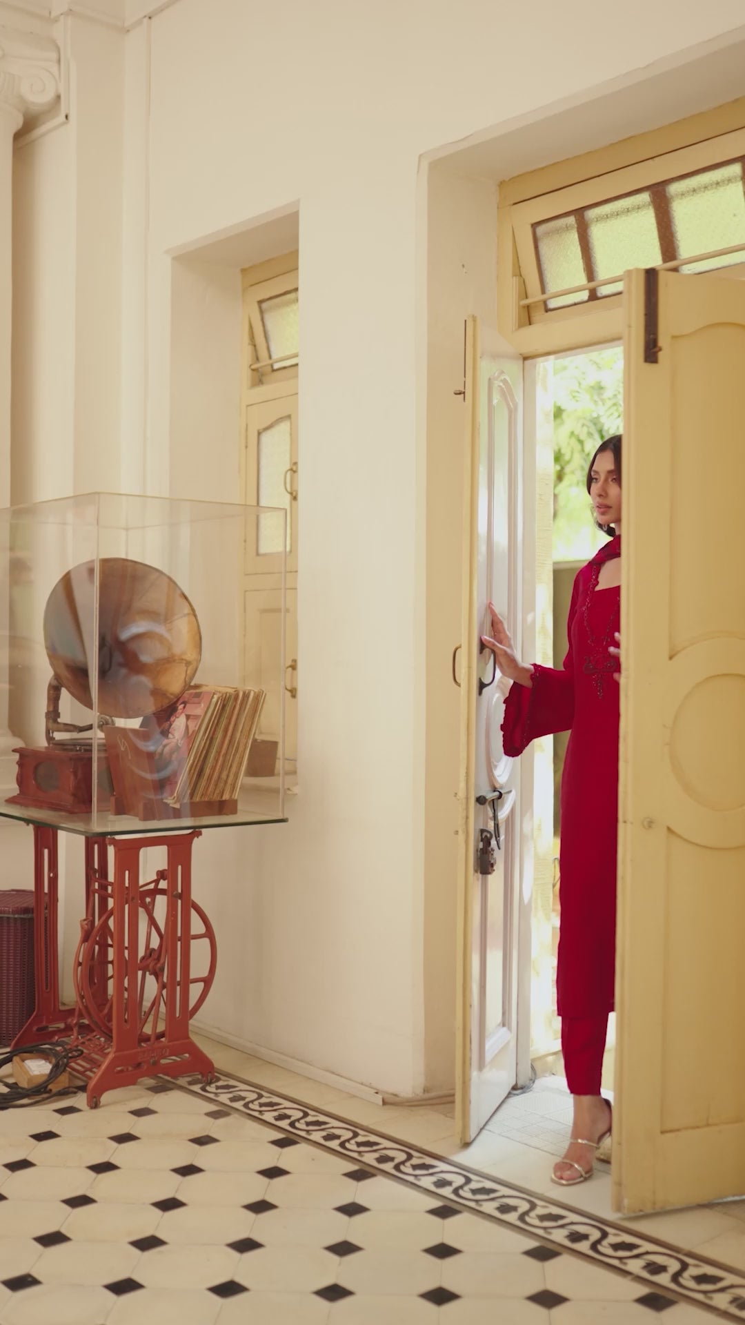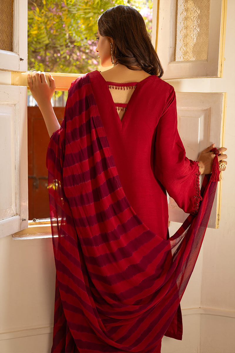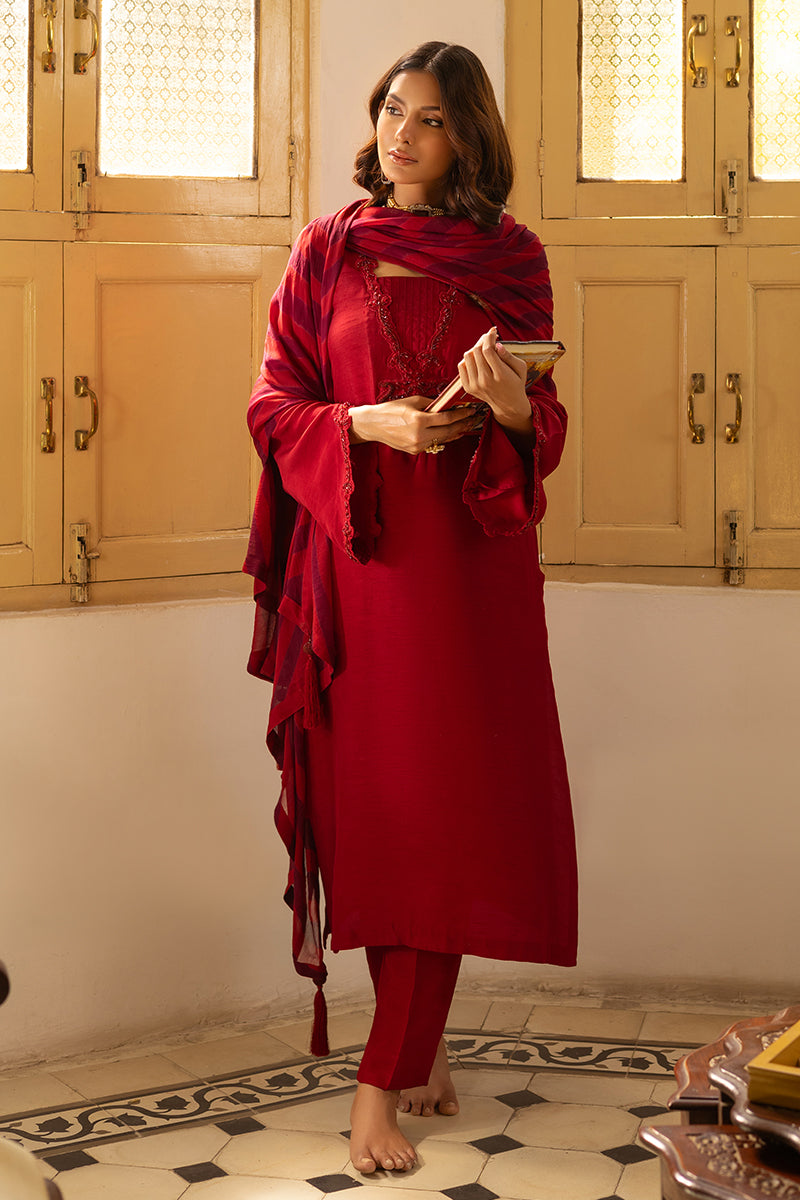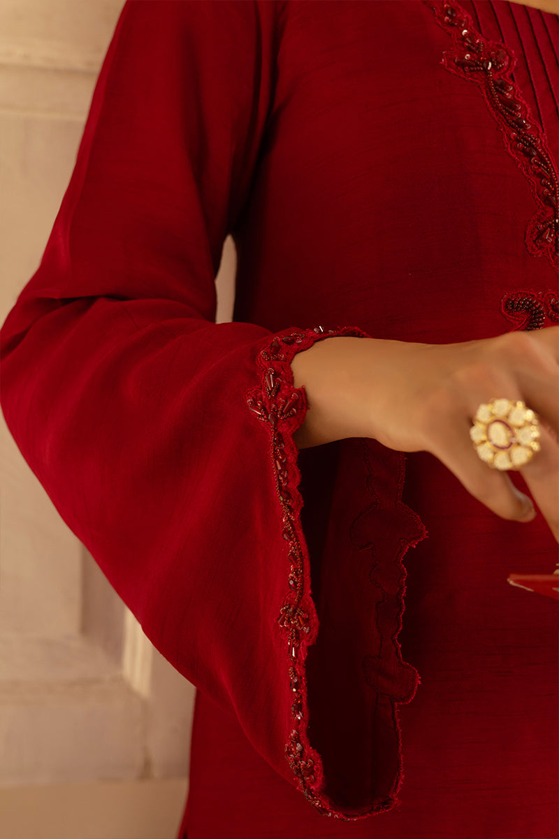 Indulge in the allure of the season with a captivating deep red shade shirt, featuring embroidered neckline and sleeves. This ensemble comes complete with both the shirt and matching pants, offering a seamless and stylish look that perfectly captures the essence of the season's elegance. Includes shirt, trousers and duppattaCare Instructions