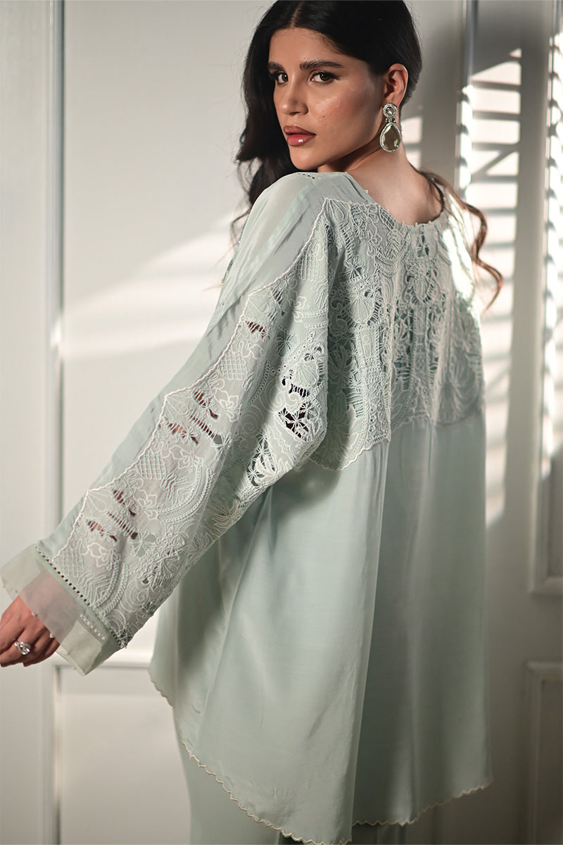 The striking back schiffli yoke adds delicate elegance and intricate charm. Sleeves stun with pleated details, lacing, and organza cuffs finished with pearls. Styled with sleek culottes for a fierce, fashion forward silhouette. An ultra-stylish statement piece that’s equal parts classic and cutting edge.