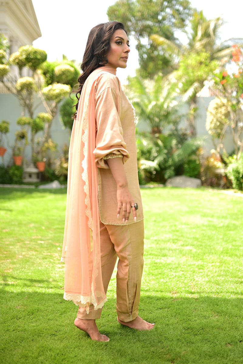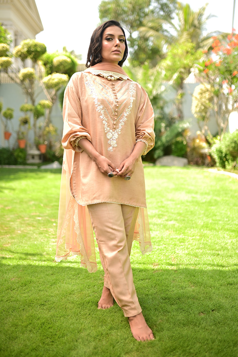 A coffee brown boxy-cut kurta, designed with a modern, relaxed fit that exudes effortless style. The kurta is beautifully enhanced with intricate neckline detailing and delicate embroidery, showcasing a perfect blend of craftsmanship. Paired with a traditional khari shalwar, the ensemble effortlessly balances contemporary design with classic elegance, offering a unique, sophisticated look