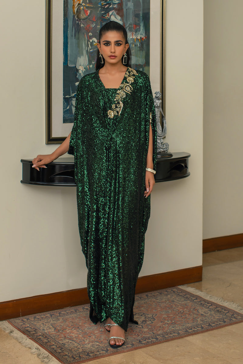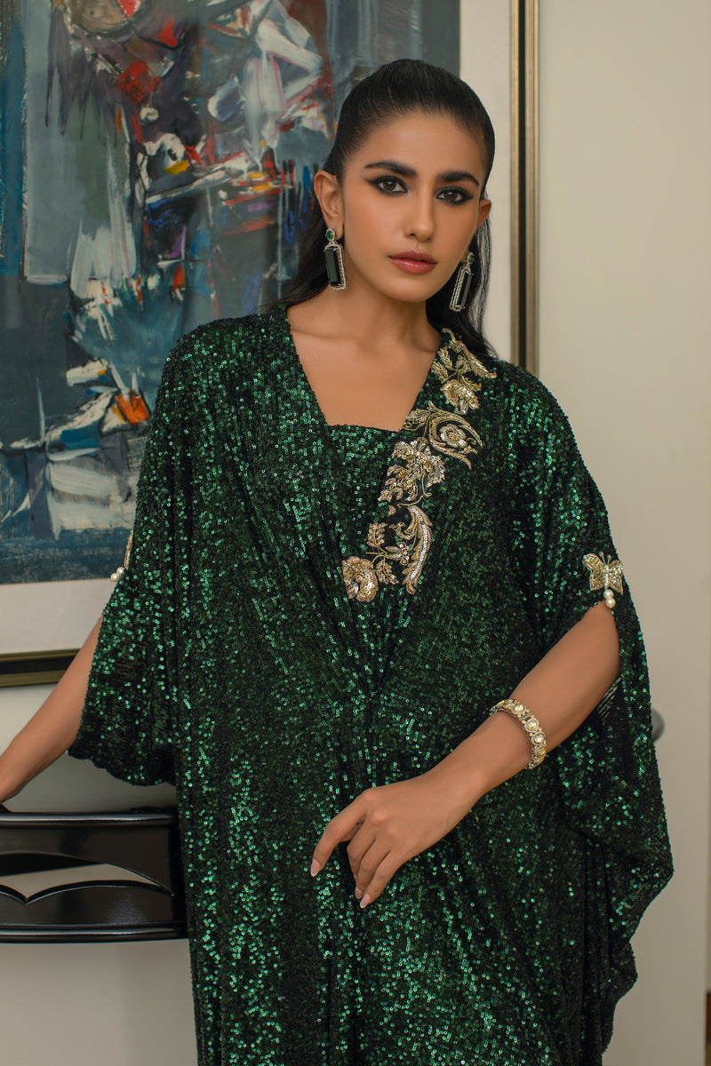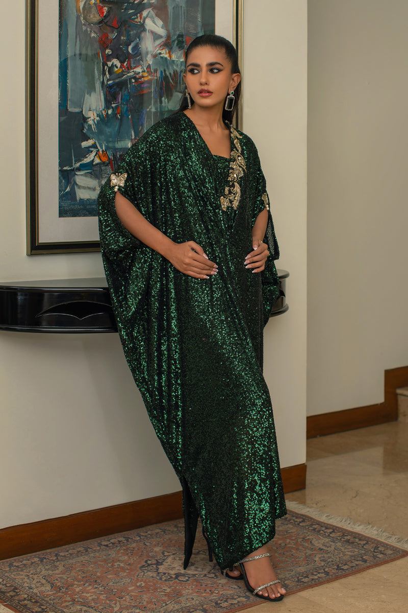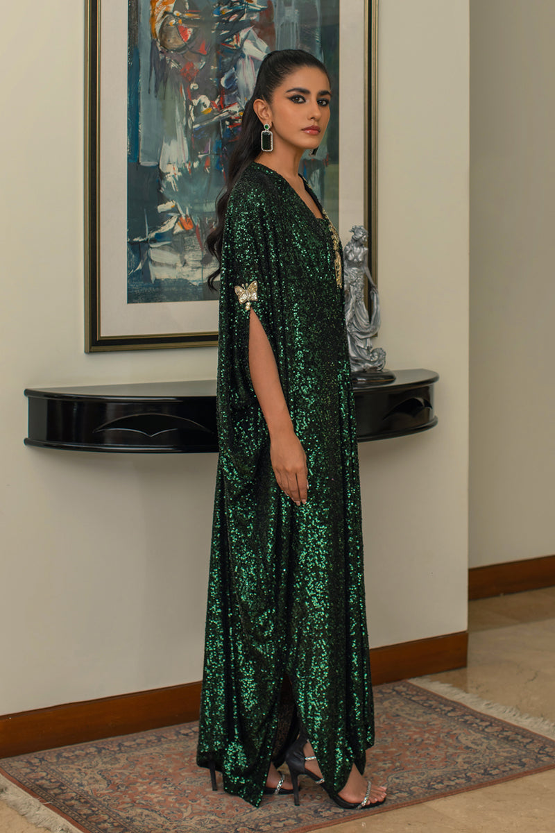 A fusion attire. Sequence kaftan with embellished neckline on front and sleeves.
