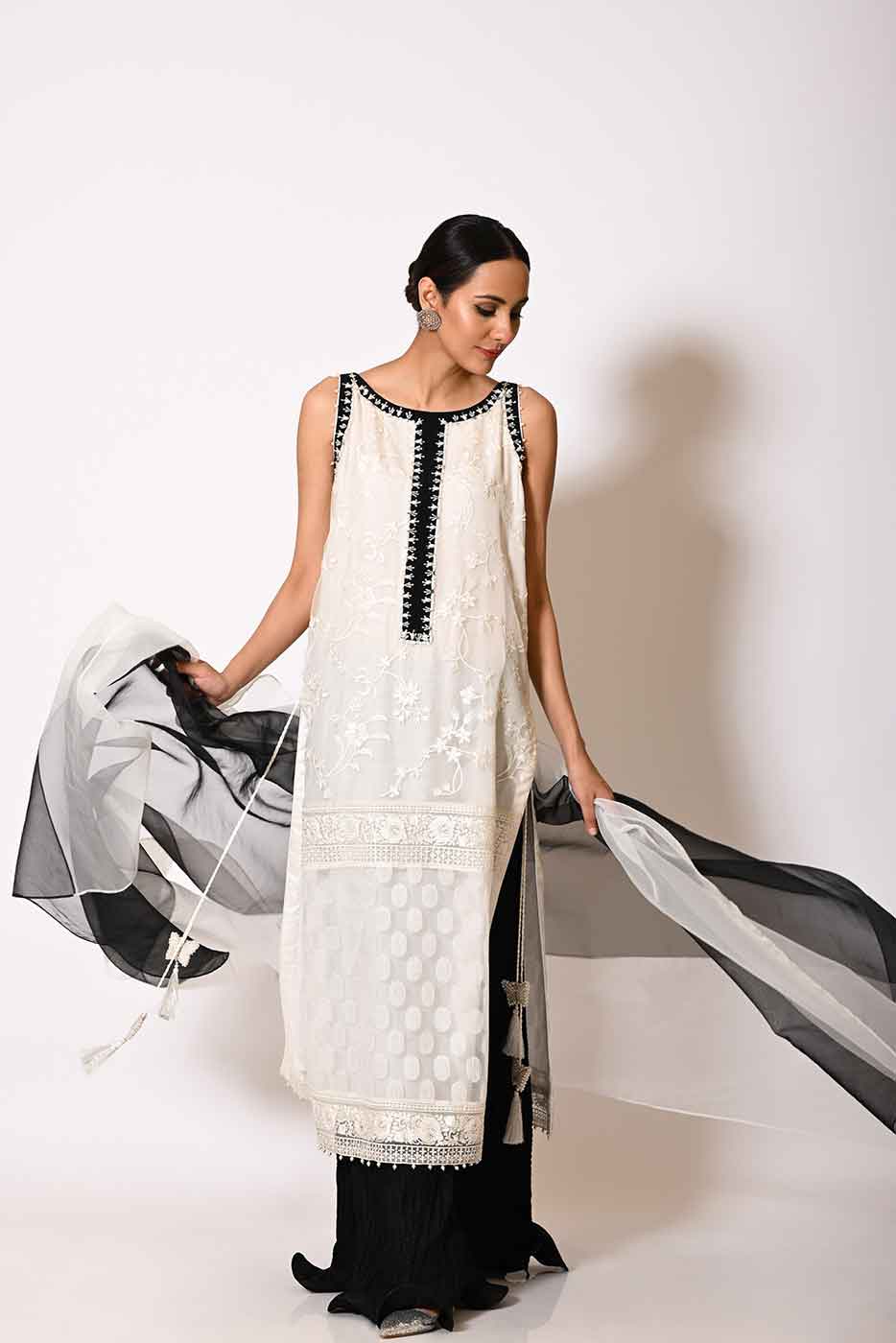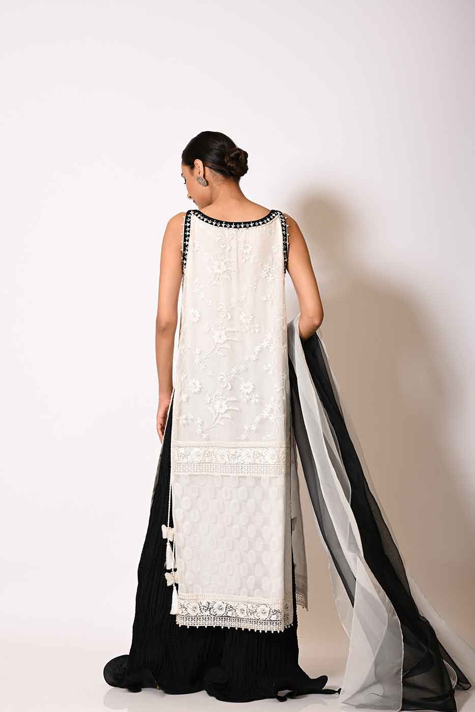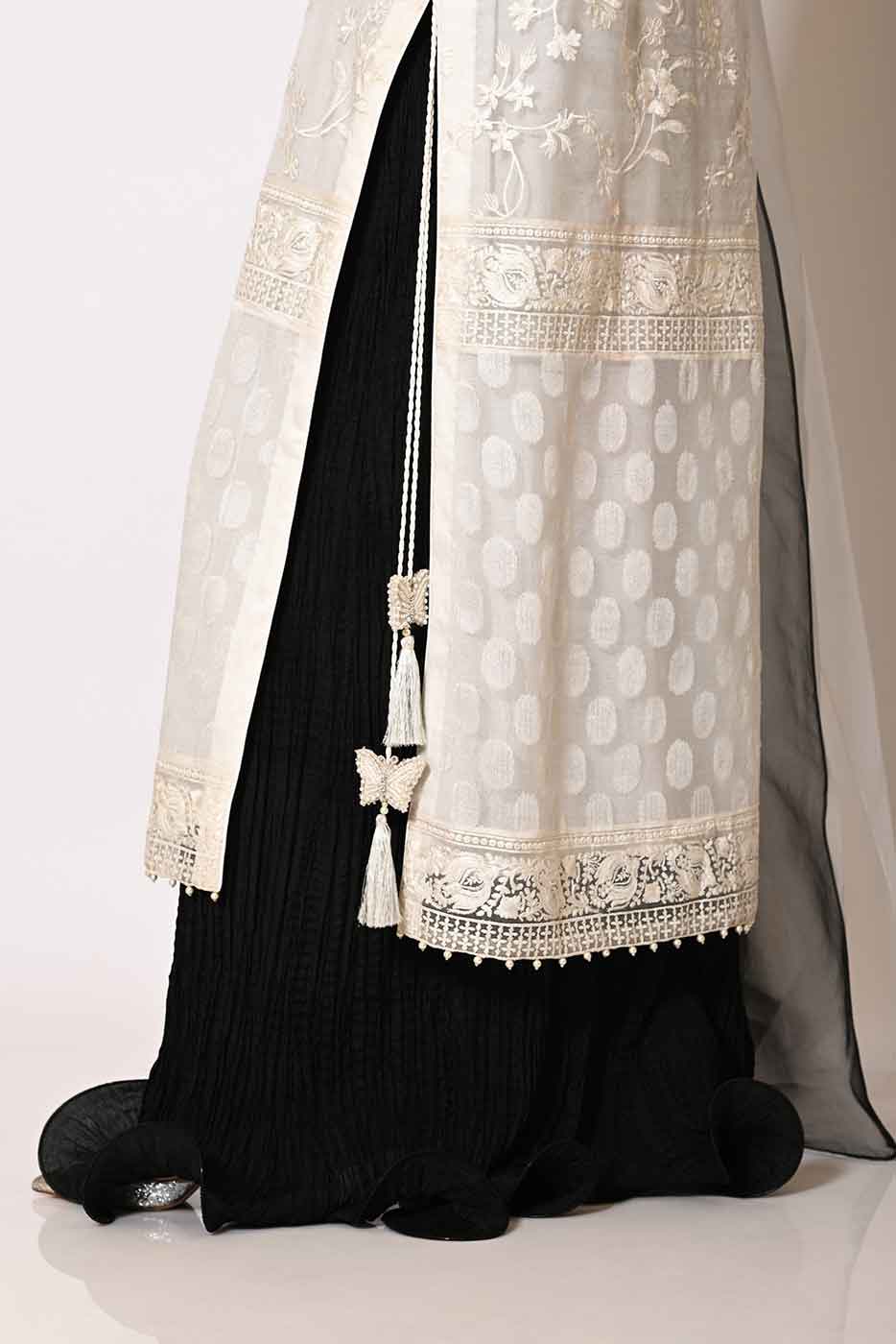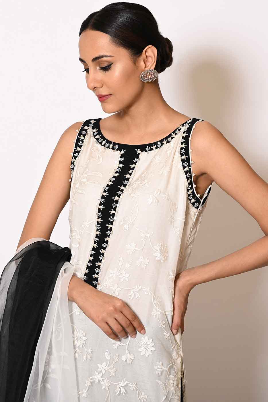 Organza embroidered shirt with embellishment on neckline. It can be paired with black crushed pants.