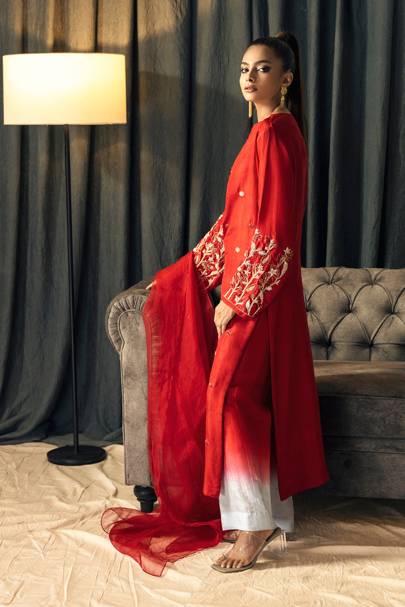 Paired with wide-legged ombre-dyed trousers in pure raw silk, transitioning seamlessly from a red to a soft hue of blue, this ensemble embodies effortless elegance. The matching sheer dupatta in a vibrant red shade completes the look, making it perfect for festive gatherings, evening soirées, or special occasions.