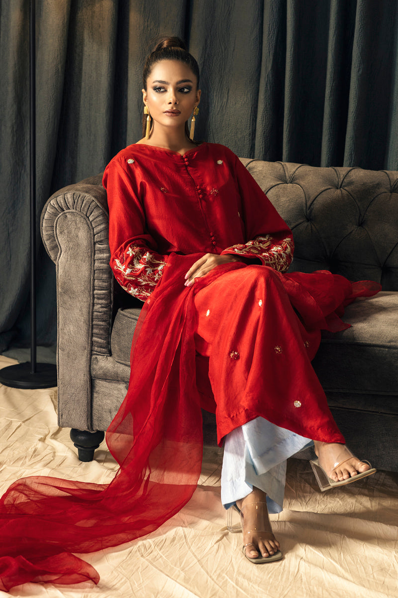 This exquisite long silk shirt is a timeless statement piece, crafted from luxurious pure raw silk in a striking red hue. The silhouette is adorned with delicate hand-embroidered motifs scattered across the fabric, while the intricately embroidered daman and sleeves add a regal charm.
