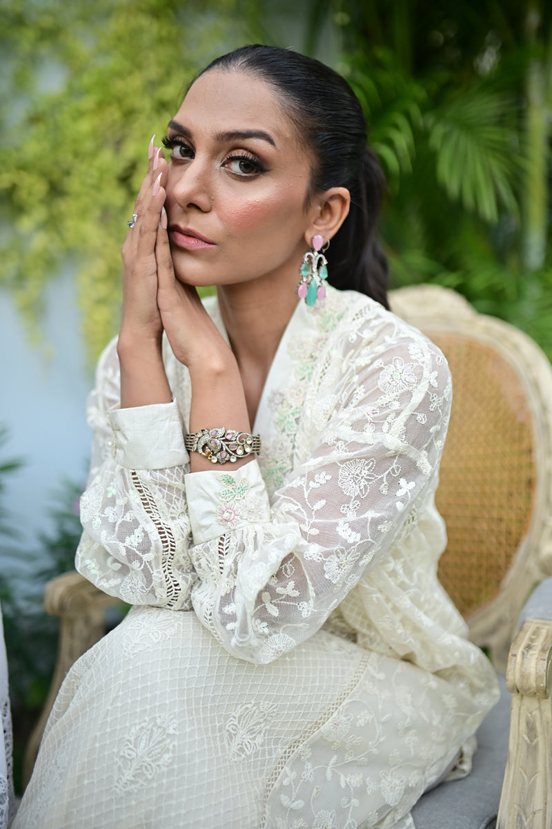 A long off-white embroidered net kurta, featuring a stunning butterfly embroidery motif on the back. The soft pastel-toned embroidery gracefully enhances the design, while tassel work finishes add a sophisticated touch. This elegant piece combines intricate craftsmanship with a modern, airy appeal, perfect for a refined yet contemporary look.