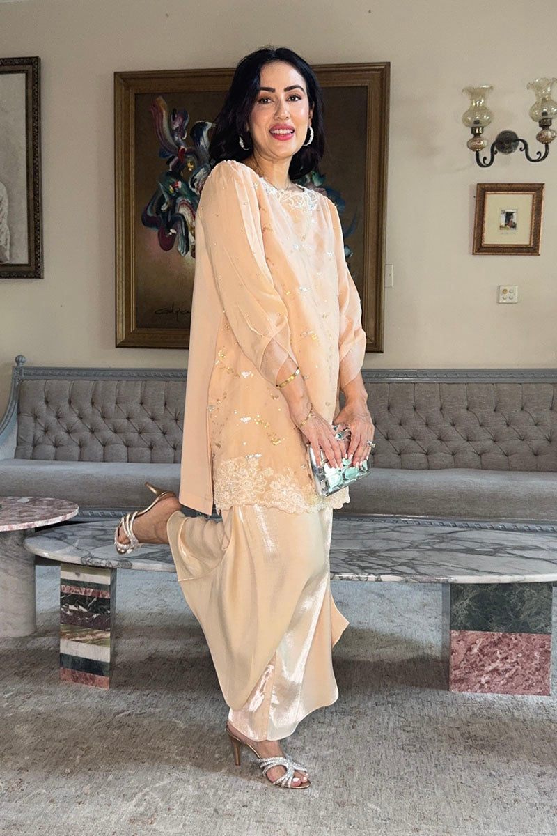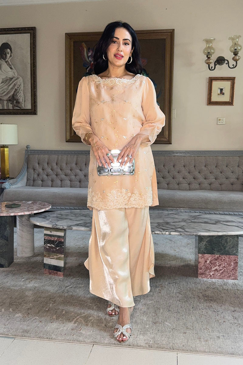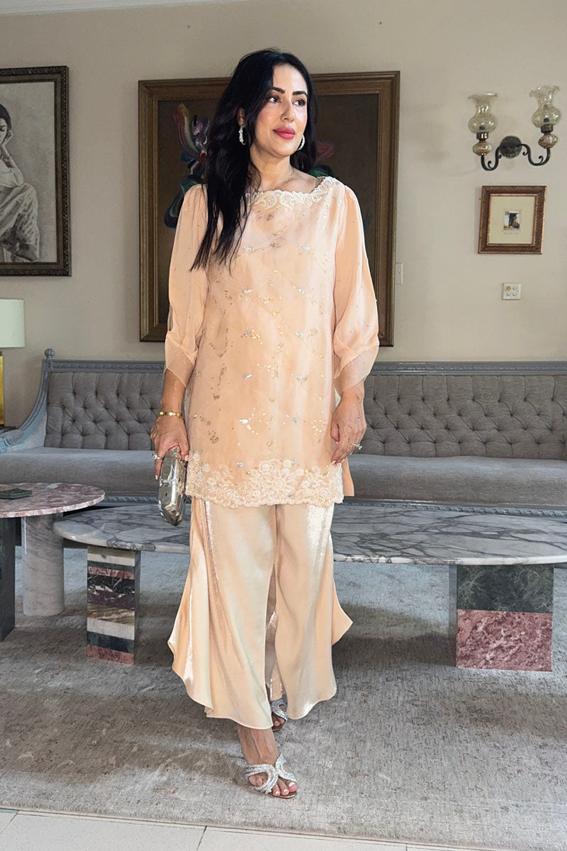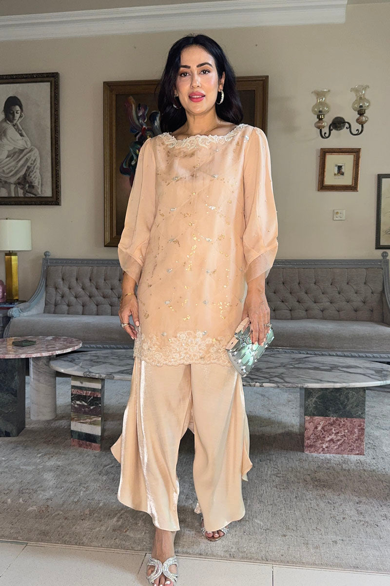 A sequin-stuffed organza shirt featuring intricate hand embellishment on the shirt neckline and daman. The layered organza creates a soft, luminous shimmer that's both subtle and striking. Stylized sleeves add a touch of modern sophistication. Paired with asymmetric flared pants for a sleek, statement making silhouette.