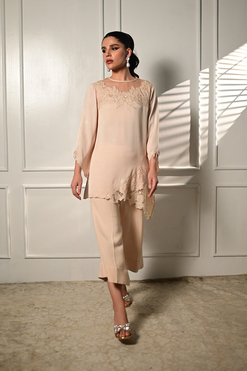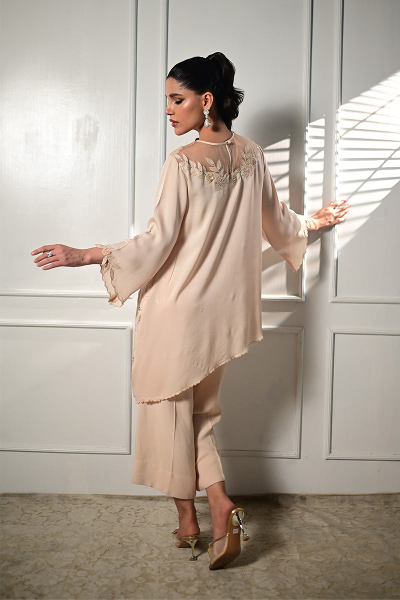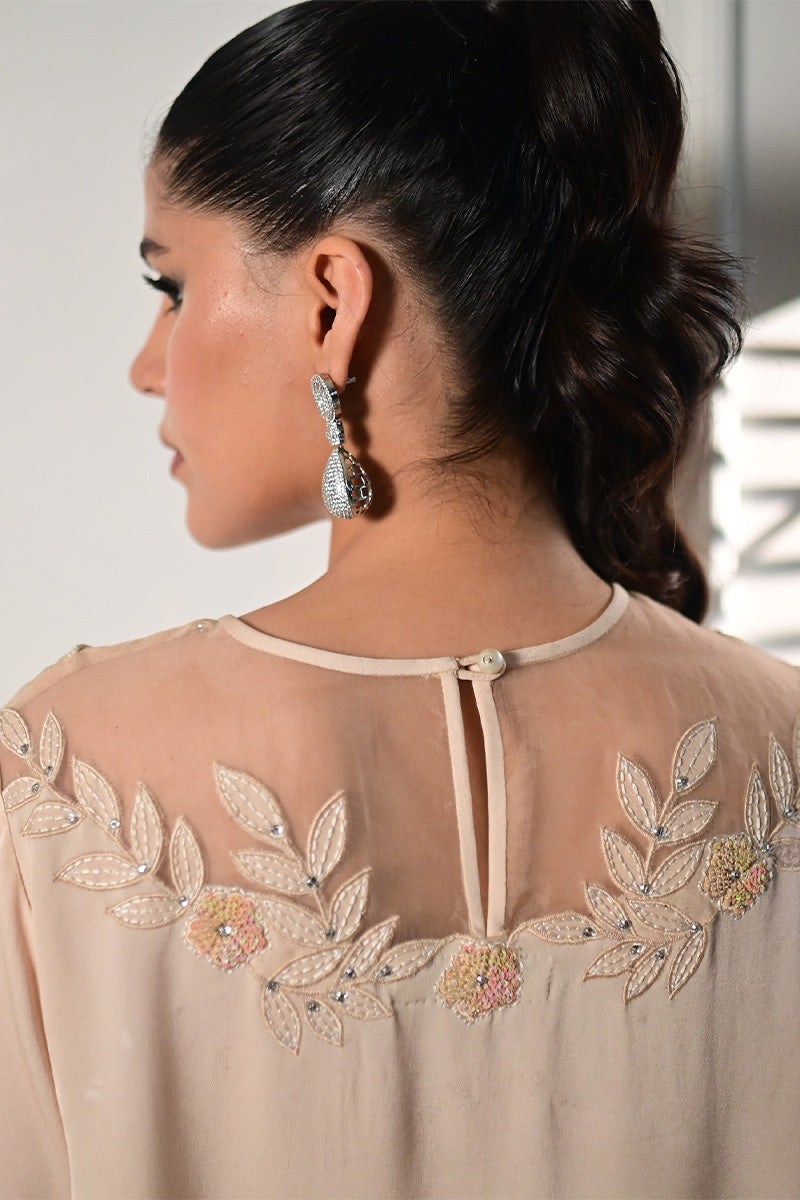 Glow softly in this powder peach semi formal set with a sheer organza neckline, delicately hand embellished on both front and back. The symmetrical hem features graceful schiffli detailing for a timeless, elegant touch. Scalloped sleeves are adorned with intricate hand embellishments, adding subtle charm. Paired with chic culottes, this look perfectly blends modern sophistication with dreamy femininity. A refined, eye catching ensemble that’s effortlessly beautiful for any special occasion.