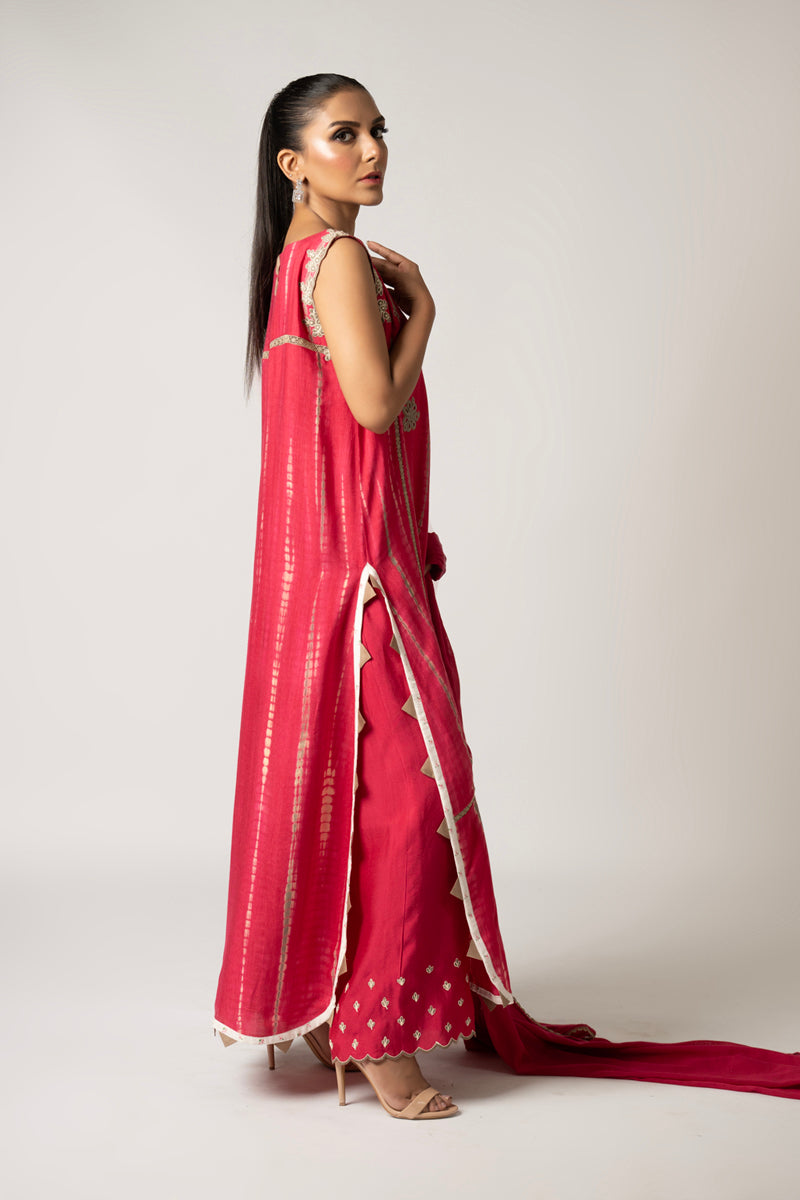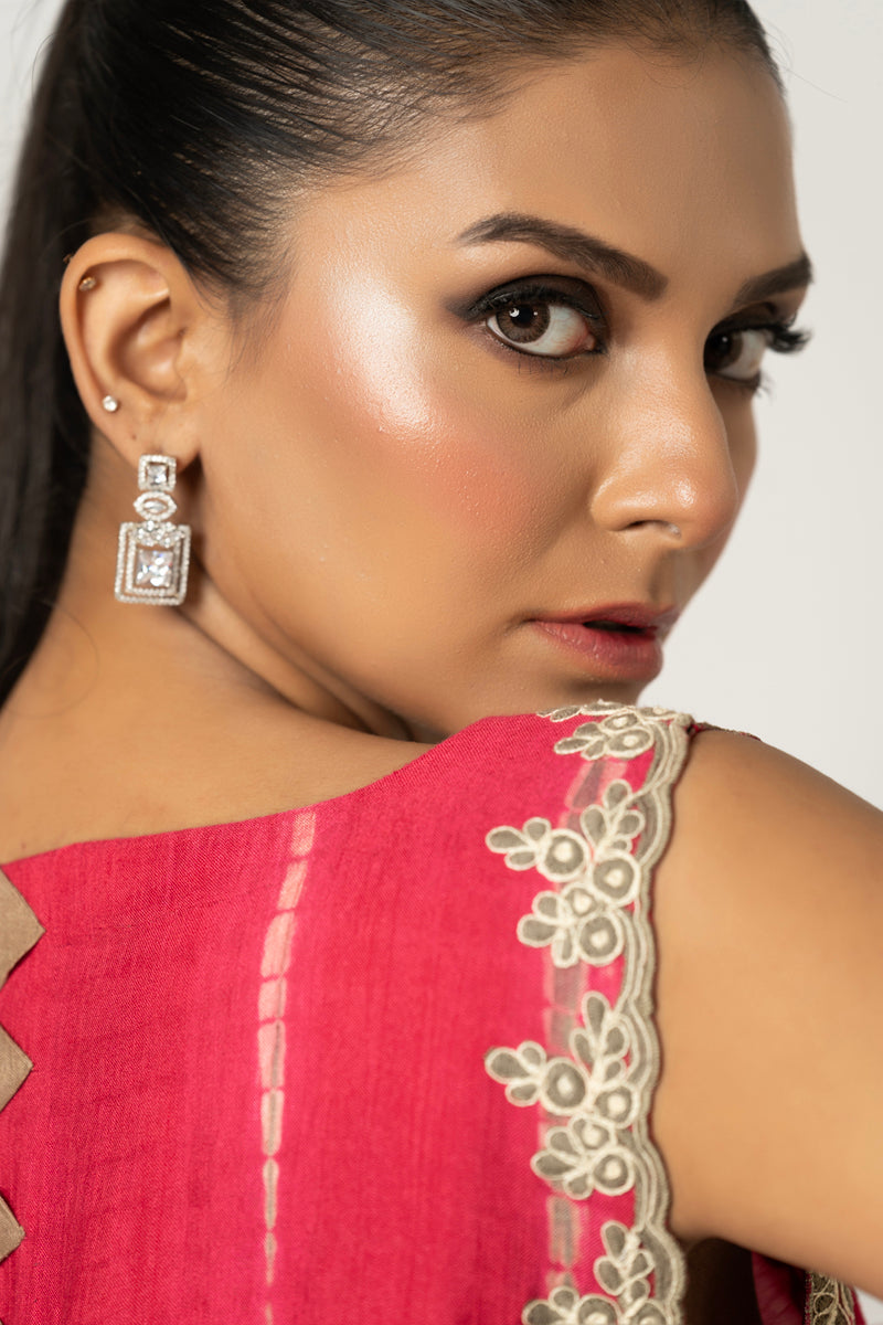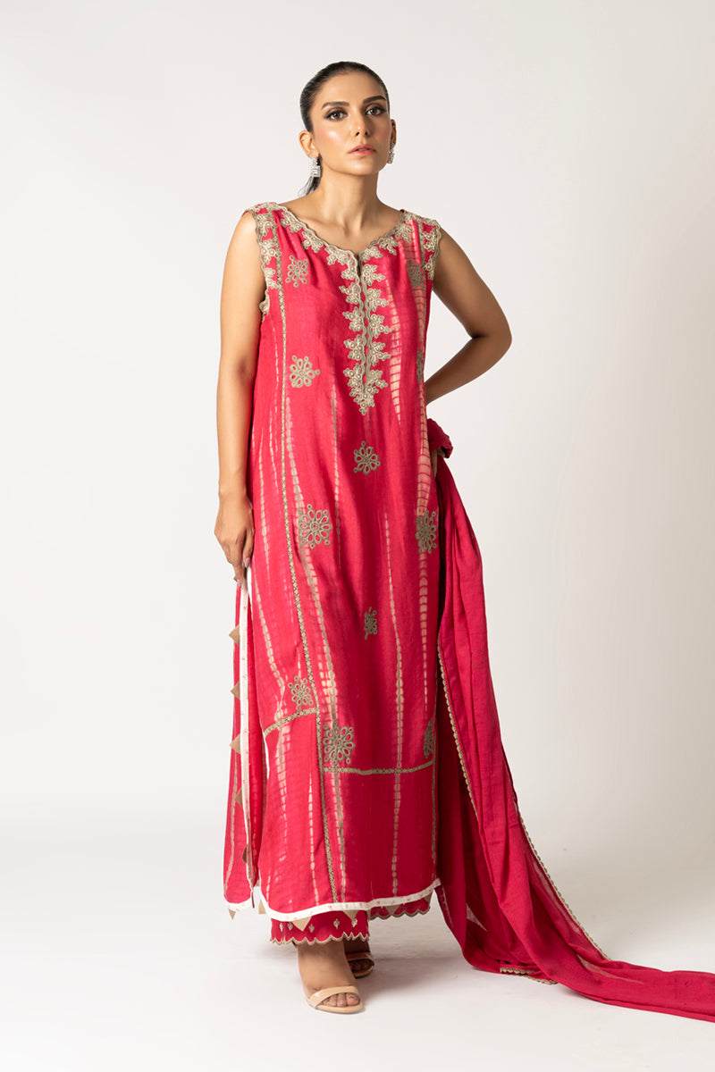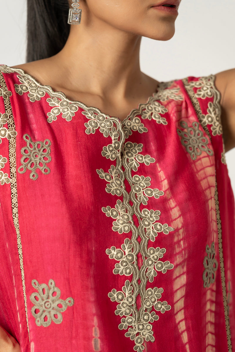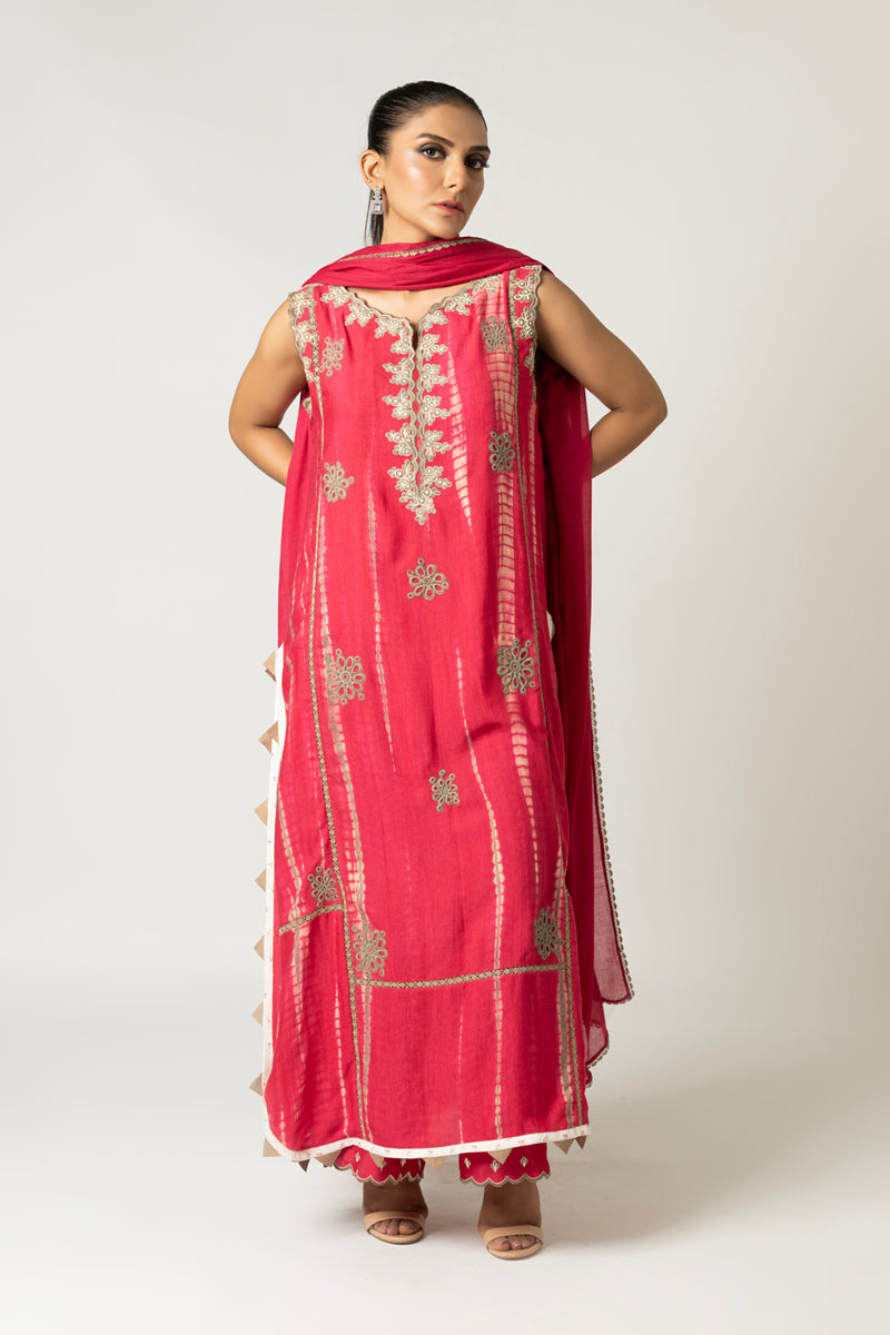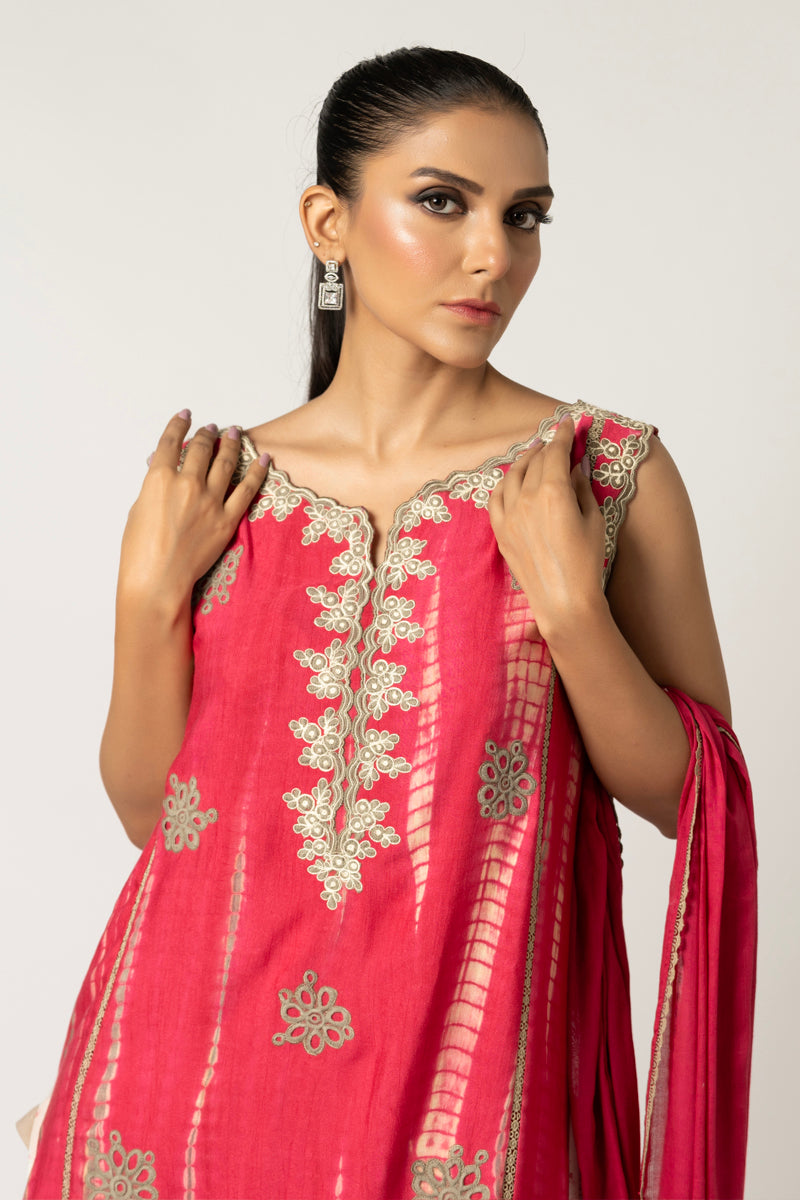 This delightful pink tye & dye outfit, made from soft cotton net, features a beautifully embroidered shirt complemented by a matching dupatta. With intricate appliqué details, it’s a charming choice for any occasion where you want to stand out.