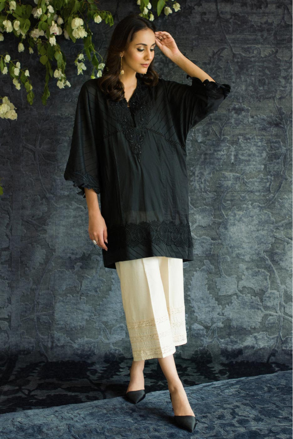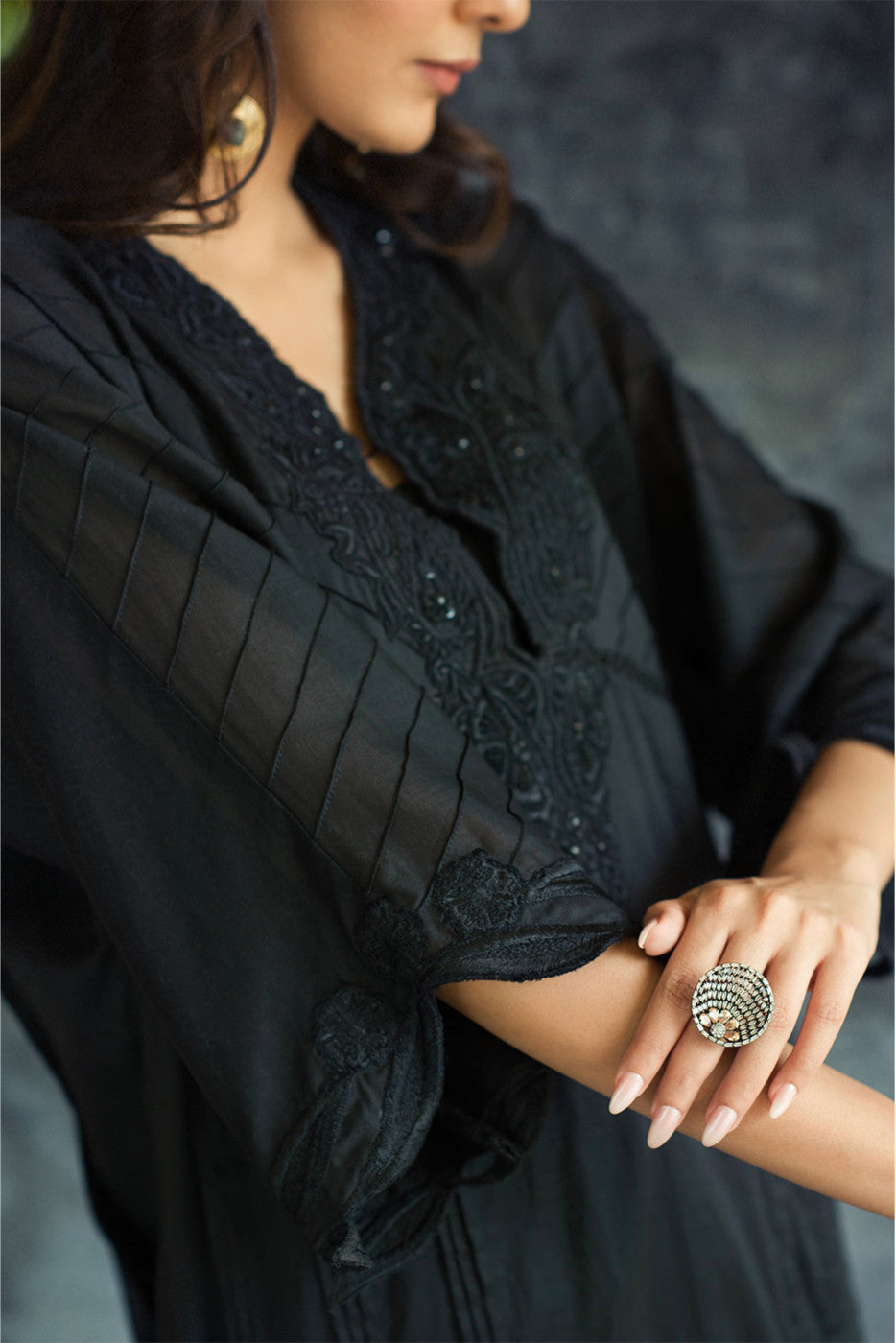 Black pleated tunic and embroidered neckline, embroidered sleeves and detailed back.Care Instructions