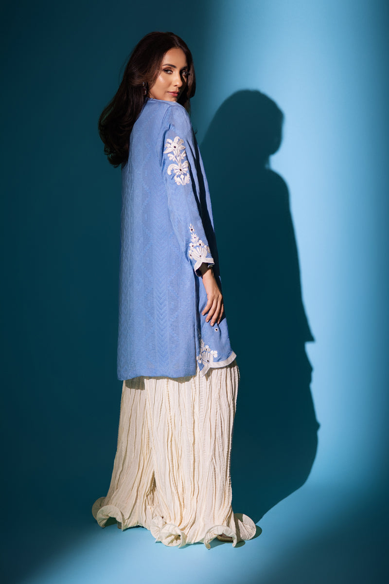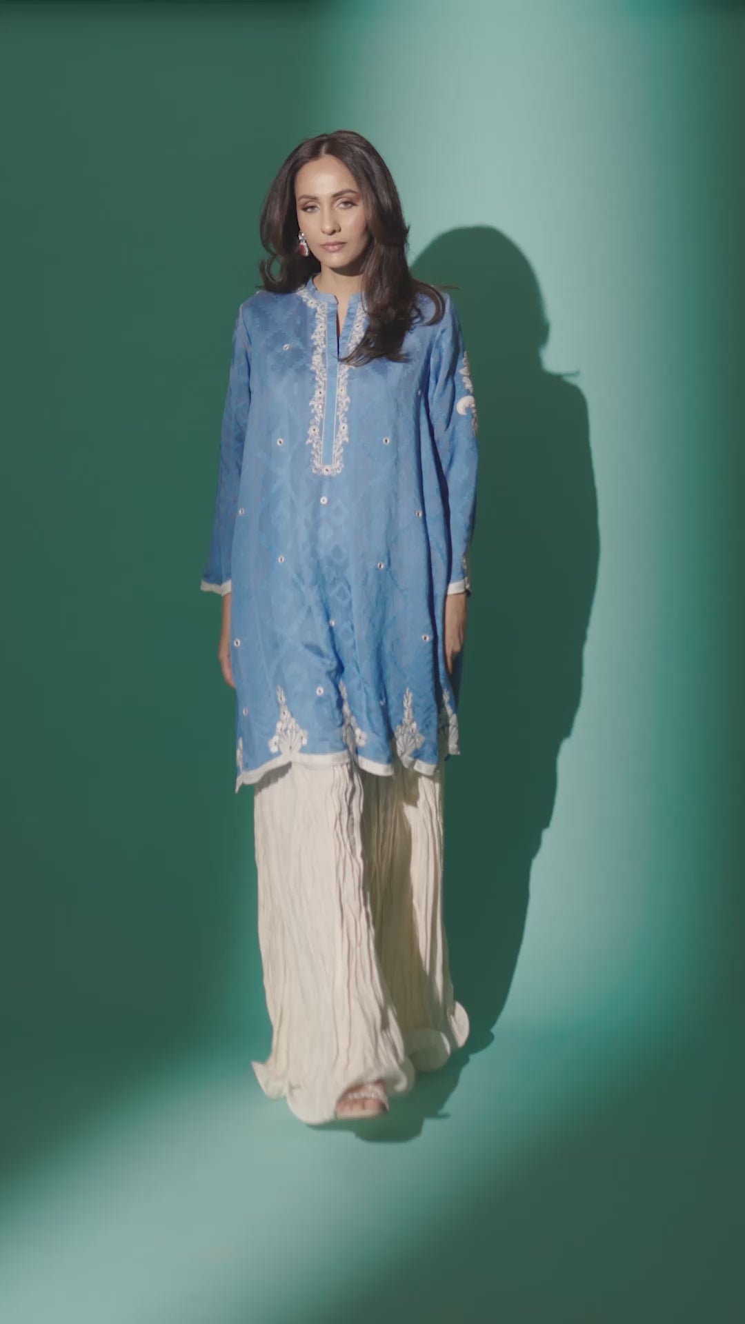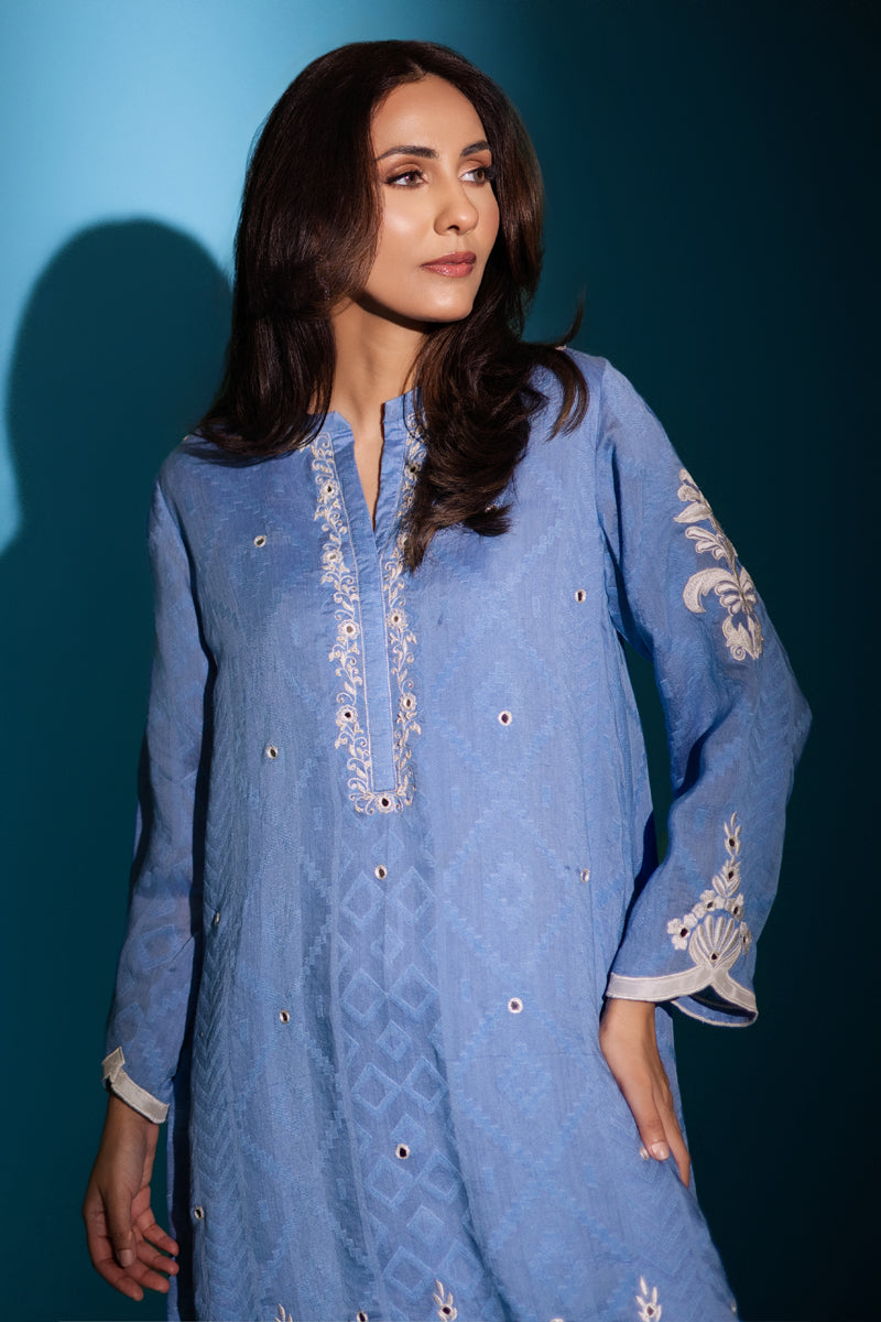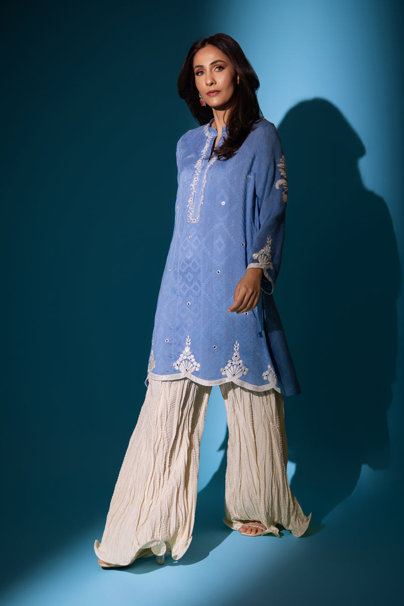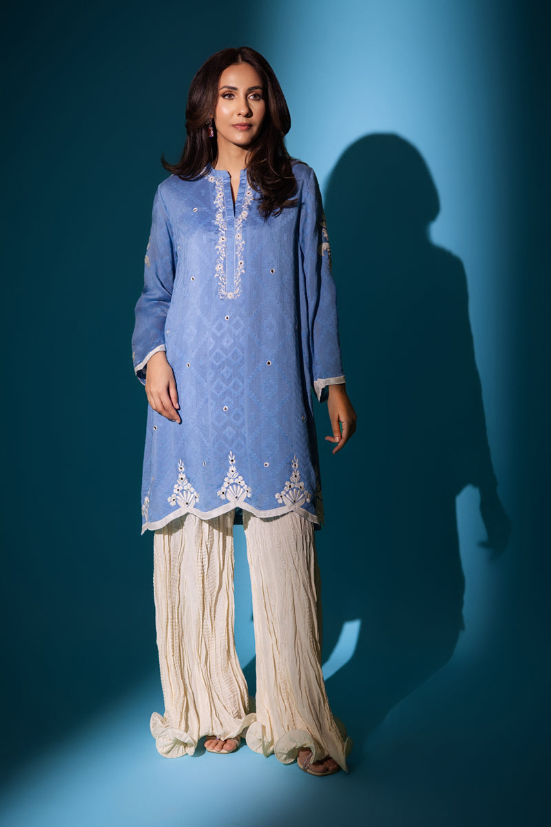 A short kurta intricate hand embroidered in resham and mirror work. Pair it with crushed pants.Care Instructions
