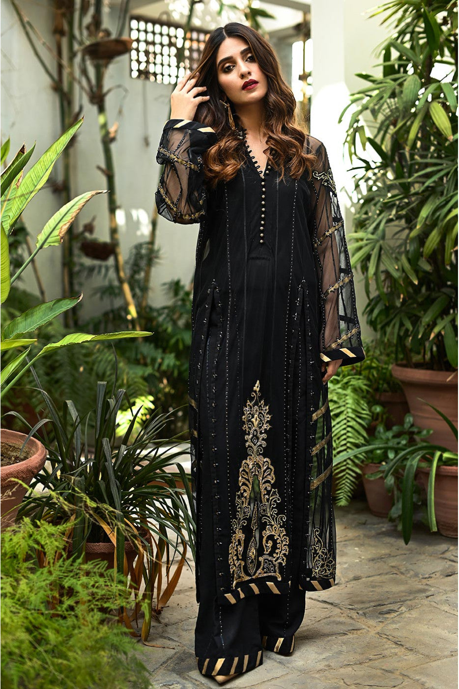 Black net kurta with heavy embroidery in gold sequins beads and cut dana. Includes pants and camisole.Care Instructions
