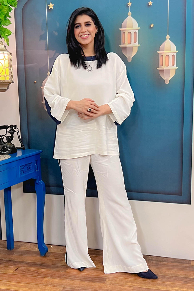 This chic two-piece ensemble blends comfort and sophistication with its premium irish linen fabric. The ivory base is beautifully accented by navy side panels, adding a refined contrast.