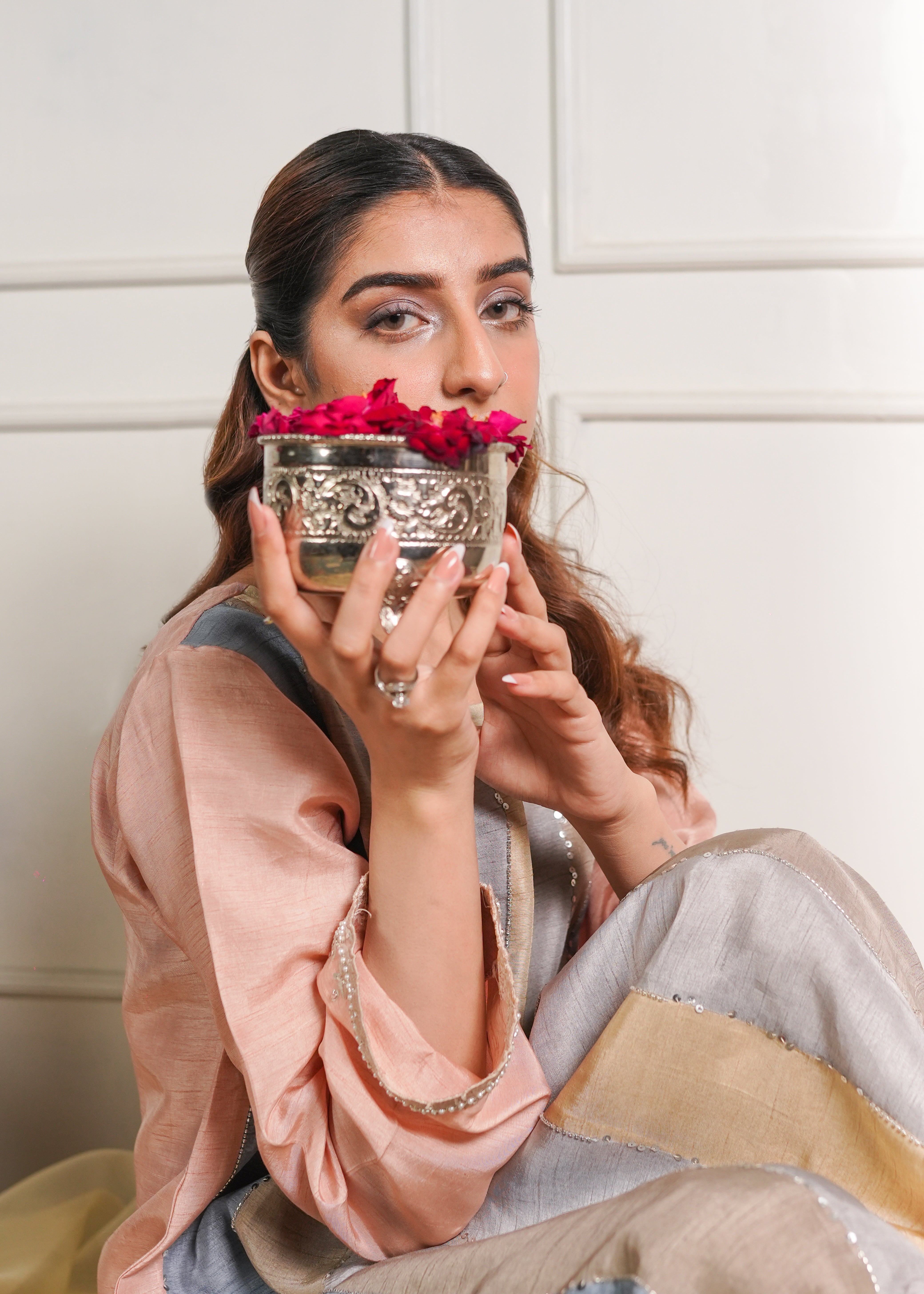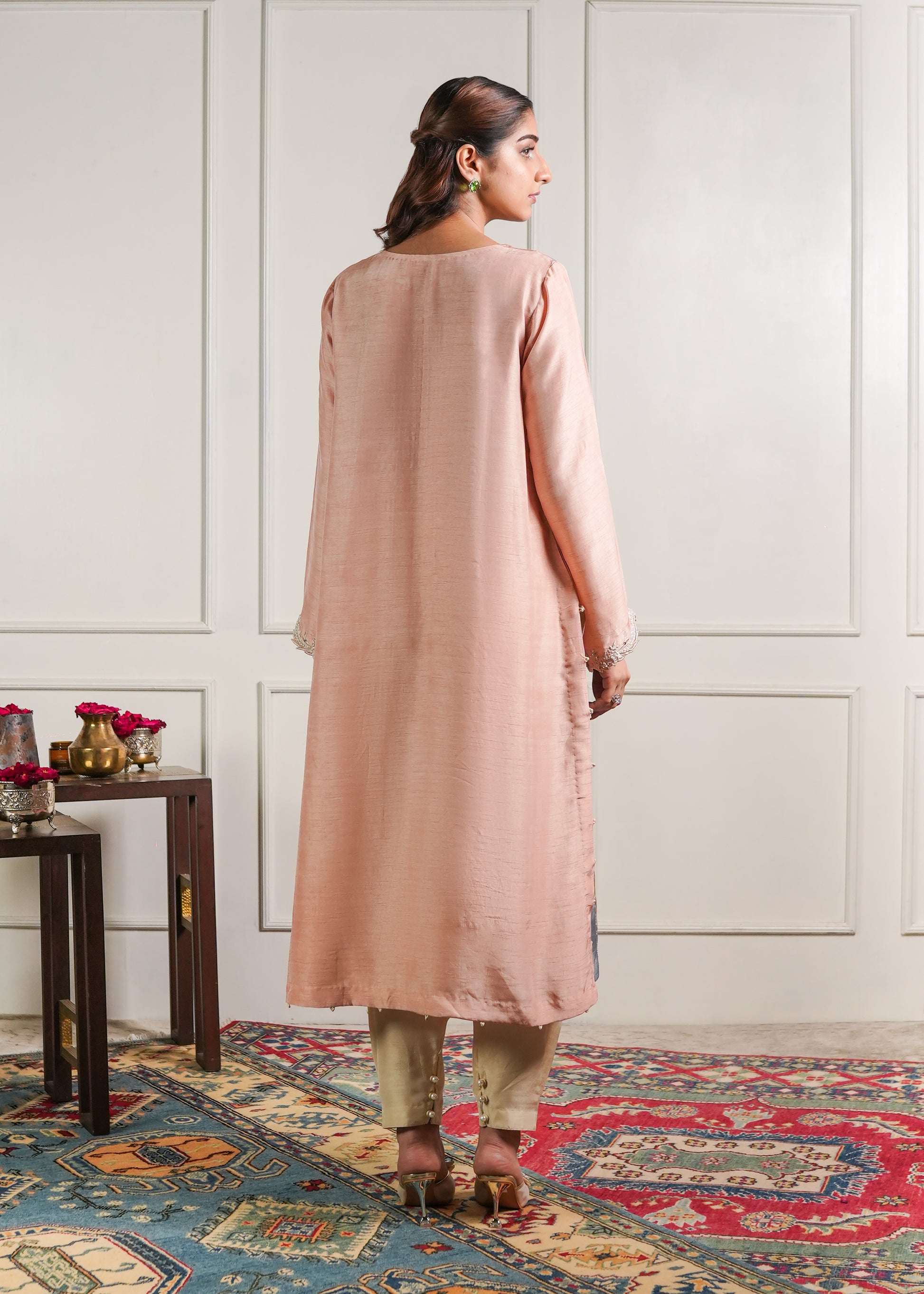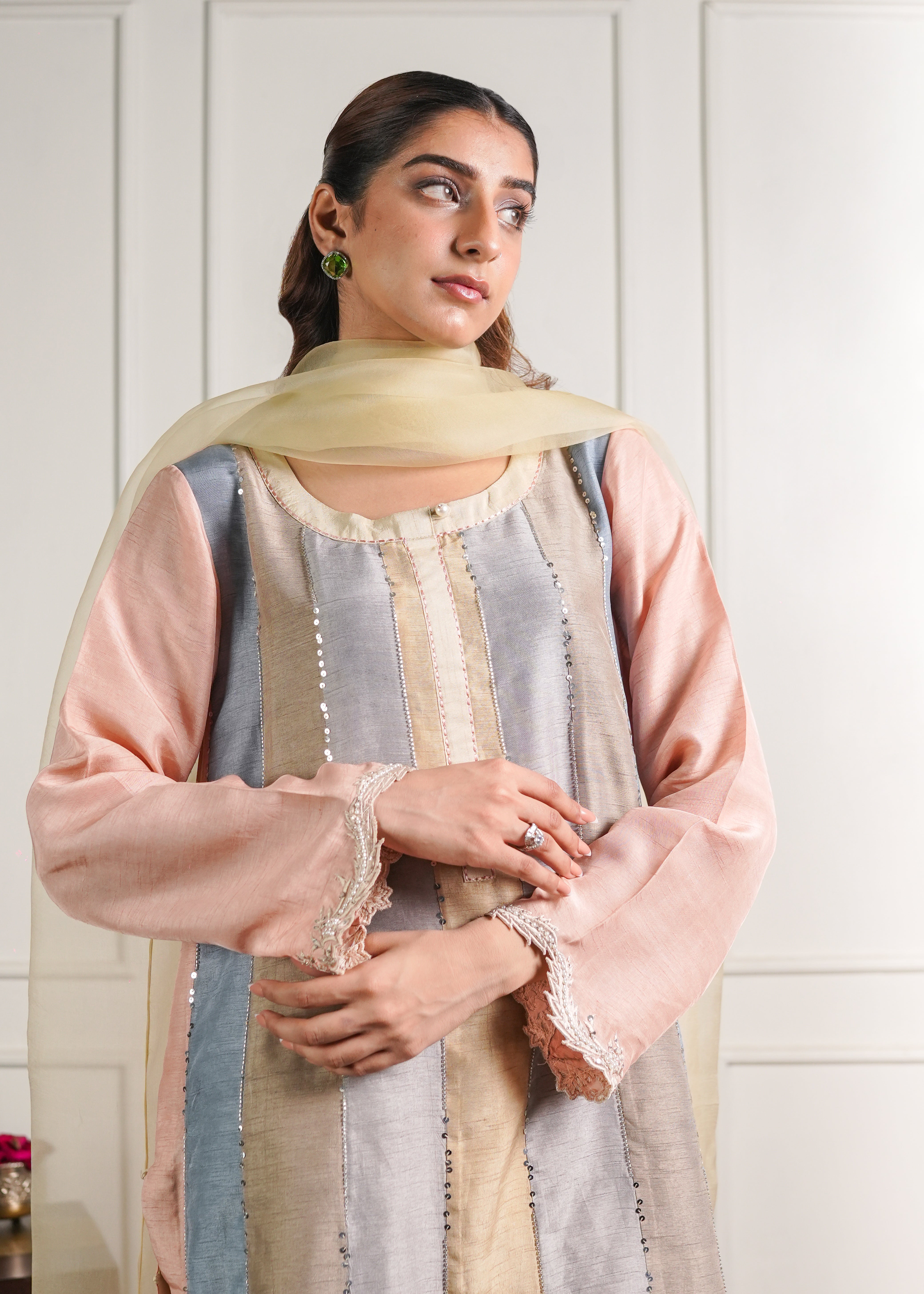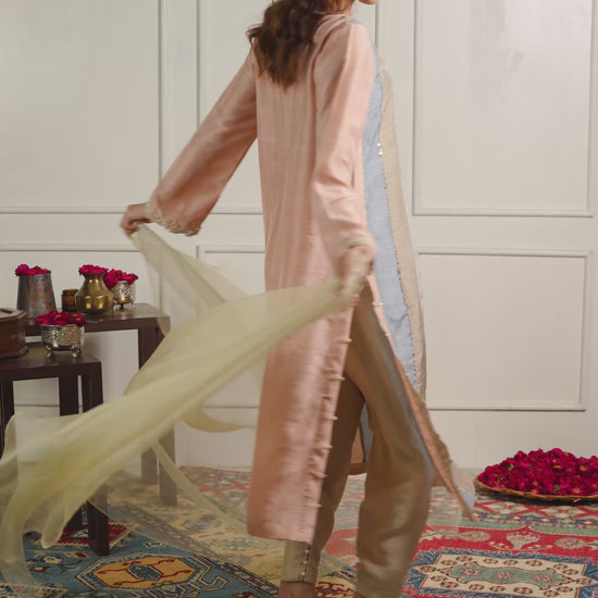 A paneled Chatta pati kurta in soft English pastel tones, designed for refined festive elegance. Hand embellishments highlight the panels, Kurta patti neckline, and delicately detailed hand embellished sleeves. Paired with a classic khari shalwar for a graceful traditional silhouette. Paired with a pure organza dupatta for a soft, airy finish