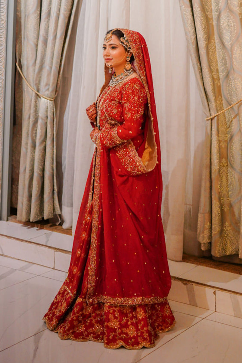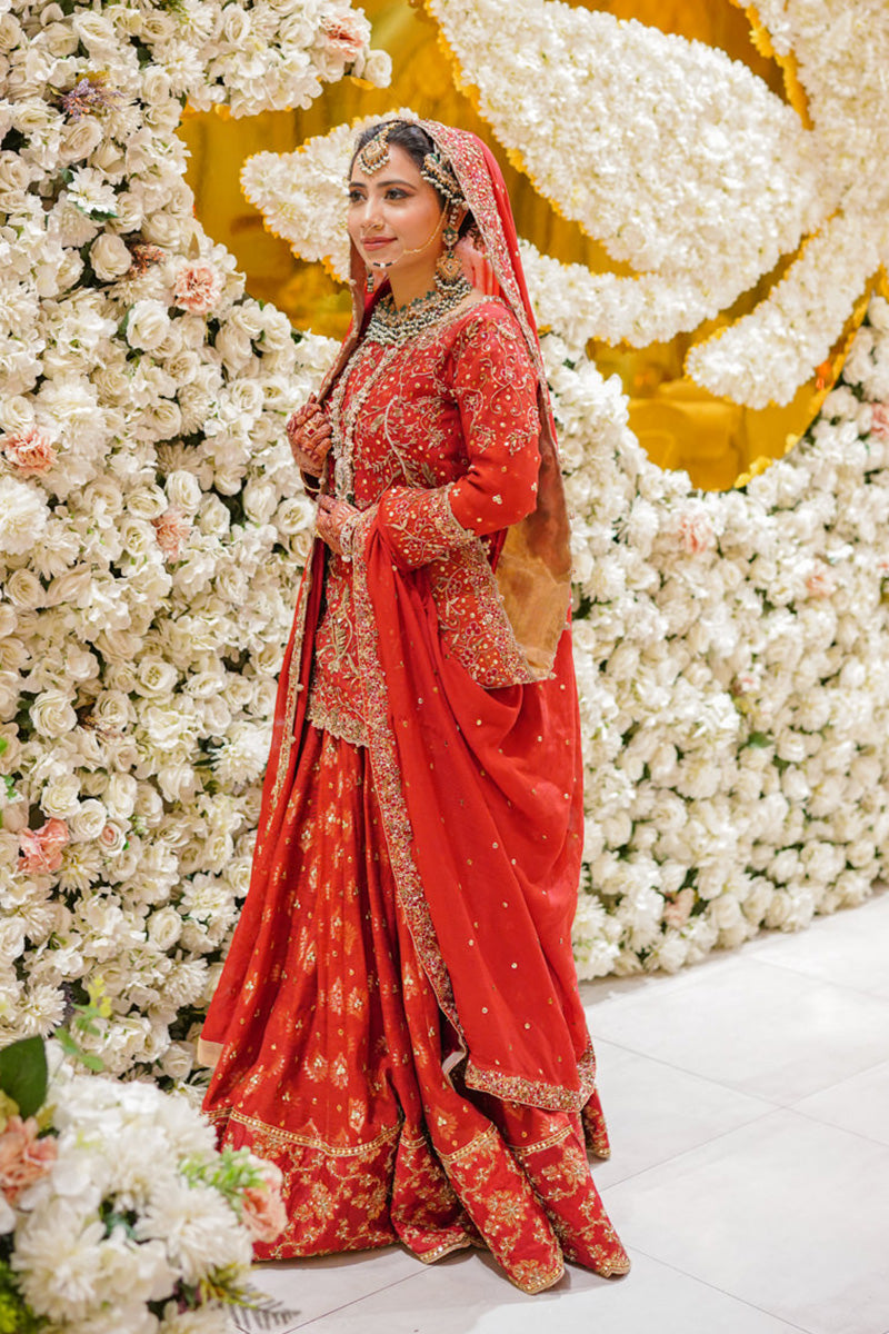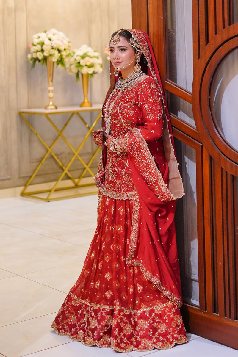 Adorn yourself in elegance with this exquisite bridal ensemble, featuring a short kurta crafted from pure silk net, perfectly paired with a flowing lehenga in pure chiffon. Complete the look with a 3.5-yard dupatta of pure Bottie chiffon, adding grace and charm to your special day. Indulge in timeless beauty and sophistication with this captivating bridal attire.Shirt: Pure Silk Net