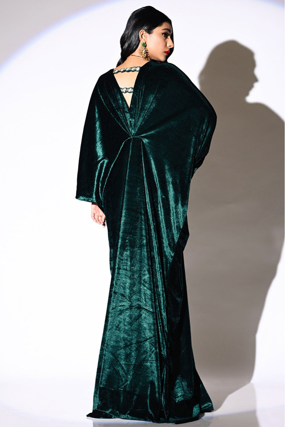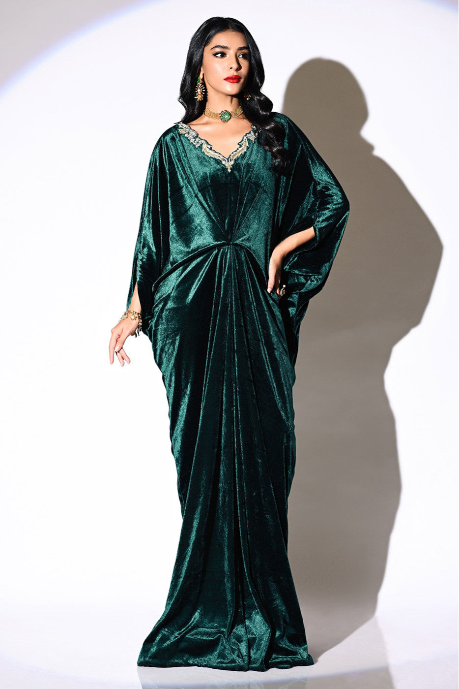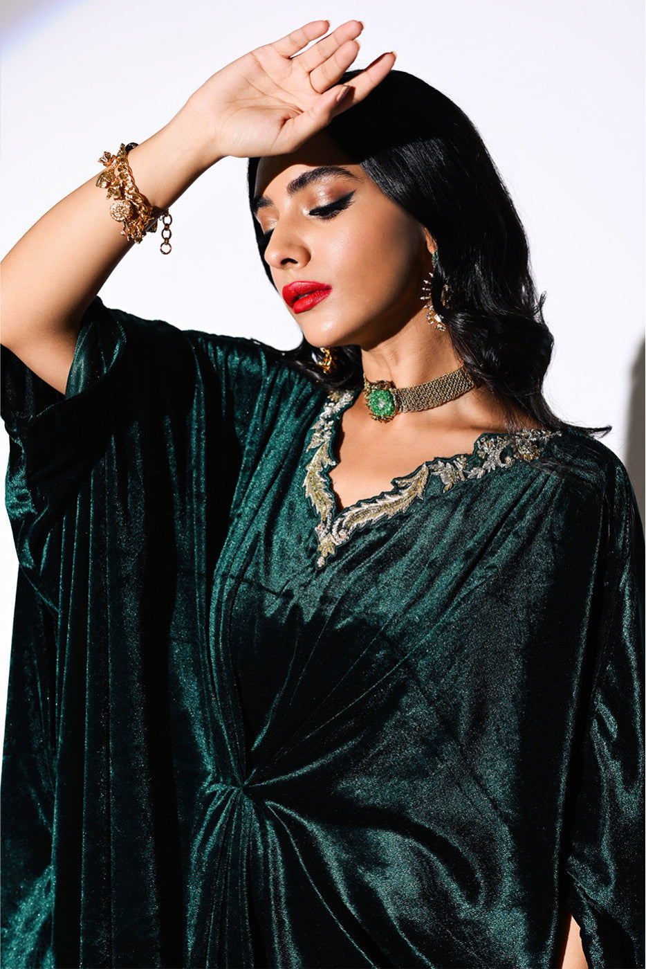A traditional investment piece to add to your festive wardrobe. Velvet kaftan with heavy embellished neckline on front and back.