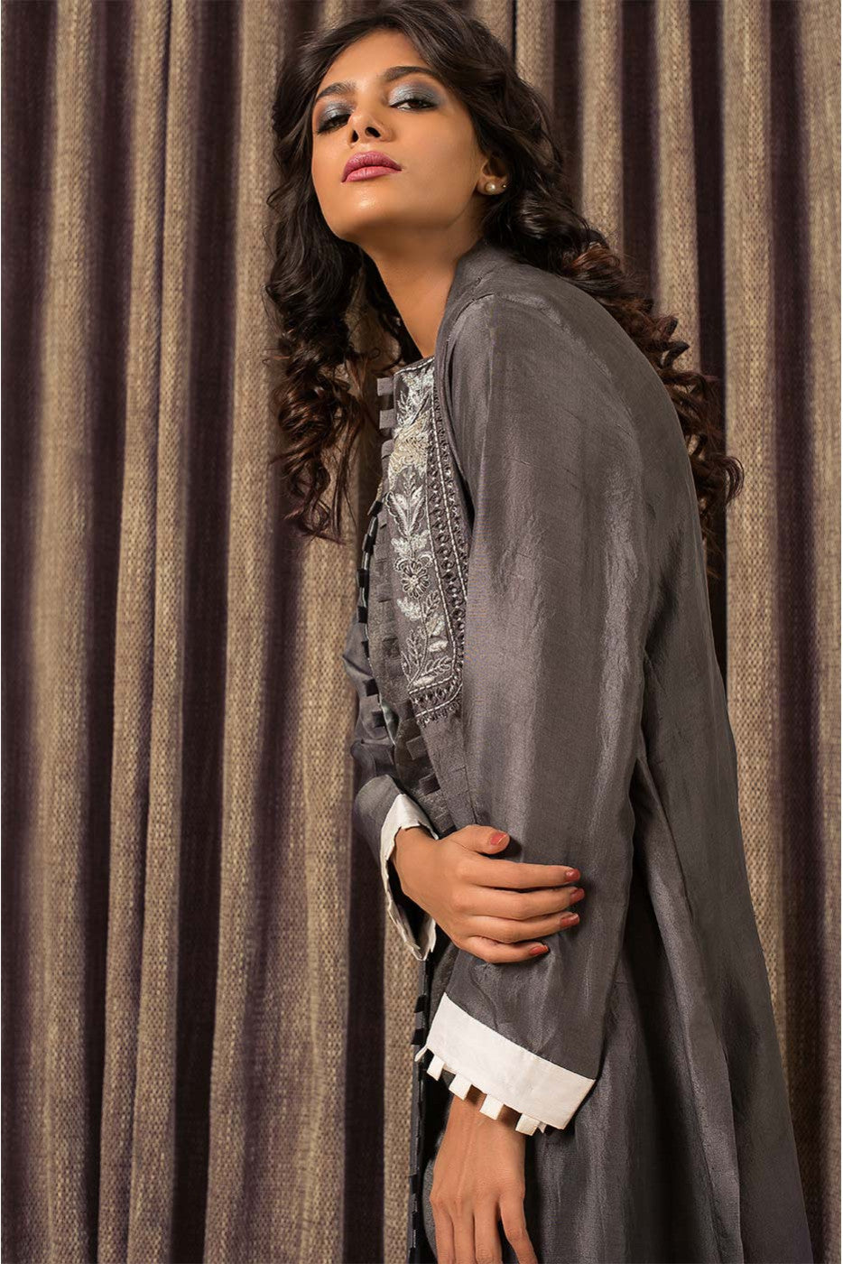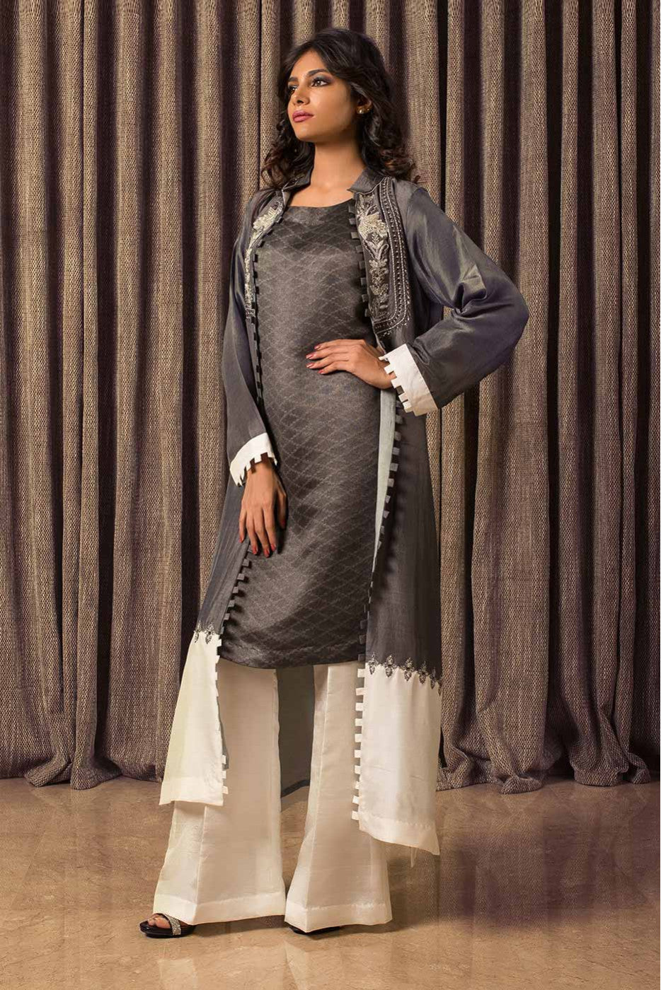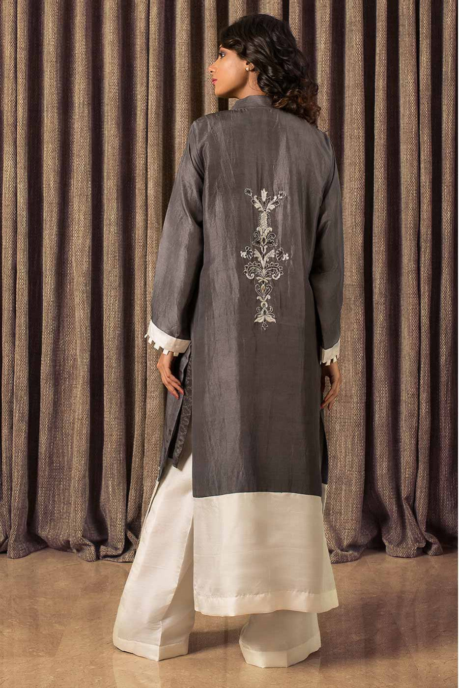 Pure 80-gram pure silk jacket with embroidered neck patti. The jacket is lined in steel grey and detailed with boxes and embroidered back. Comes with checkered camisole and trousers.