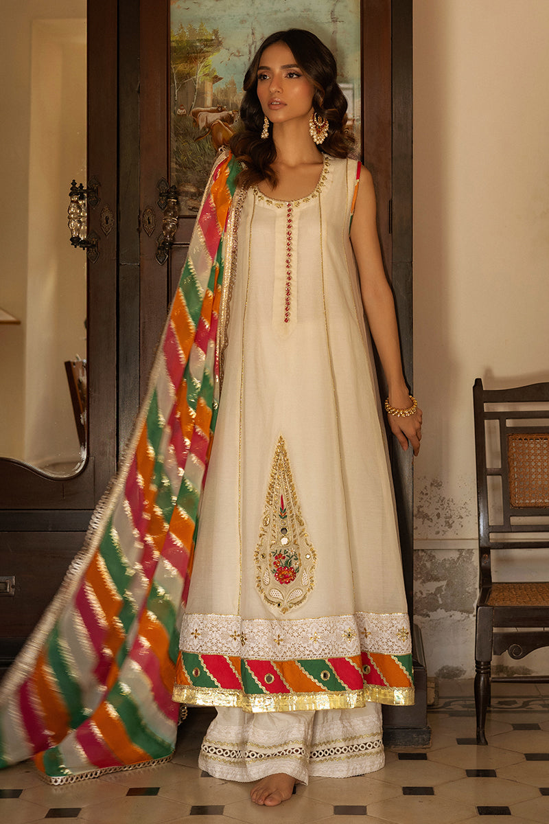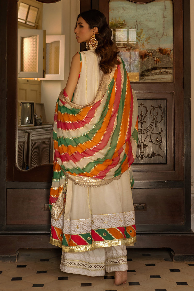 Introducing a chic 5-panel shirt featuring traditional chatta patti design in luxurious khaddar silk. Comes with the 3 coloured dupatta. Paired elegantly with wide-legged culottes, adorned with intricate lace detailing, this ensemble is a perfect blend of modern style and ethnic charm. Elevate your fashion statement with this sophisticated combination, ideal for both casual and festive occasions. Includes izzar and dupatta.